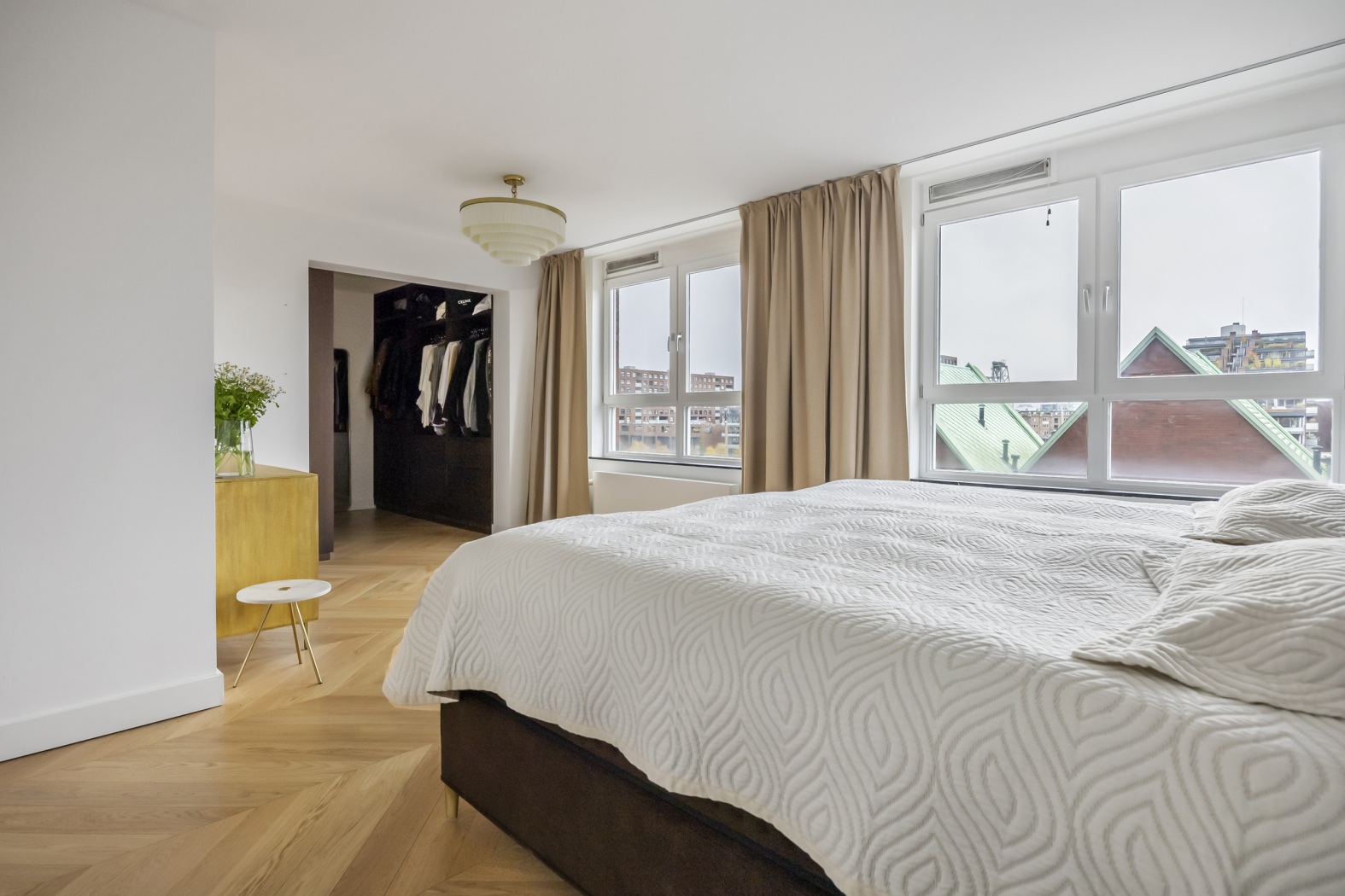 De master bedroom van circa 28 m² is een ware privésuite: ruim, licht en ontworpen met oog voor comfort en rust. De kamer beschikt over een elegante inbouwkast (walk-in closet) met geïntegreerde LED-verlichting, die zorgt voor een warme, stijlvolle gloed. Vanuit de slaapkamer heeft u directe toegang tot de eigen badkamer van circa 5,4 m², voorzien van een riante regendouche, dubbele wastafel en vloerverwarming – een perfecte plek om de dag ontspannen te beginnen of in alle rust af te sluiten.