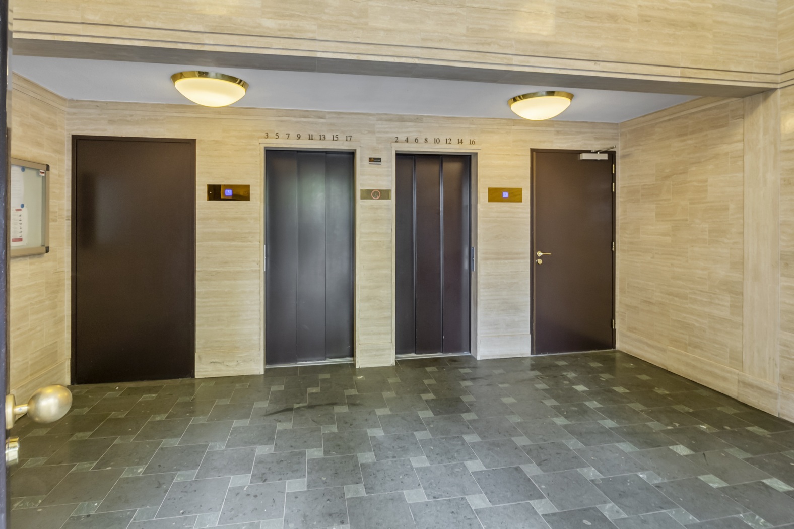 Bij aankomst op de begane grond betreedt u de verzorgde centrale hal met brievenbussen en bellentableau. Vanuit hier heeft u direct toegang tot de afgesloten parkeergarage en de privéberging. De woning zelf is bereikbaar via de lift, die u comfortabel naar de vierde verdieping brengt.