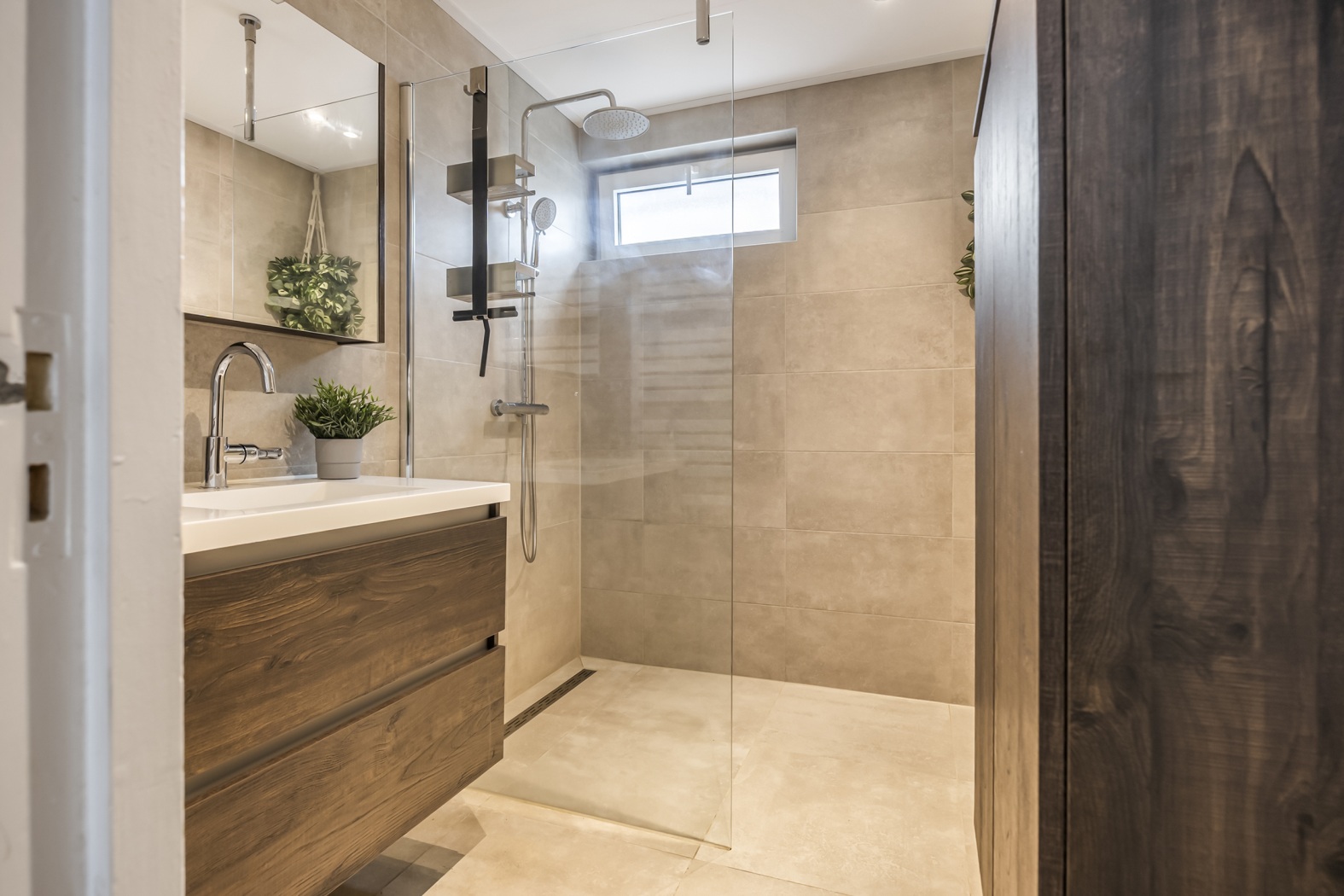 •Moderne badkamer voorzien van inloopdouche en stijlvol wastafelmeubel