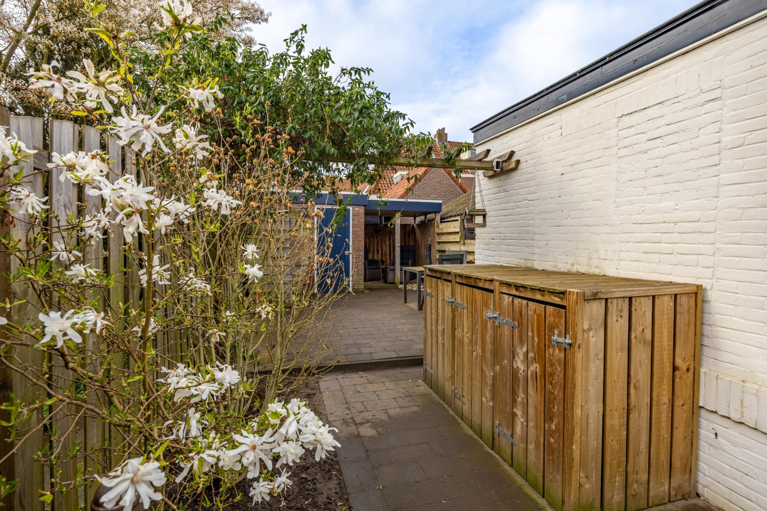 De ruime, beschutte tuin op het zonnige zuiden is een heerlijke plek om te ontspannen en volop van de zon te genieten. Dankzij de privacy biedende schuttingen ervaar je hier rust en vrijheid. De zijtuin en achtergelegen brandgang behoren kadastraal tot de woning. Voor de bewoners van huisnummers 13 en 15 geldt een recht van overpad. Om deze doorgang te waarborgen, zijn de schuttingen iets teruggeplaatst. Achterin de tuin vind je een stenen fietsenberging met overkapping en daarnaast nog een extra berging – ideaal voor opslag of hobbyruimte.