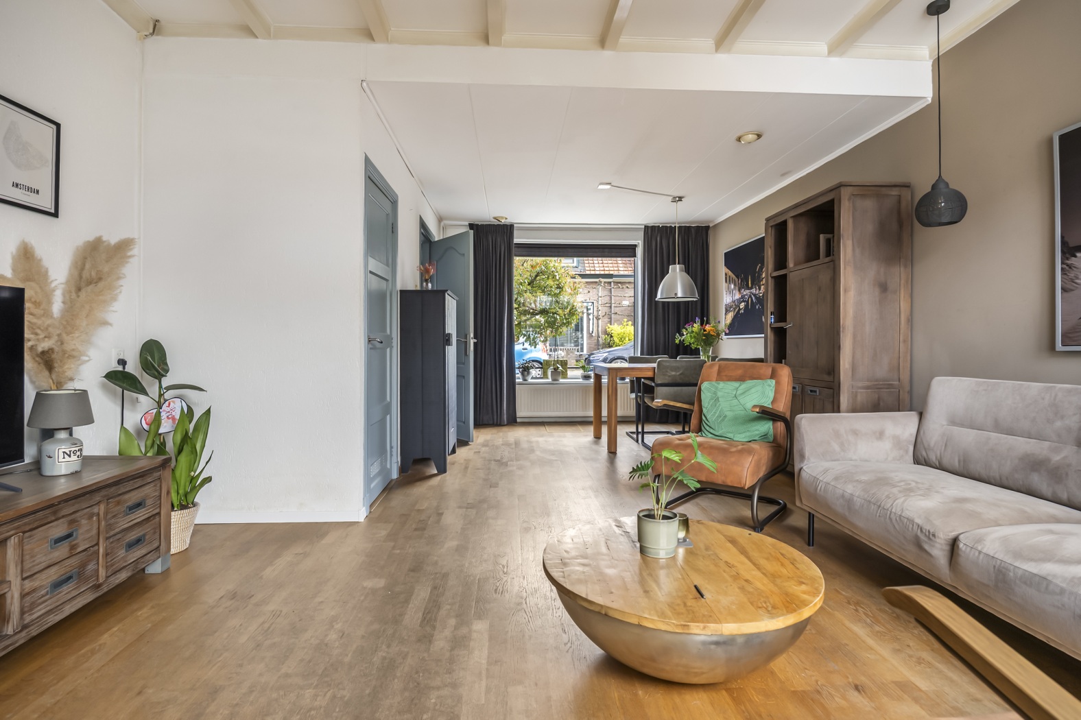 De woonkamer (ca. 29 m²) is een sfeervolle leefruimte waar karakter en comfort samenkomen. De warme parketvloer, het balkenplafond en de authentieke paneeldeuren zorgen voor een gezellige, jaren ’30 uitstraling. Grote raampartijen aan de voorzijde en een aluminium schuifpui aan de achterzijde laten het daglicht rijkelijk binnen en verbinden de ruimte prachtig met de tuin. Praktisch is de aanwezige trapkast voor extra bergruimte.