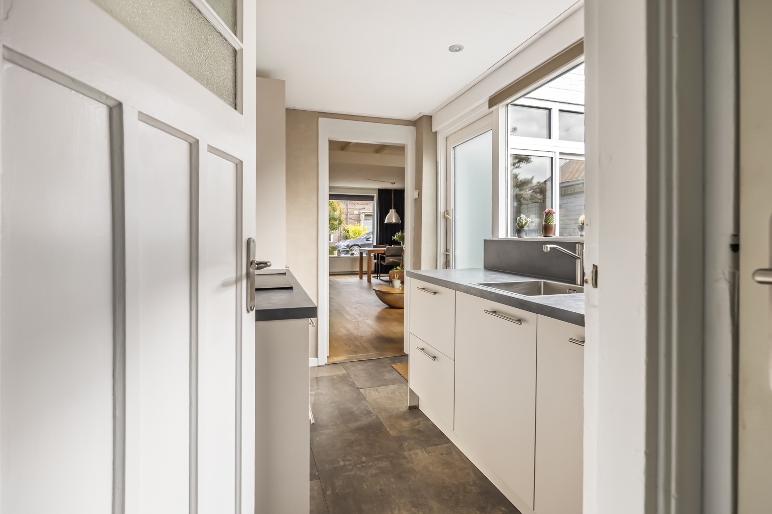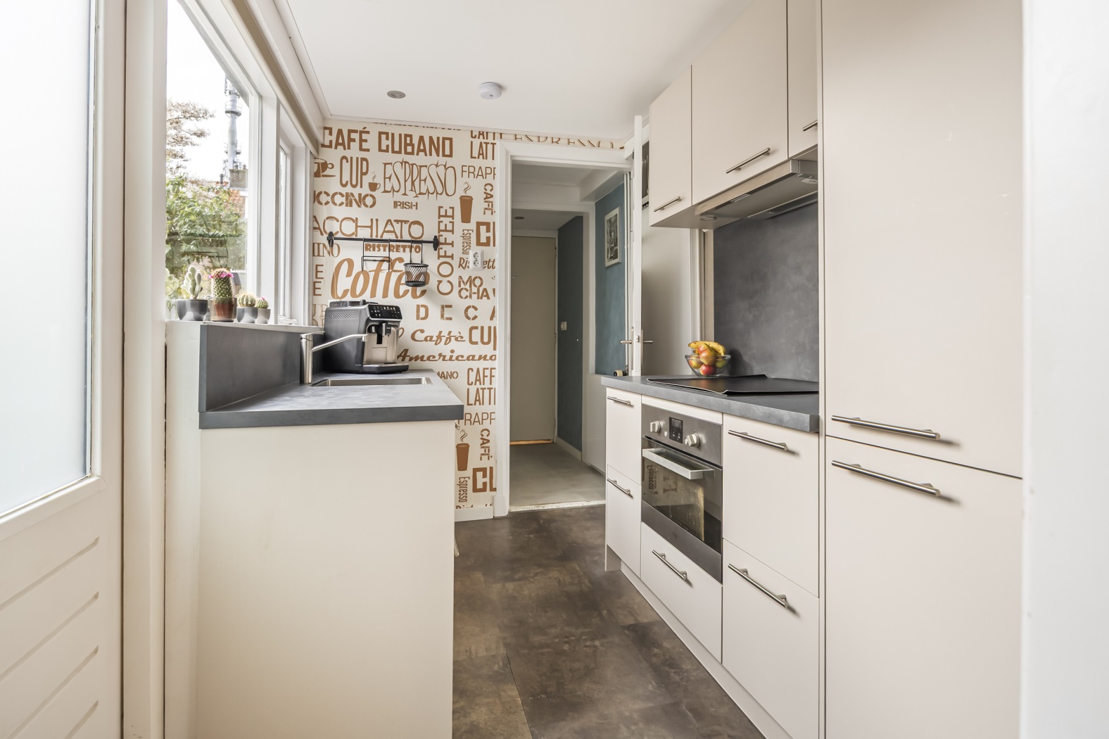 In de aanbouw bevindt zich de gezellige keuken (ca. 6 m²), uitgevoerd in een moderne parallel opstelling met lichte fronten en voorzien van diverse inbouwapparatuur, waaronder een inductie kookplaat, afzuigkap, combioven, koel-/vriescombinatie en vaatwasser. Via de deur stap je zo de tuin in — ideaal tijdens het koken.
