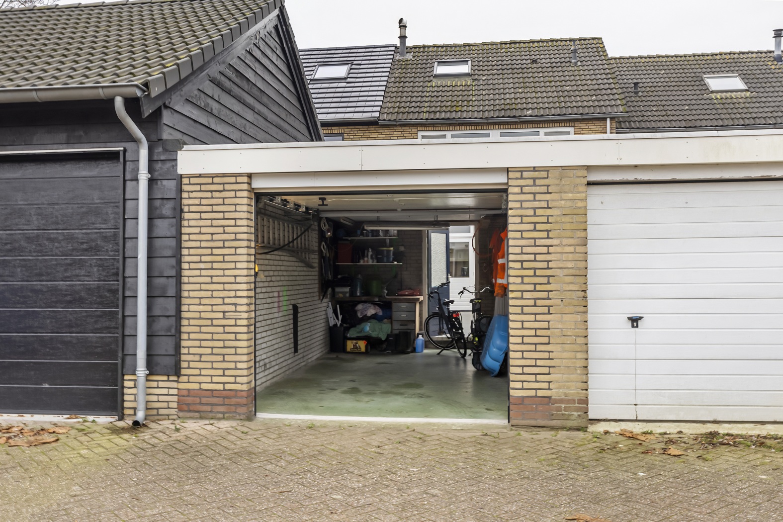 De onderhoudsvriendelijke achtertuin is grotendeels bestraat, ligt op het noorden en biedt volop privacy door de combinatie van schuttingen en muren. Achter in de tuin bevindt zich een loopdeur naar de ca. 20 m² grote garage, die uitkomt op het achtergelegen parkeerplein. Aan de voorzijde is de garage voorzien van een elektrische deur.
