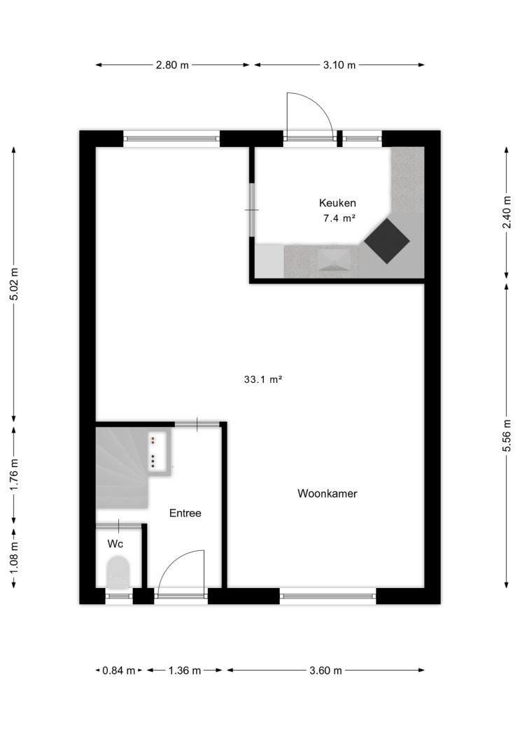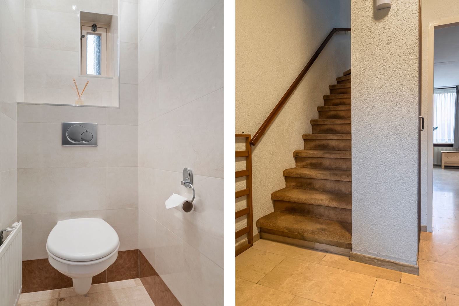 Via de ca. 12 meter diepe voortuin lopen we naar de voordeur met luifel. In de hal heb je direct toegang tot de woonkamer, de toiletruimte, de meterkast en de trapopgang naar de eerste verdieping.