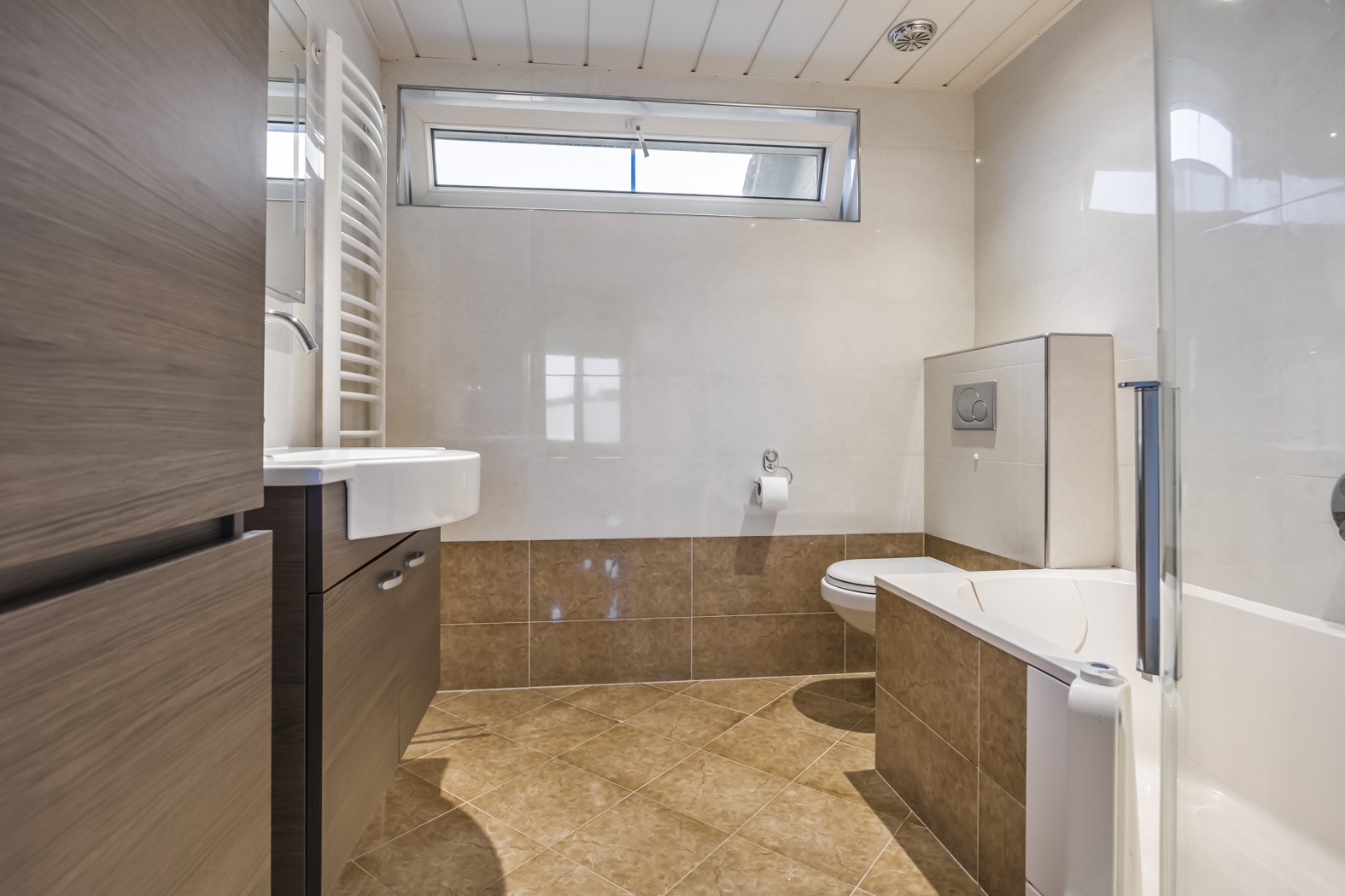 De moderne badkamer is compleet ingericht met een douche-/badcombinatie, een wastafelmeubel, een designradiator en een zwevend toilet. De badkamer is gelegen aan de voorzijde van de woning en beschikt over een raam voor natuurlijke ventilatie en daglicht.