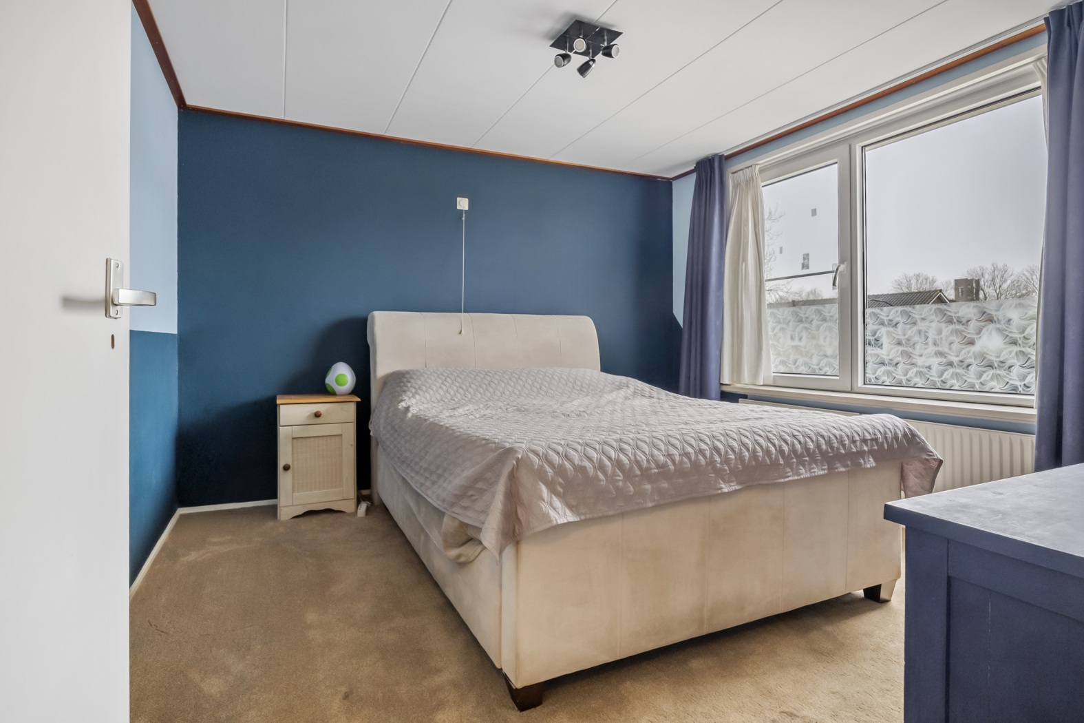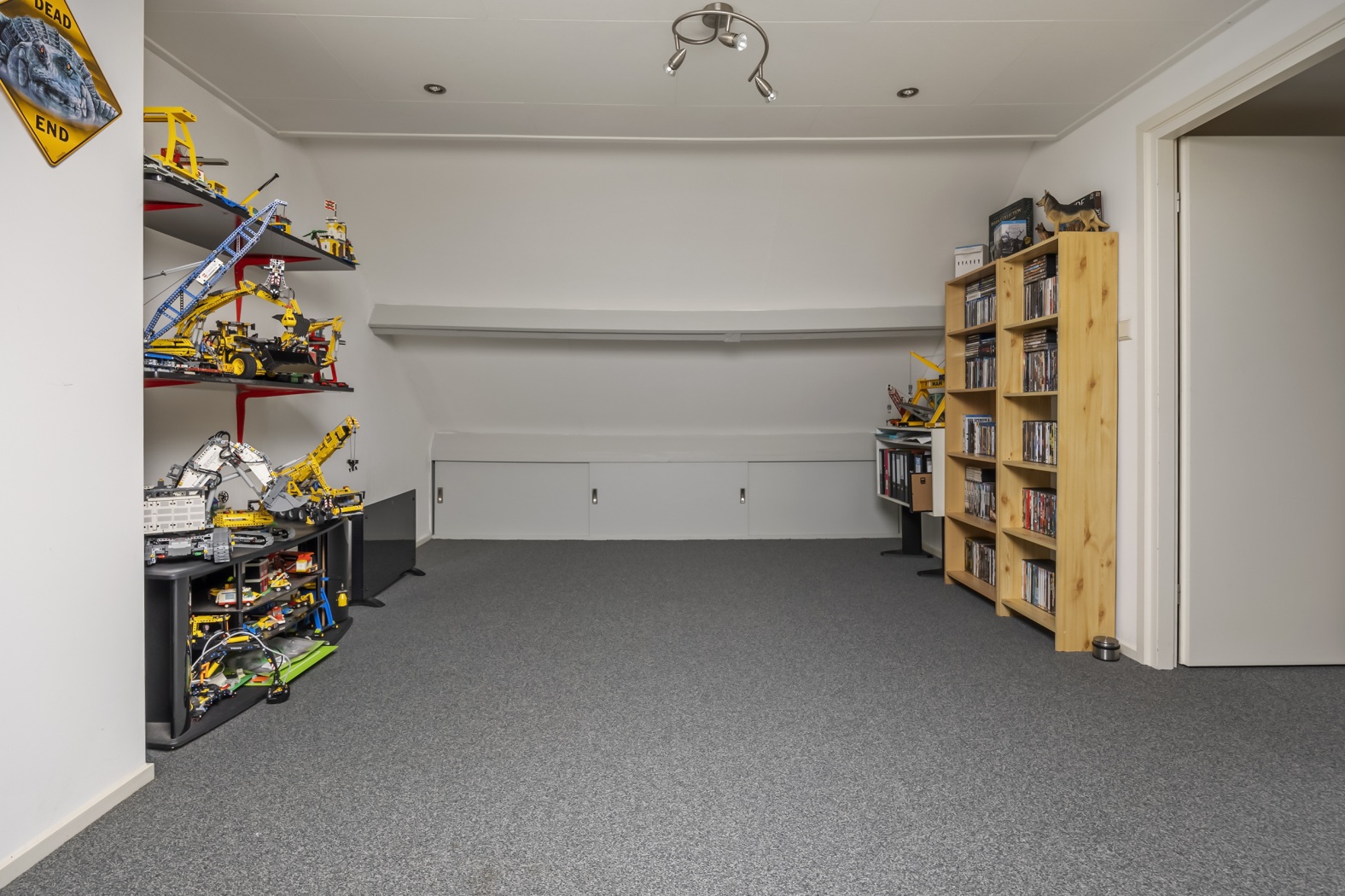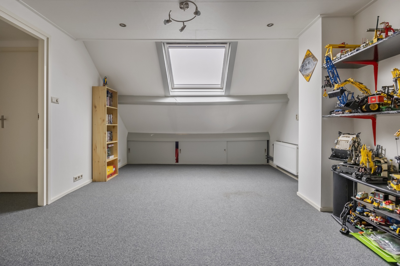 Via een vaste trap is de tweede verdieping bereikbaar. Op de overloop bevinden zich twee bergkasten en de opstelplaats van de cv-installatie. Vanaf hier is er toegang tot een fijne vierde slaapkamer, die ook uitstekend kan dienen als werk- of sportruimte. Het dakraam zorgt voor prettig daglicht en achter de knieschotten is extra bergruimte aanwezig.