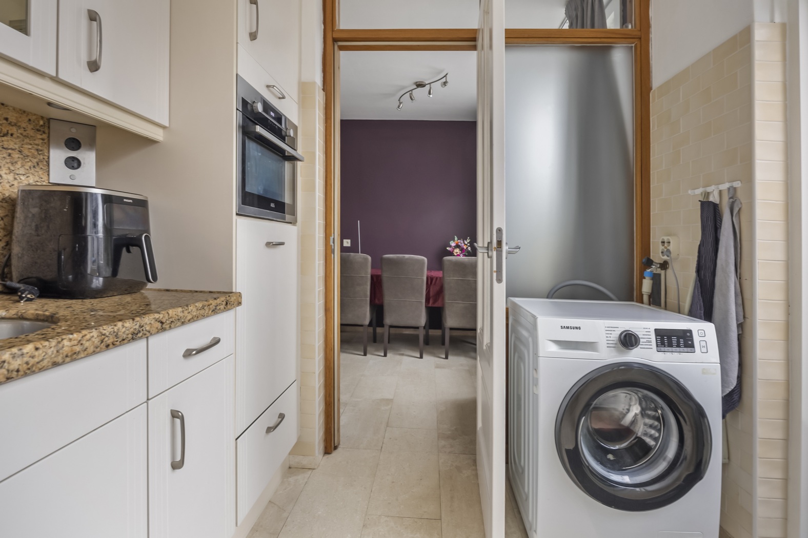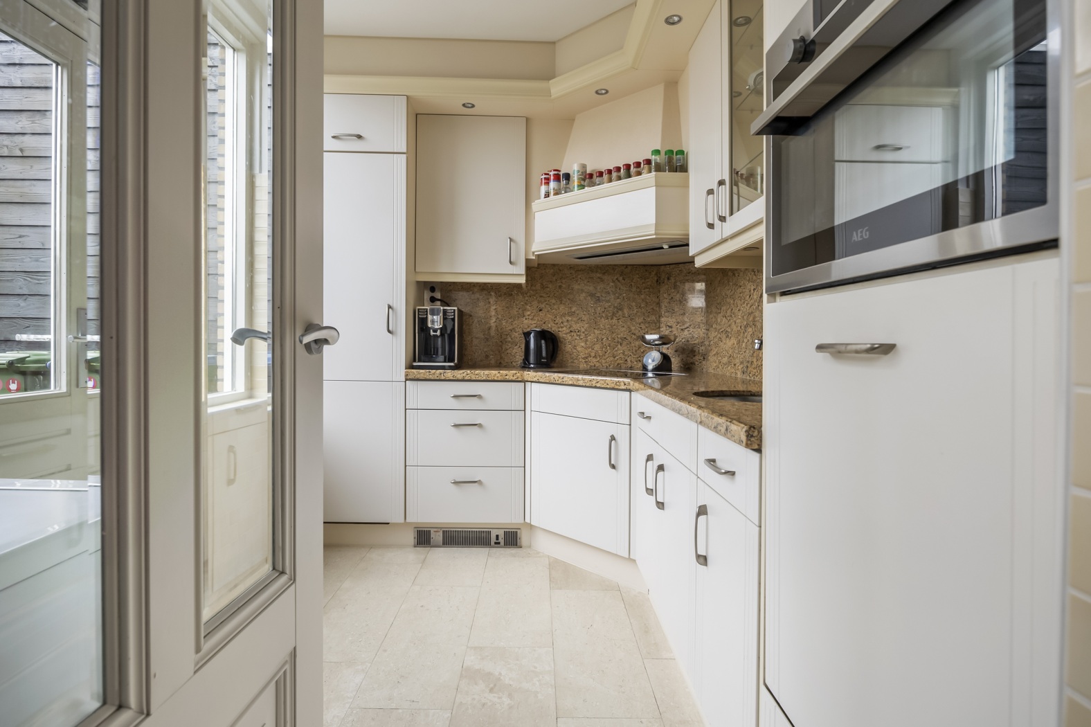 De keuken van ca. 7,4 m² is gelegen aan de achterzijde van de woning en beschikt over een deur naar de tuin. De hoekopgestelde keuken is uitgevoerd met lichte fronten en een marmeren werkblad. Daarnaast is de keuken voorzien van de benodigde inbouwapparatuur, waaronder een inductiekookplaat met afzuigkap in schouw, een combi-oven, koelkast en vaatwasser. Ook bevindt zich hier de aansluiting voor de wasmachine.