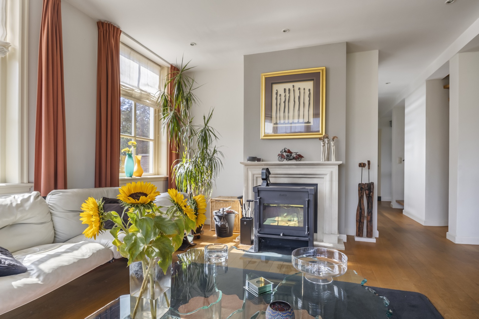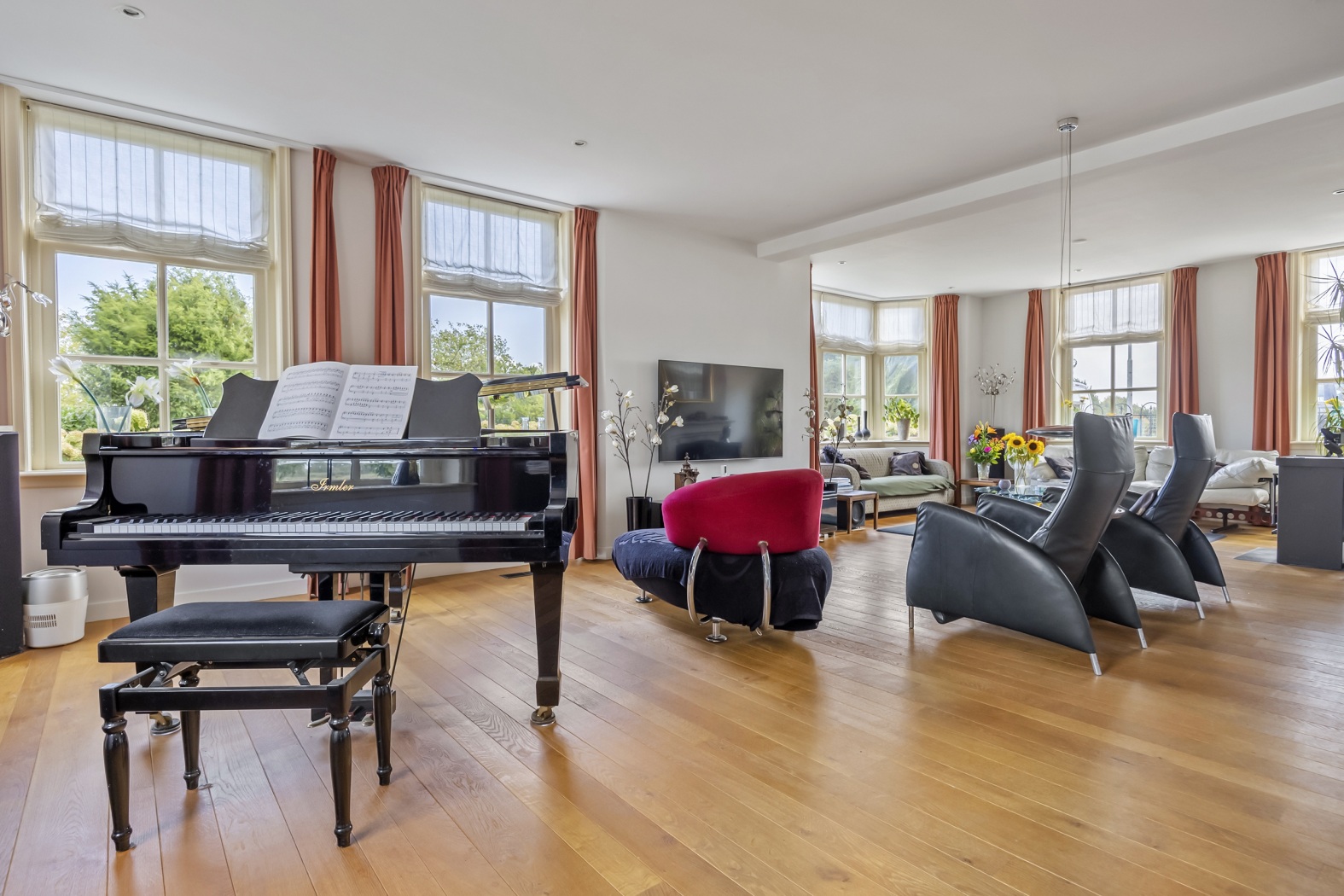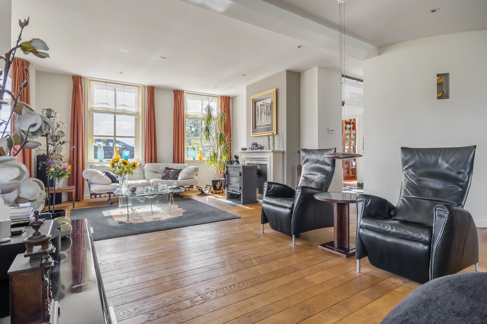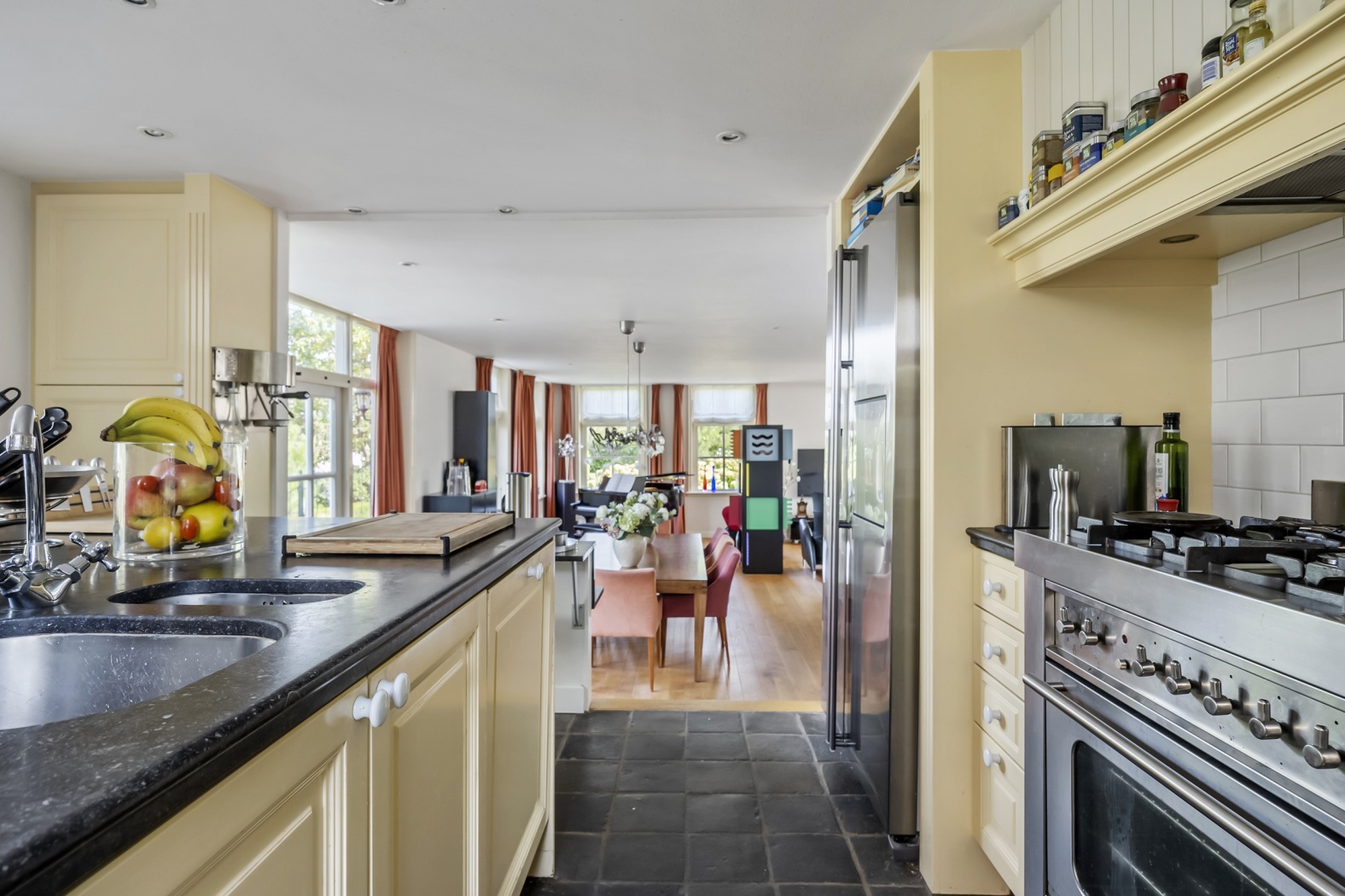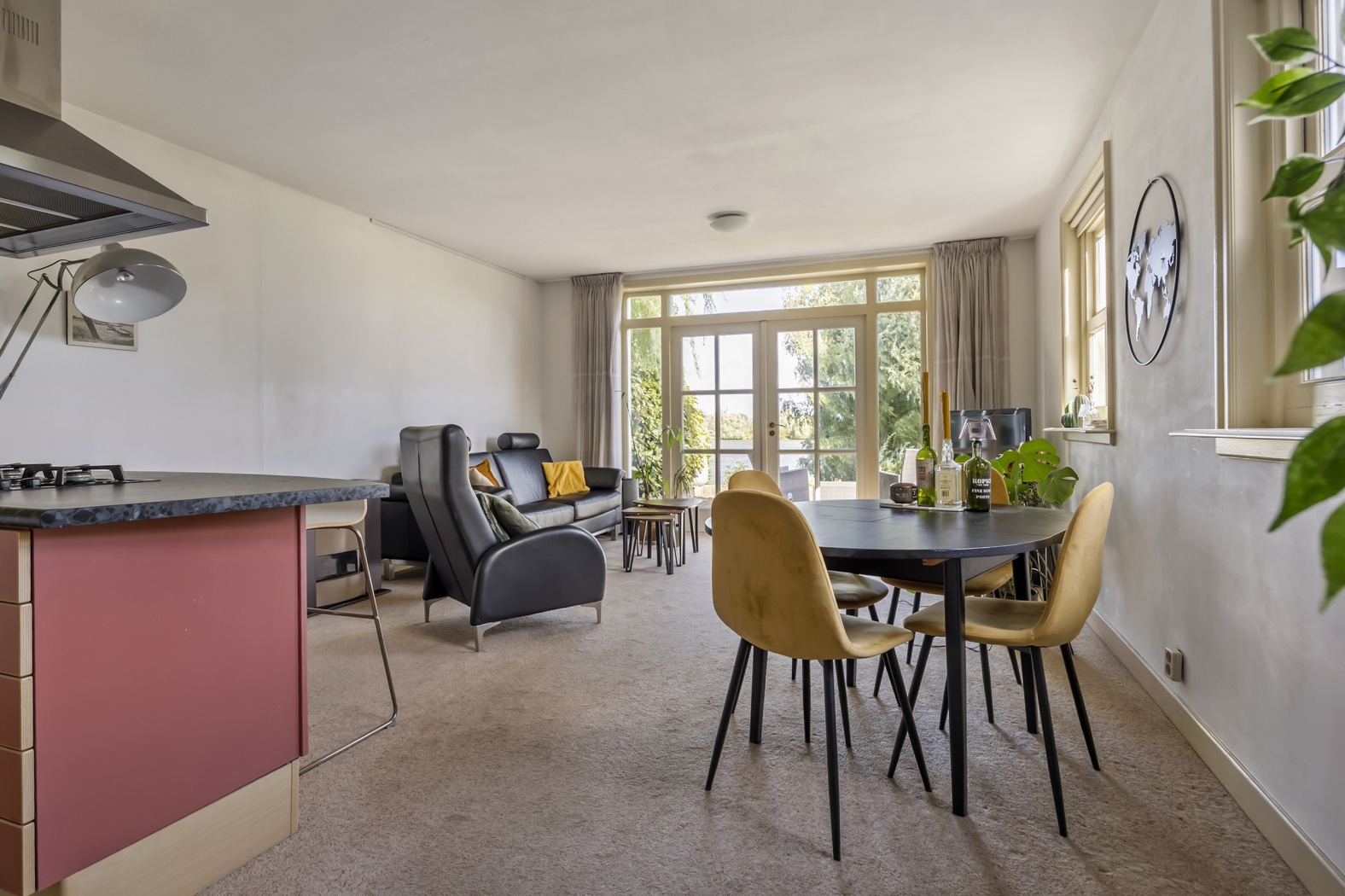 Waar ooit de café-gelagkamer bruiste van kaartspel en biljart, vormt nu het warme hart van het huis. De ruimte baadt in licht dankzij de zesruits ramen en een charmante erker op het oosten. Bij de houtkachel met klassieke haardmantel is het heerlijk zitten, terwijl de ramen aan de achterzijde een betoverend uitzicht bieden op de rivier. Precies daar staat de piano – alsof het panorama een muzikale omlijsting verdient. De eettafel staat centraal voor de dubbele tuindeuren, met een wonderschoon uitzicht over de rivier en directe toegang tot terras en tuin. Aangrenzend ligt de keuken met een speels barretje en twee krukken – perfect voor een snelle koffie of een hap tussendoor. Een klein niveauverschil geeft de ruimte karakter, terwijl de halfronde wand van het trappenhuis met nisjes een moderne touch toevoegt. De warme parketvloer maakt het geheel compleet.