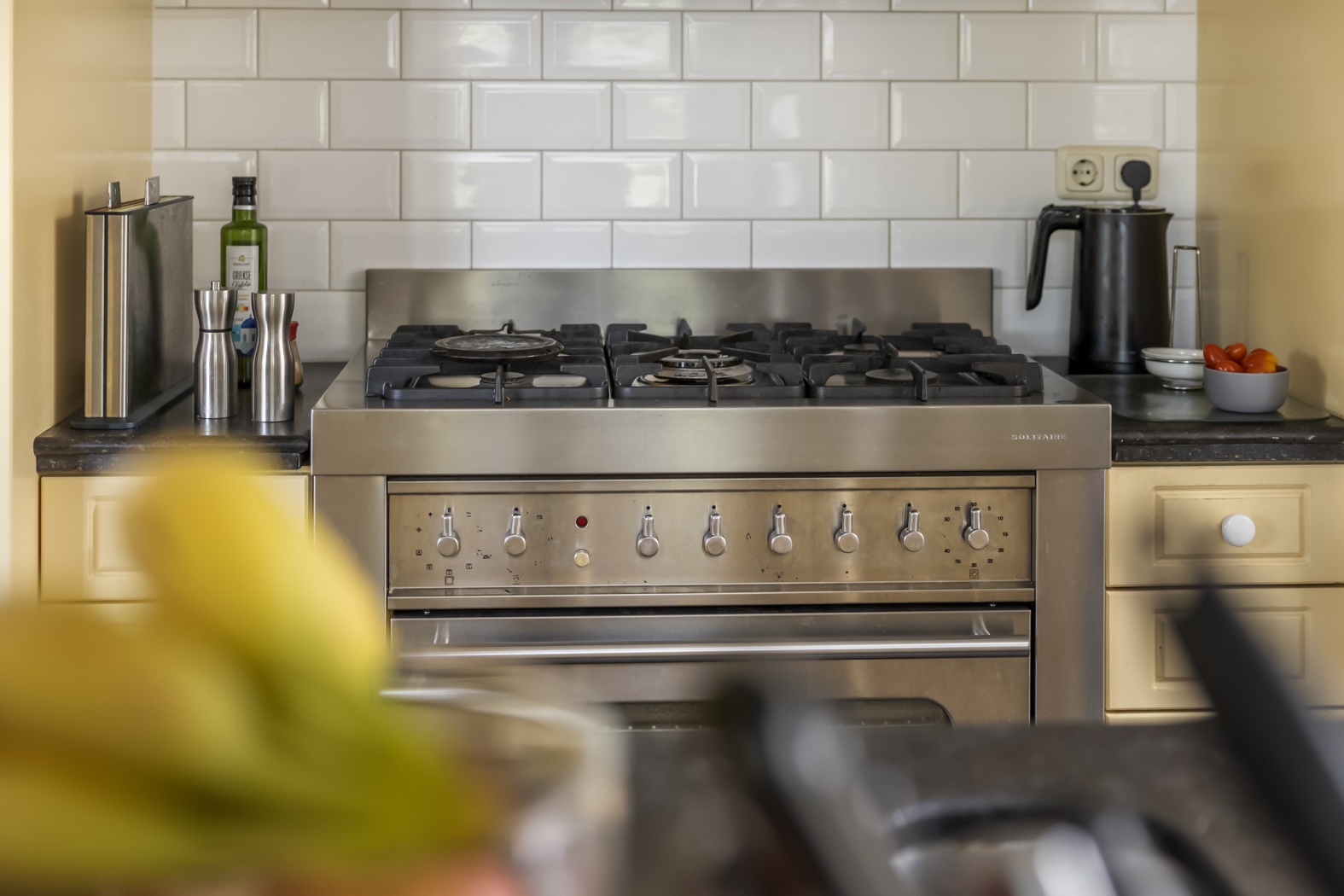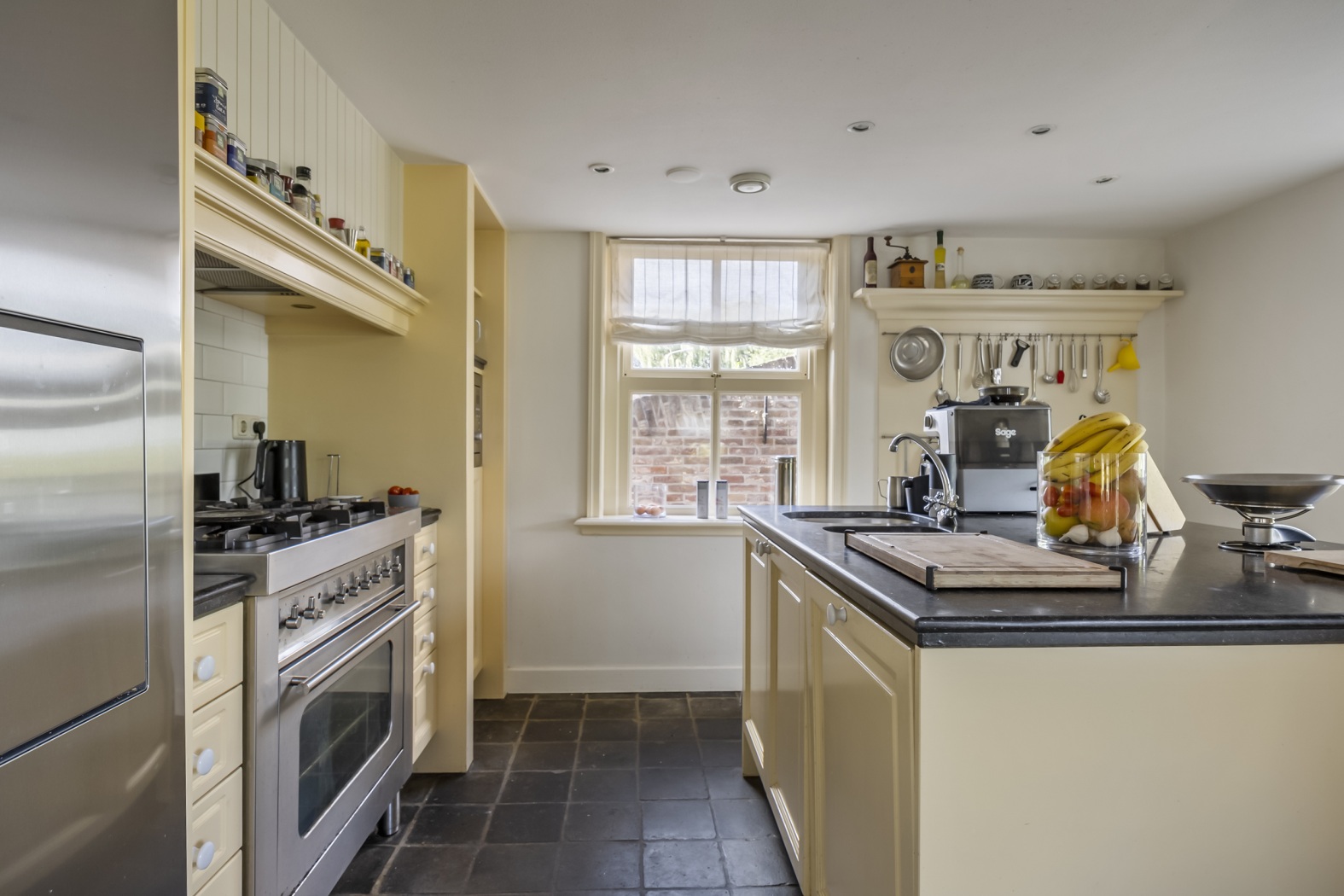 Aan de rechte wand bevindt zich het kookgedeelte met een indrukwekkende schouw en afzuigkap, een stoer rvs 6-pits gasfornuis met grote oven, magnetron, rvs koel-/vriescombinatie en een vaatwasser die het afwaswerk moeiteloos overneemt. Een fraaie profiellijst met keukengerei voegt een ambachtelijke noot toe, terwijl de donkere antieke plavuizen de keuken een stijlvolle en tijdloze basis geven.
