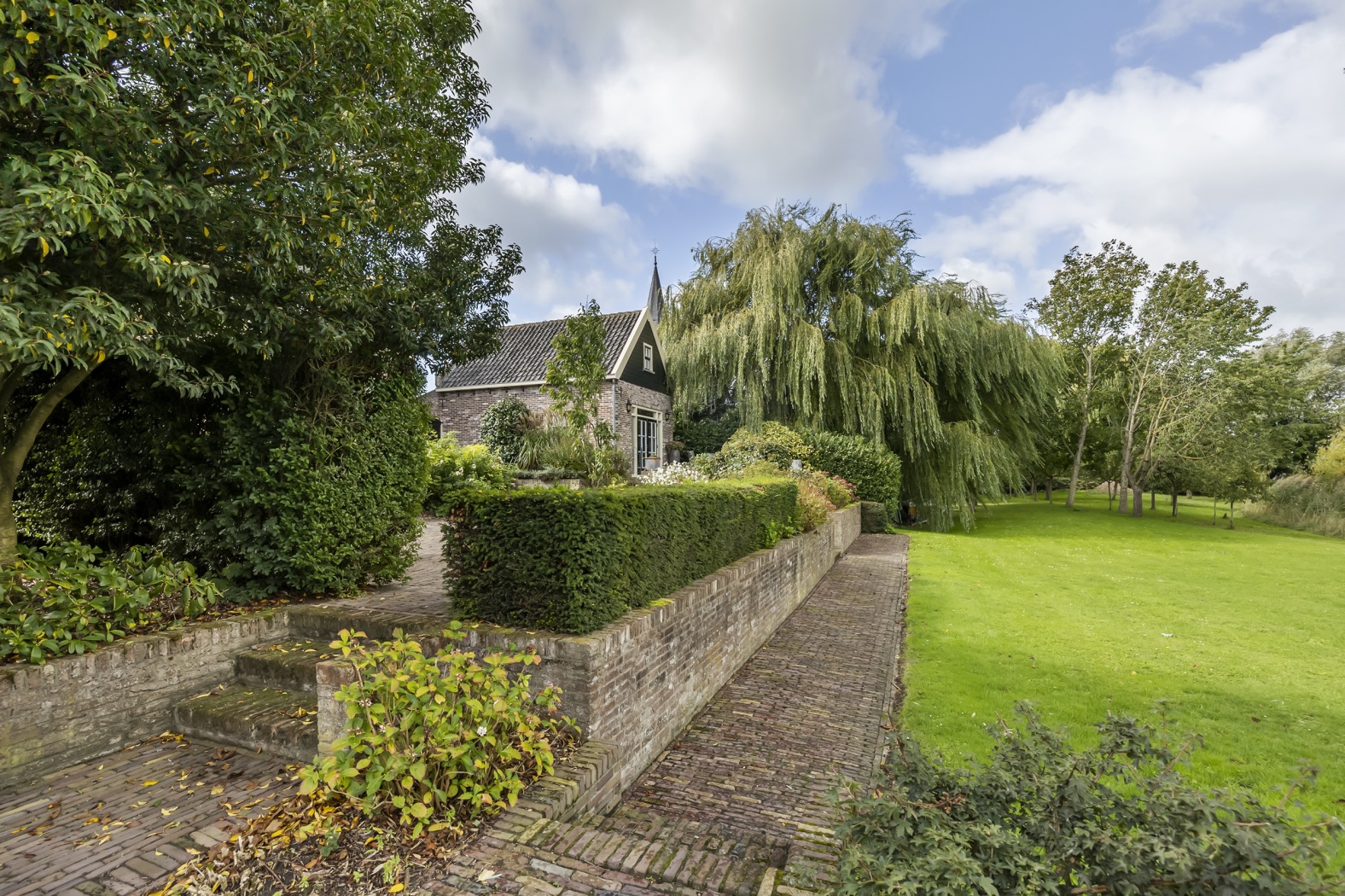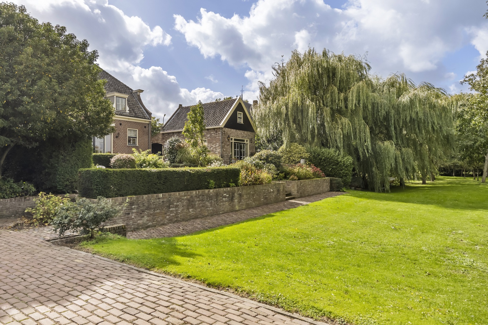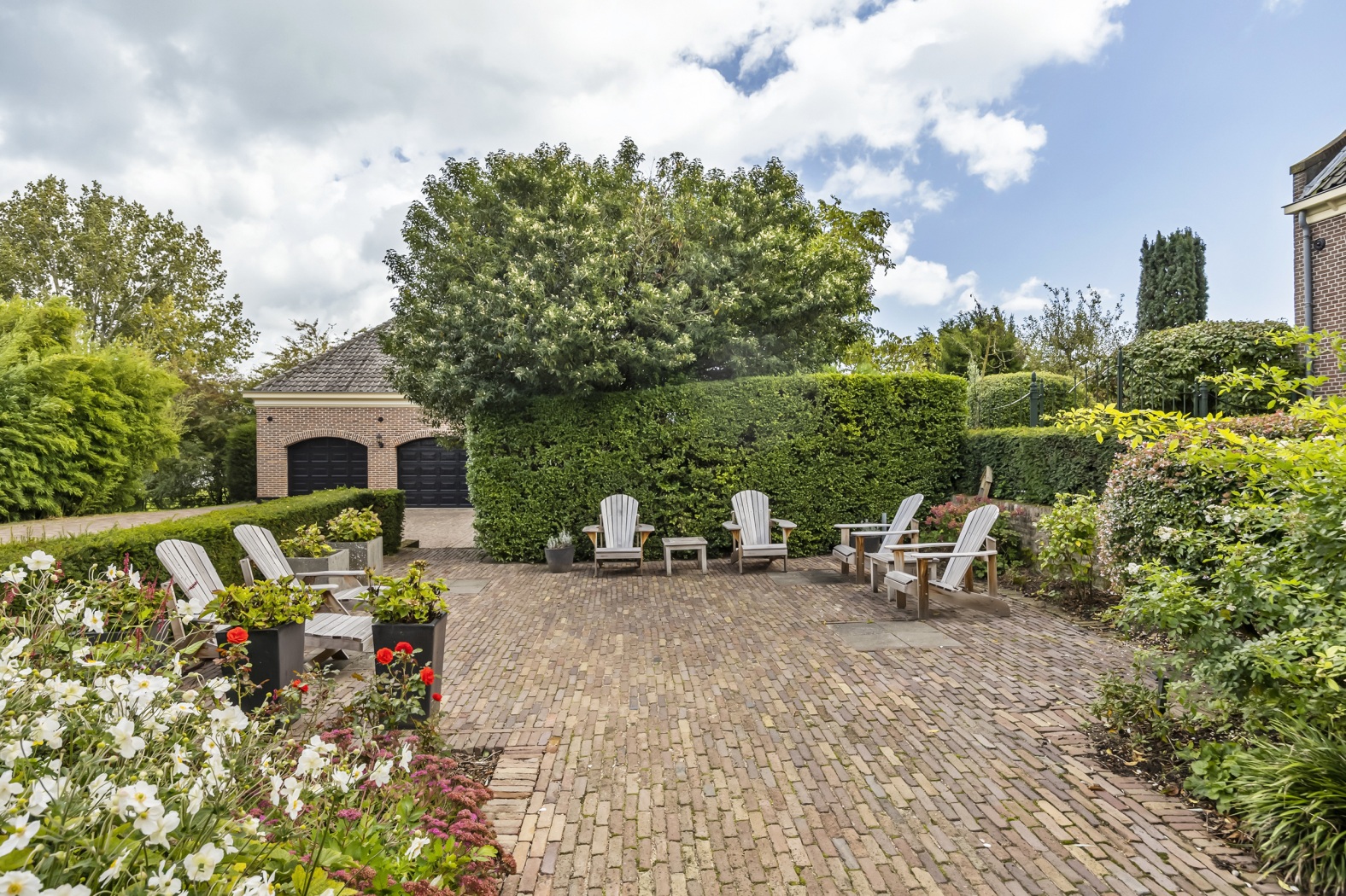 Vanaf de dijk voert een flauwe afrit met automatische dubbele poort naar het achterperceel met ruime parkeergelegenheid en de garage/studio. Aan de oostzijde van de woning biedt de erker een prachtig uitzicht op de sierlijk aangelegde tuin, met weelderige patronen van hortensia’s en Annabellen.