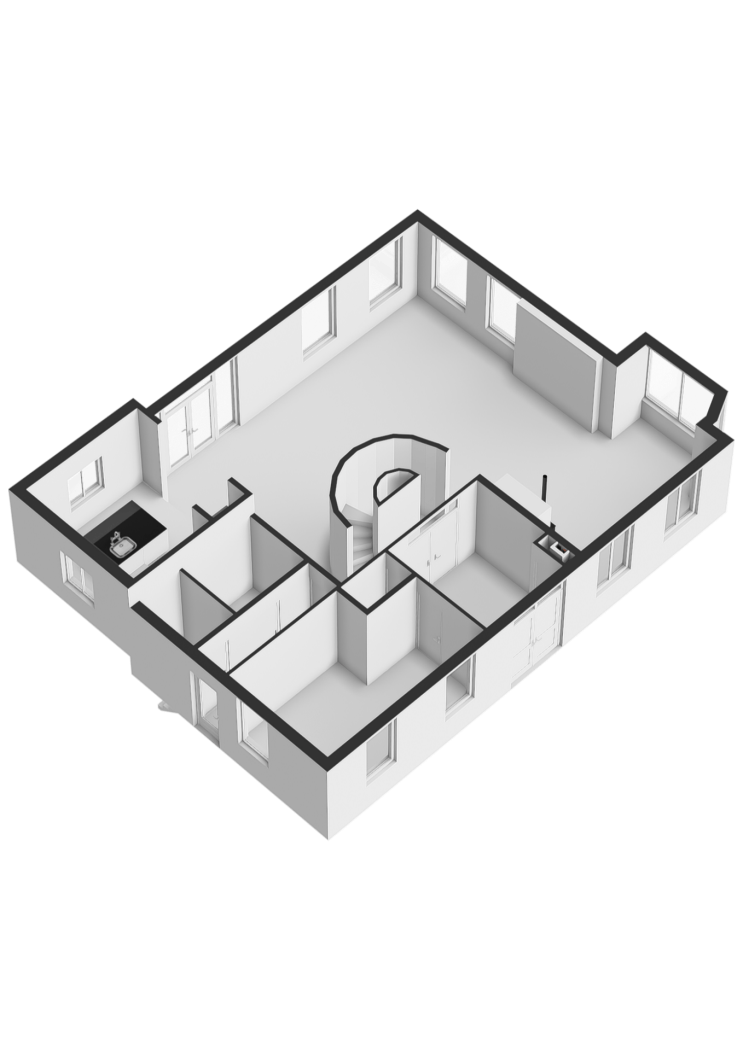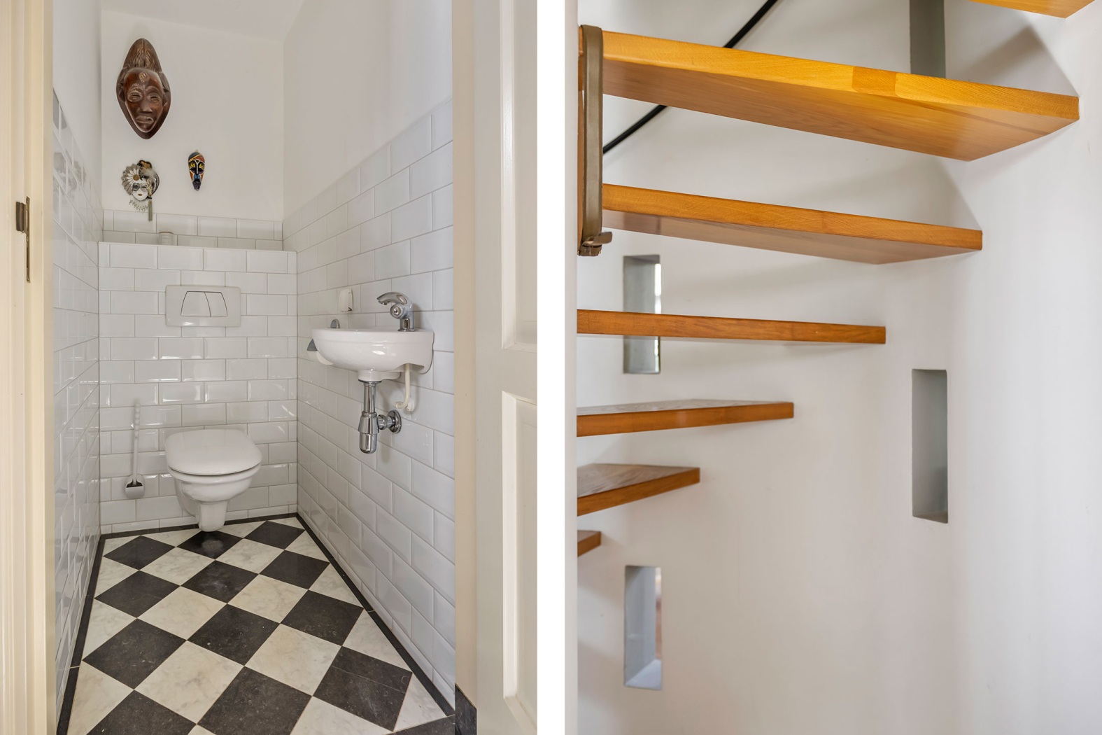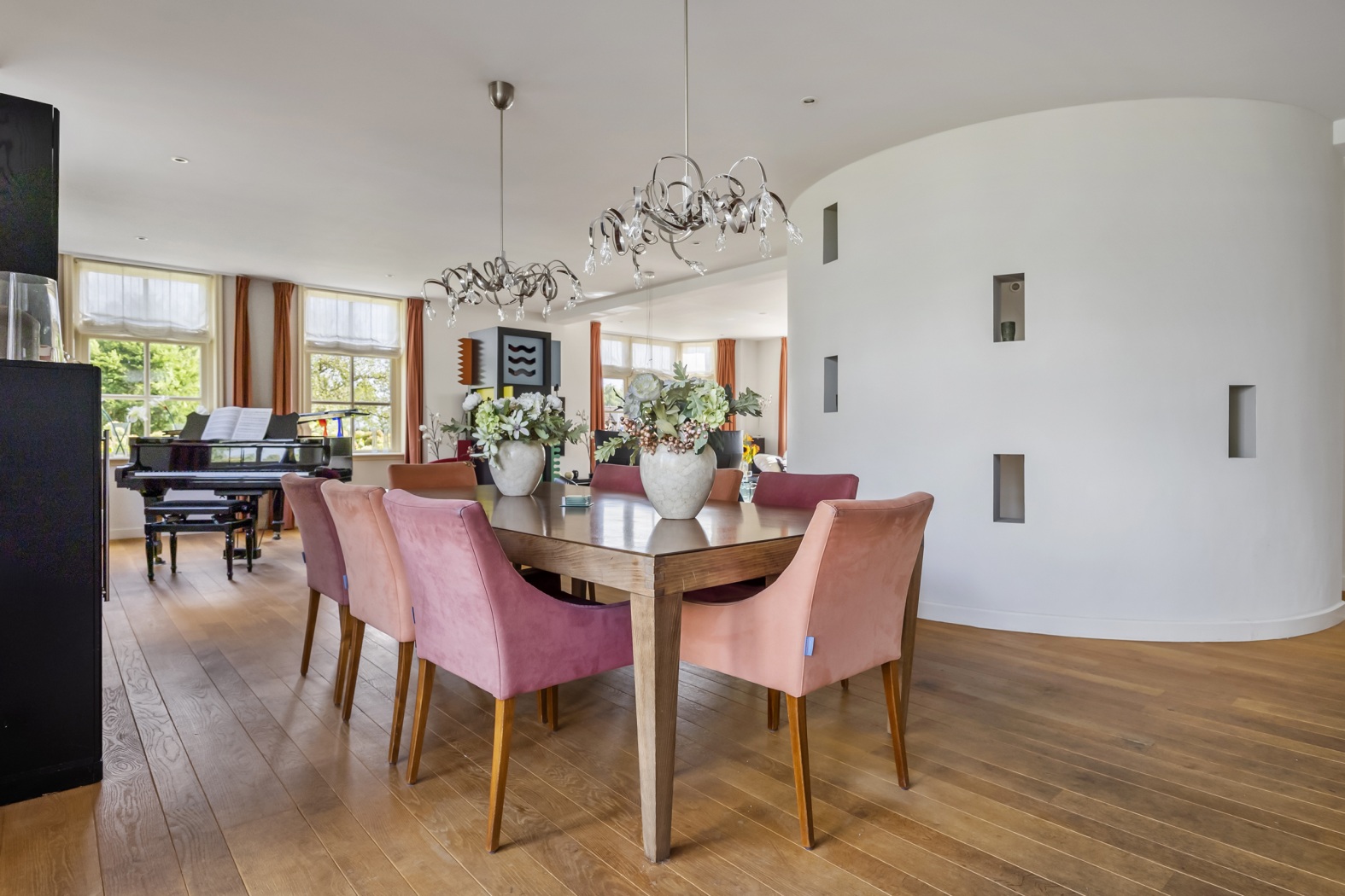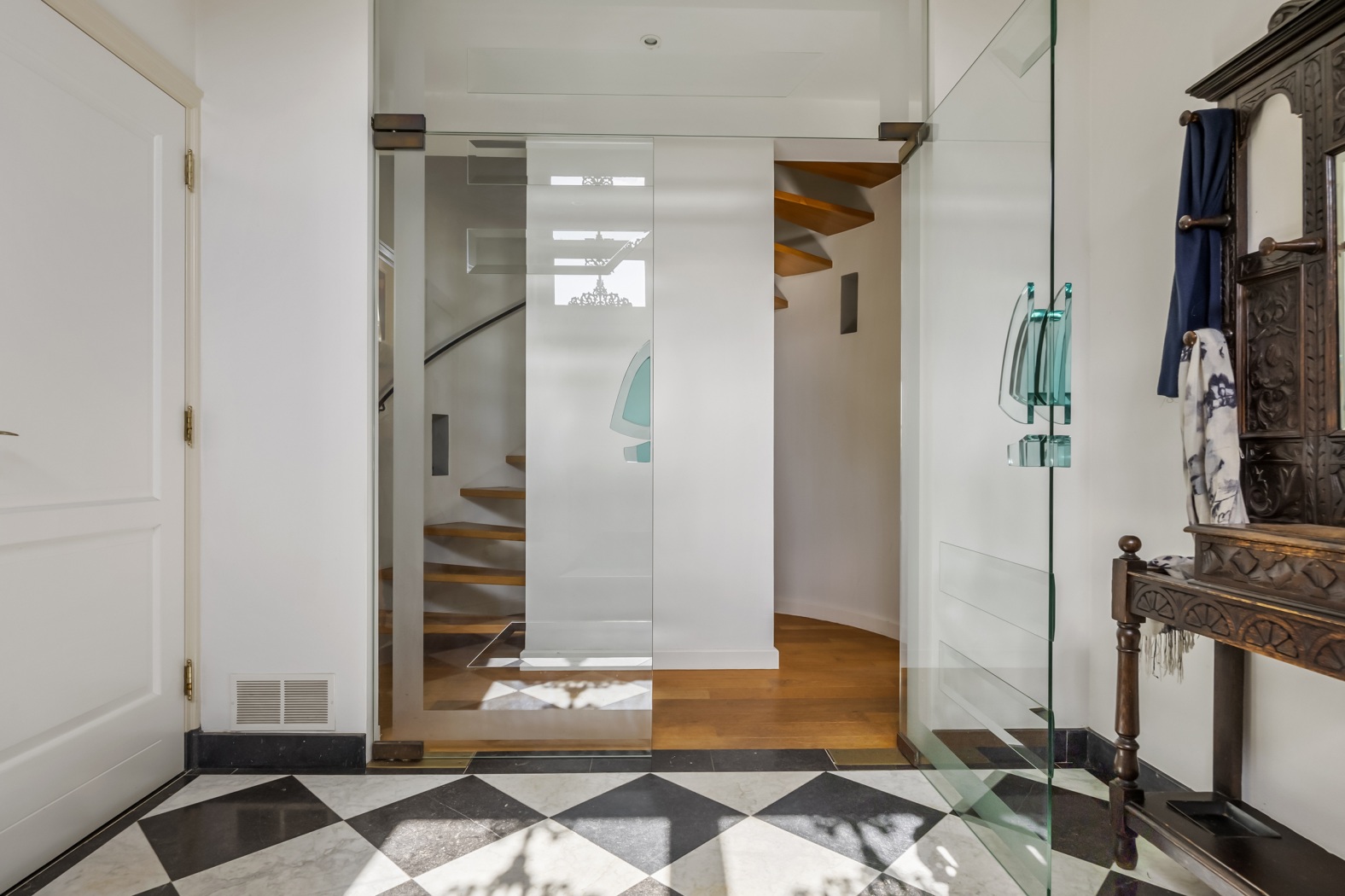 Binnen zet de grandeur zich voort. De hal, voorzien van zwart-wit natuurstenen plavuizen, geeft toegang tot het toilet, de woonkamer en de werkkamer. Blikvanger zijn de dubbele glazen deuren naar de elegante halfronde trapopgang, subtiel geïntegreerd in de leefruimte. De halfronde wand met nissen voegt een speels accent toe, dat op subtiele wijze terugkeert in de woonkamer.