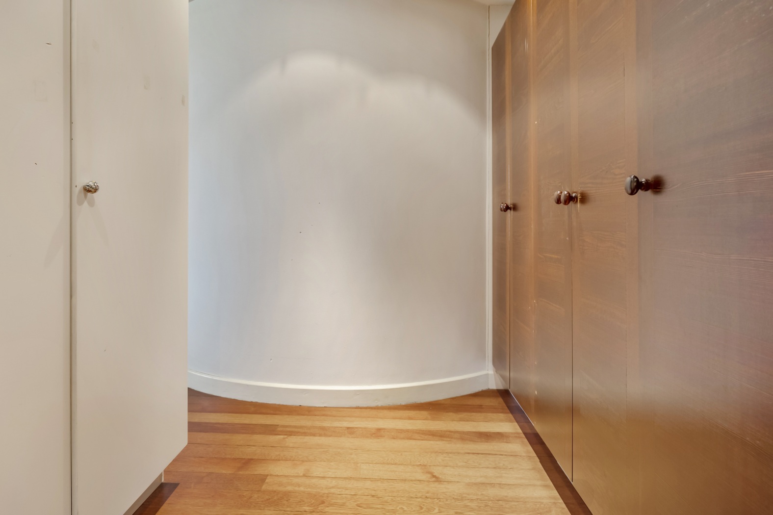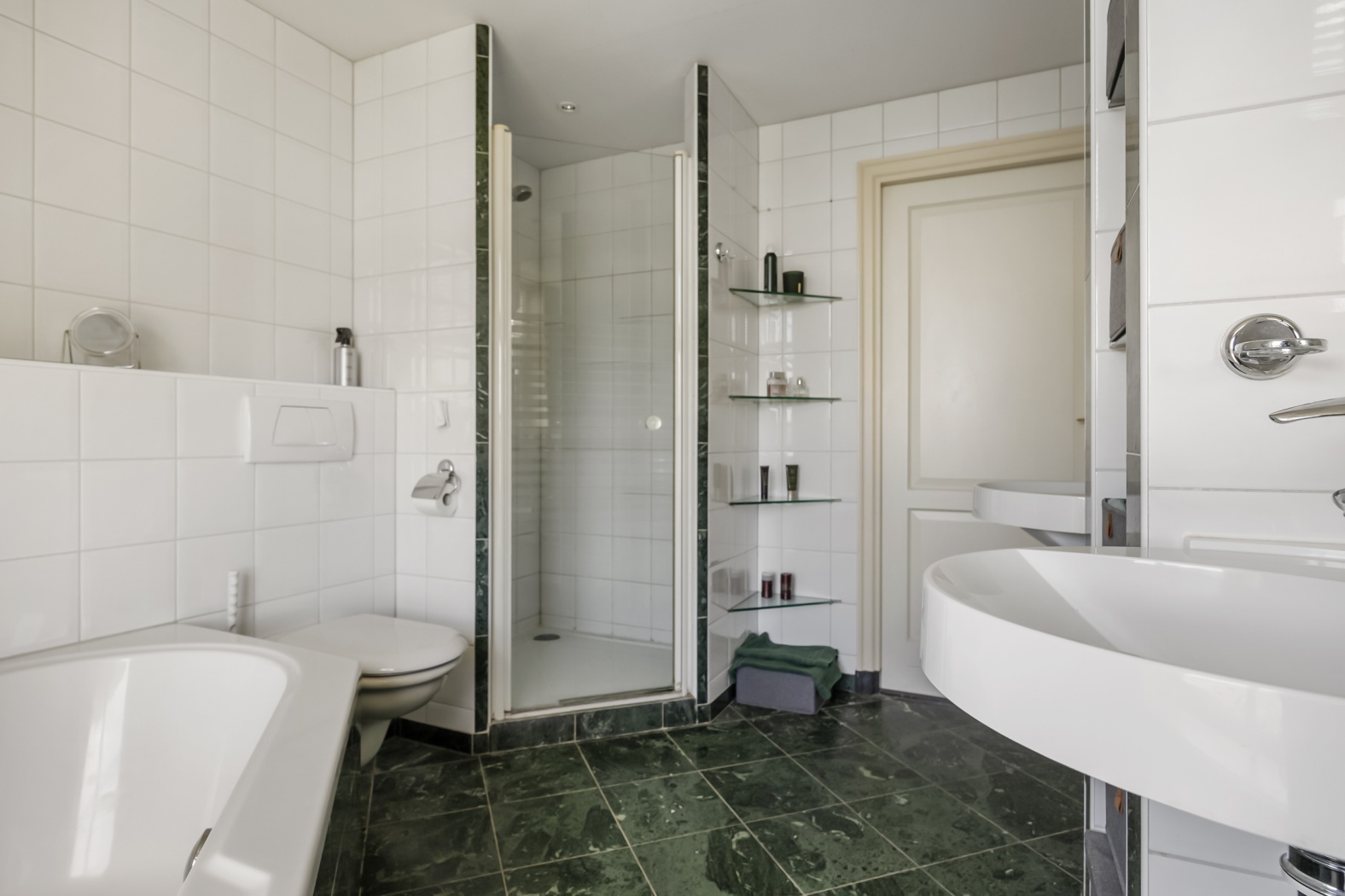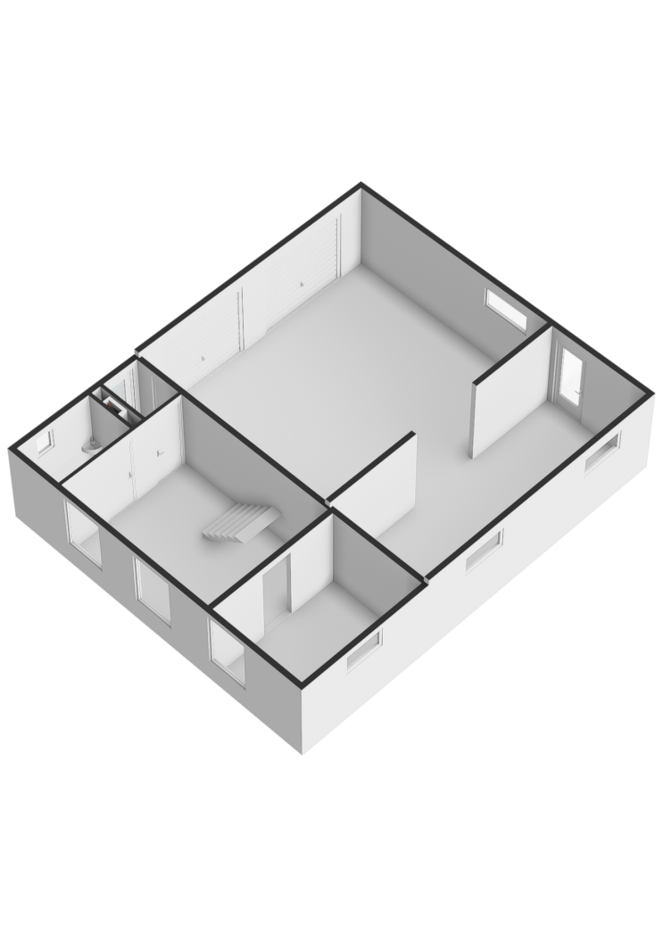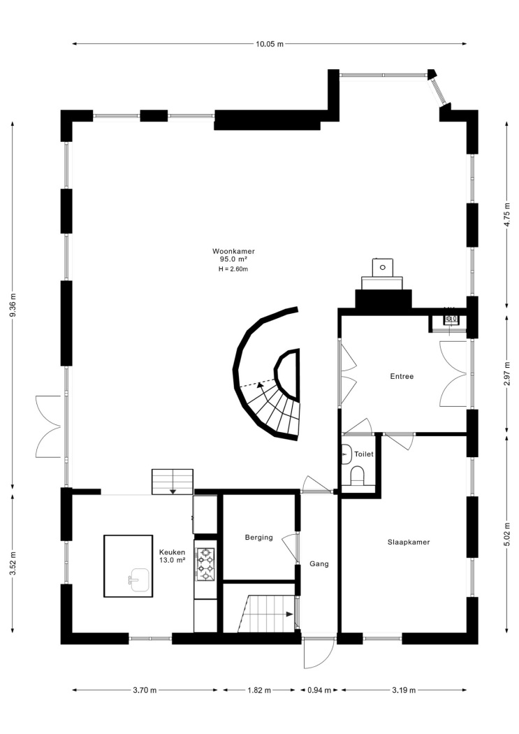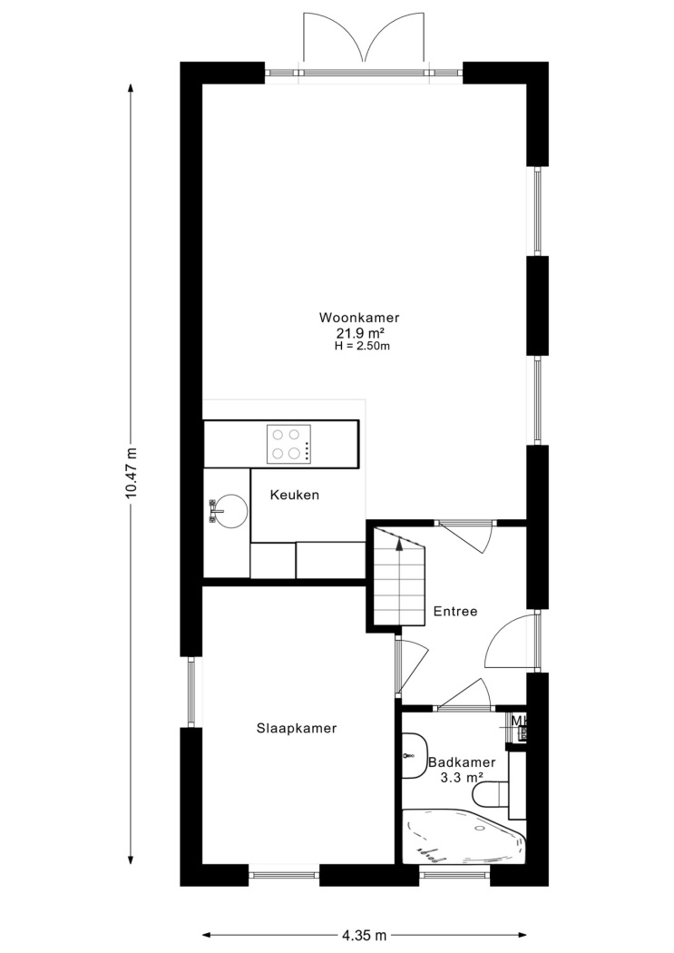 Binnen zet de grandeur zich voort. De hal, voorzien van zwart-wit natuurstenen plavuizen, geeft toegang tot het toilet, de woonkamer en de werkkamer. Blikvanger zijn de dubbele glazen deuren naar de elegante halfronde trapopgang, subtiel geïntegreerd in de leefruimte. De halfronde wand met nissen voegt een speels accent toe, dat op subtiele wijze terugkeert in de woonkamer.