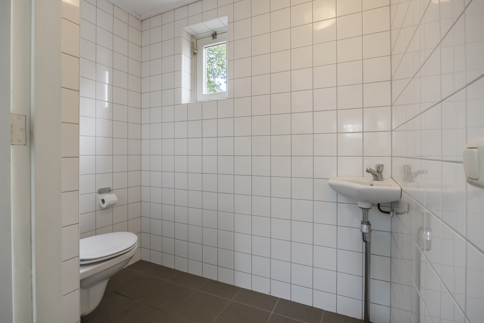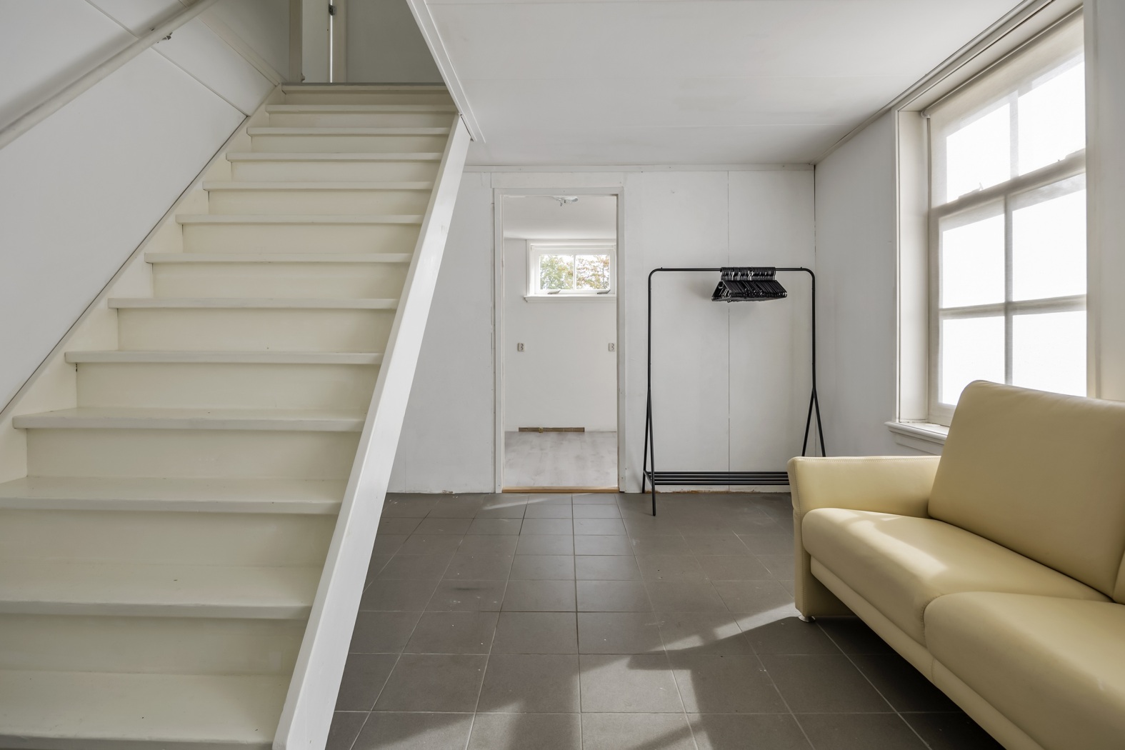 Aan de westzijde bevindt zich een tweede entree, die toegang biedt tot een gang met bergruimte, de trap naar de kelder én het woongedeelte.
