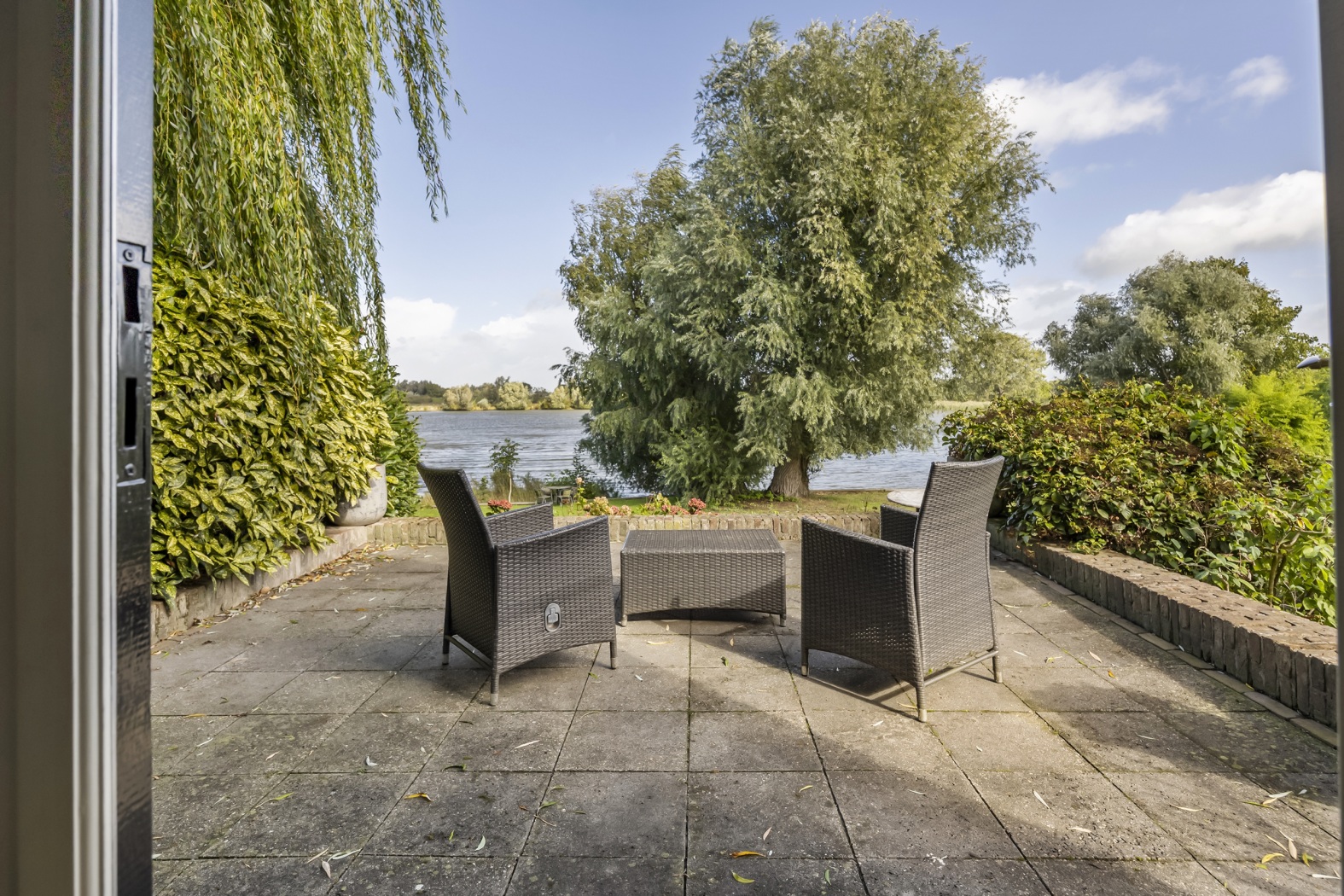 Het perceel grenst direct aan de Lek, met een eigen privé strand. Na een drukke dag wandel je er zo naartoe om de stilte en het weidse uitzicht in je op te nemen. Of je de avond nu afsluit bij de vuurkorf of de dag begint op je yogamat in de eerste zonnestralen – deze buitenruimte voelt als pure luxe. Het enige ‘publiek’ zijn de voorbijvarende schippers op de rivier.