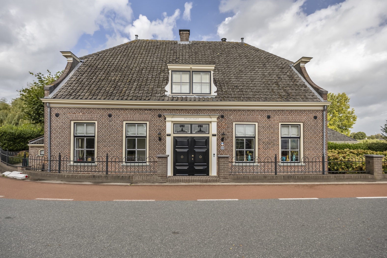 In de symmetrische voorgevel trekt de originele monumentale dubbele voordeur meteen de aandacht. Twee bovenlichten, sierlijke levensbomen en een profiellijst met de naam Welgelegen maken dit tot een detail dat niet zou misstaan in een museum. Aan weerszijden flankeren zesruits ramen de entree als stille wachters.
