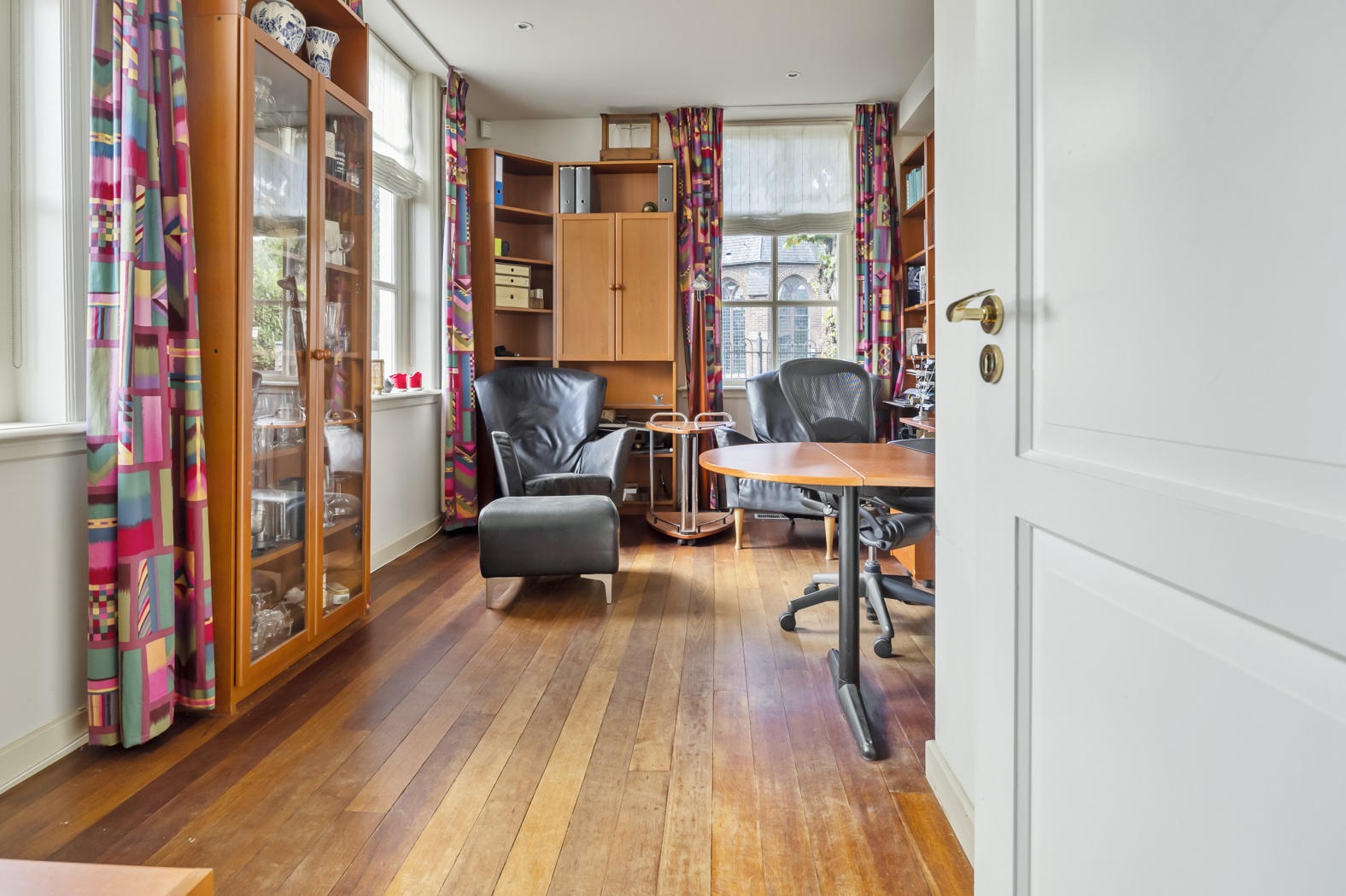 Aan de zuidwestzijde ligt een lichte, inspirerende werkkamer met originele zesruits ramen op het zuiden en westen. De parketvloer geeft de ruimte warmte en karakter.