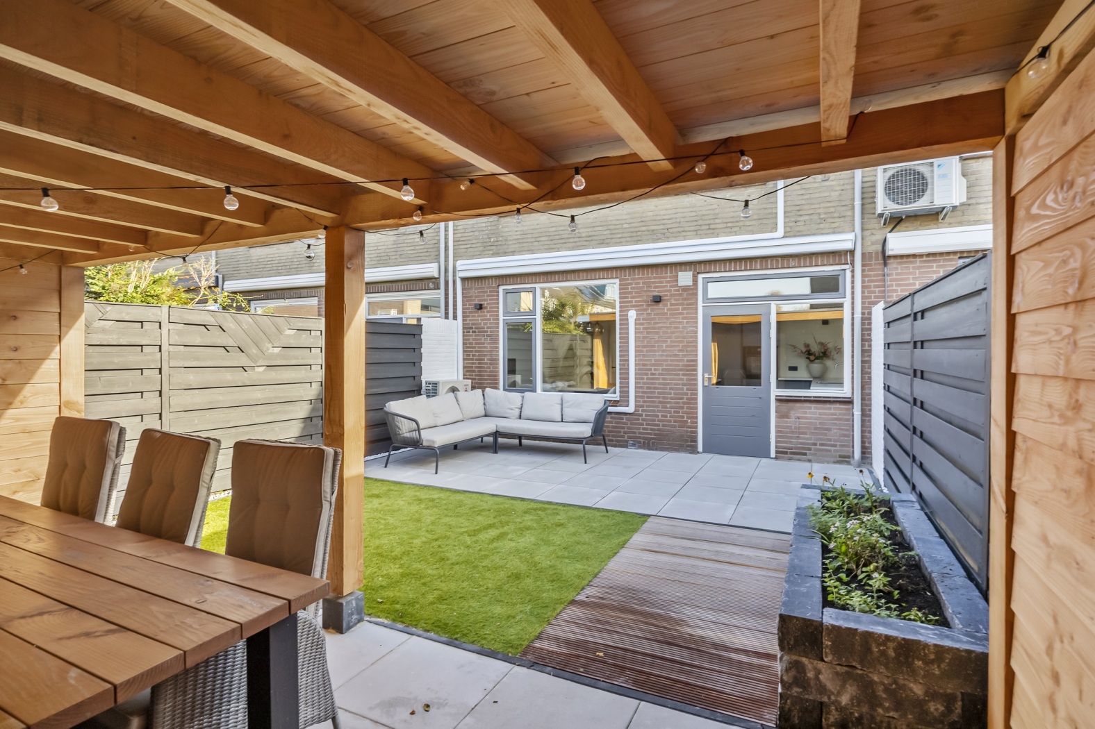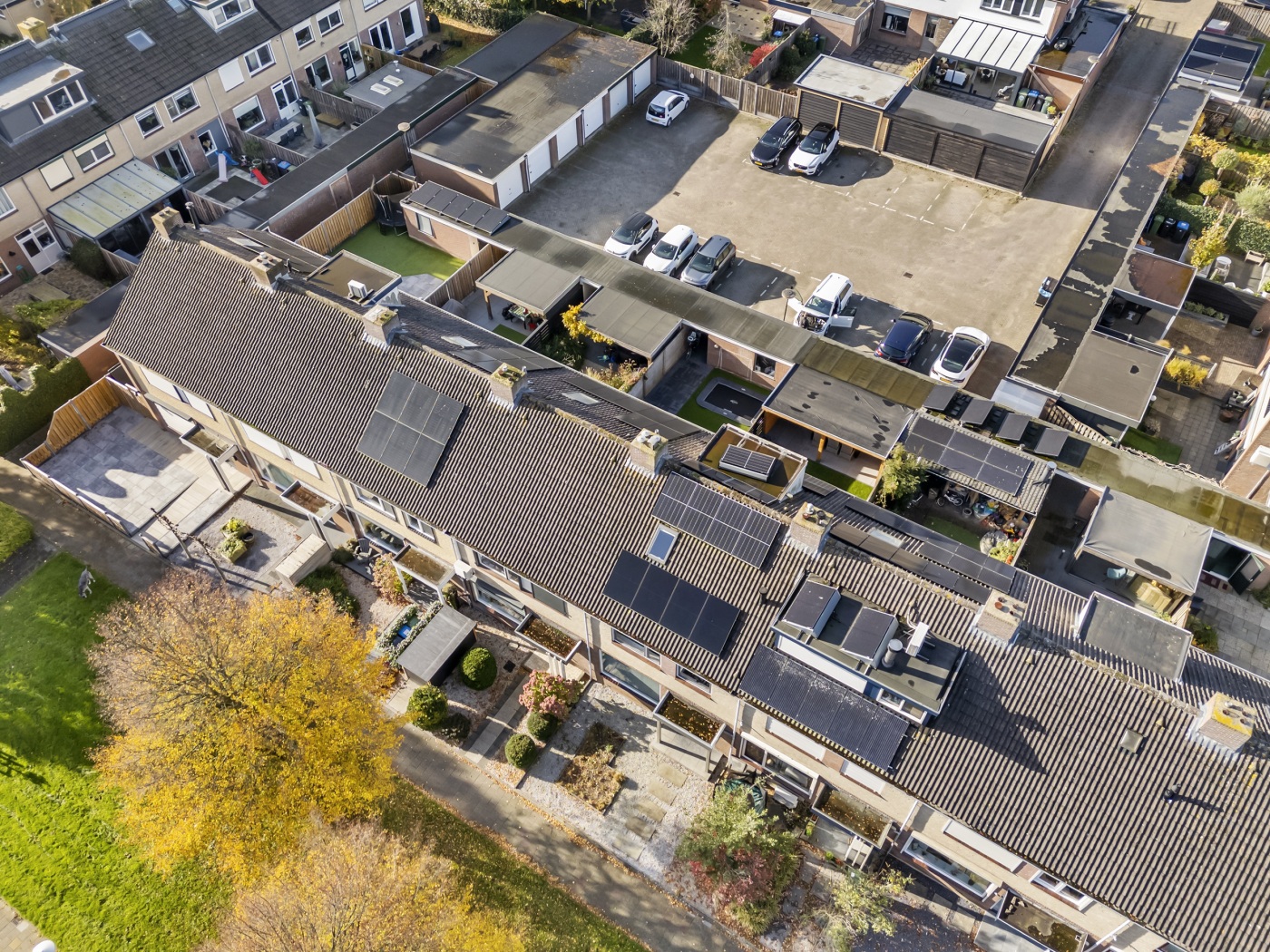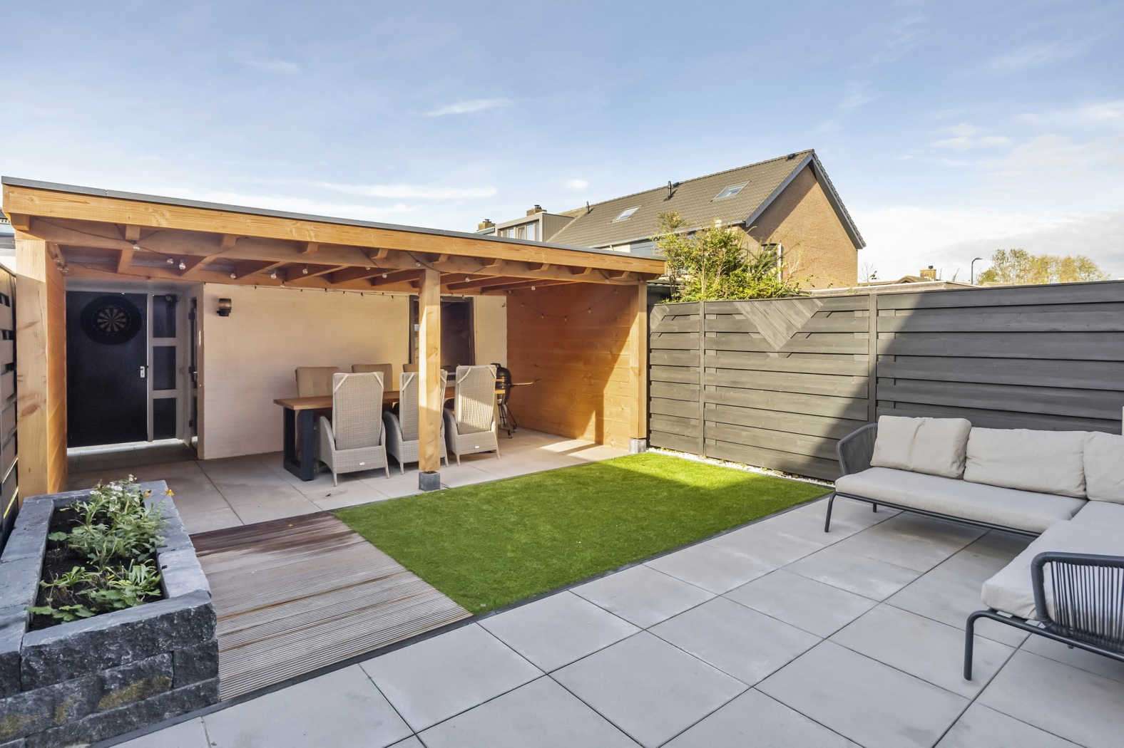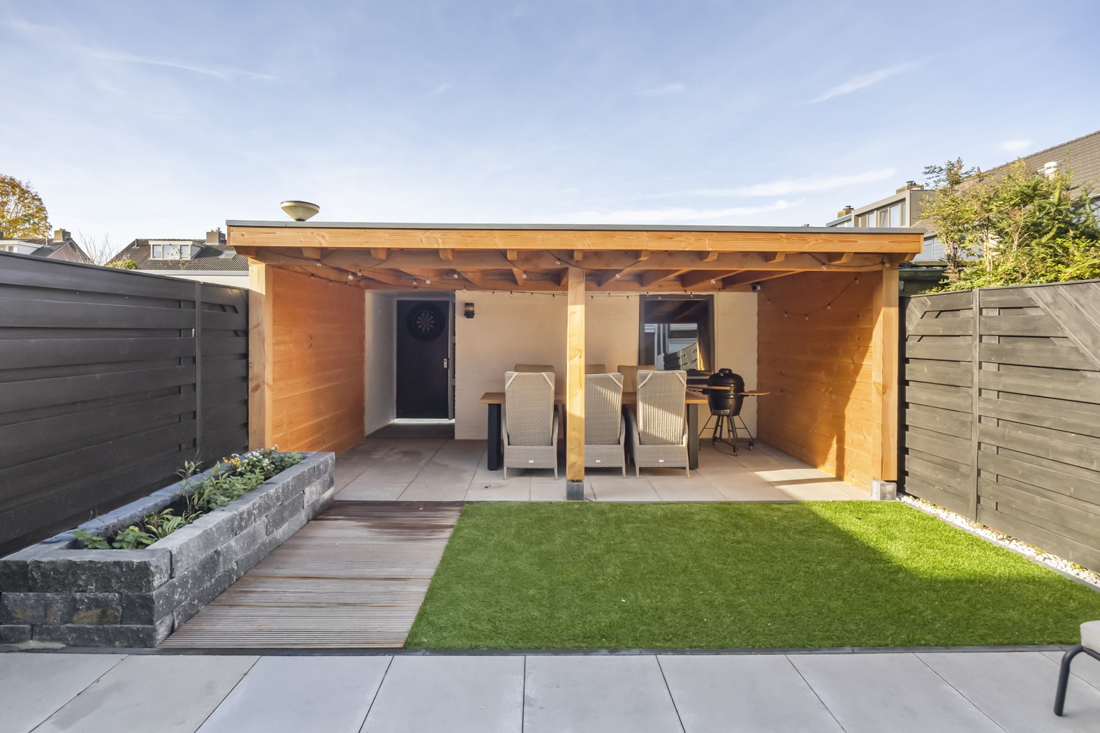 Over de volledige breedte staat een royale overkapping van 6 x 3 meter, waardoor je het hele seizoen door heerlijk buiten kunt verblijven. Onder de overkapping bevindt zich bovendien een stenen berging van circa 10 m² — ideaal voor fietsen en opbergruimte. Vanuit hier loop je via de achtergelegen poort zo naar het parkeerpleintje. Handig én comfortabel. De schuttingen zorgen voor volop privacy en dankzij de ligging op het zuidwesten geniet je hier bijna de hele dag van de zon.