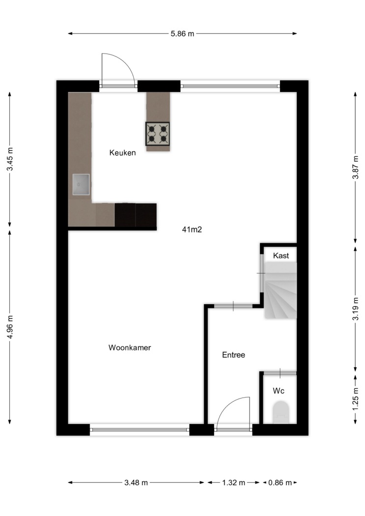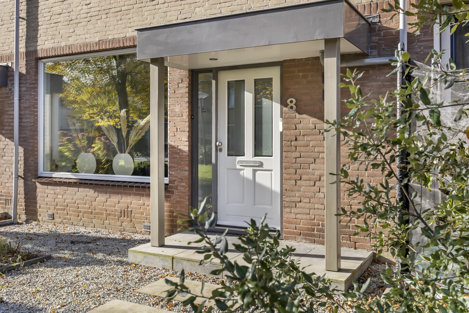 De entree met luifel verleent toegang tot de woonkamer, de toiletruimte, de meterkast en de trapopgang naar de verdieping.