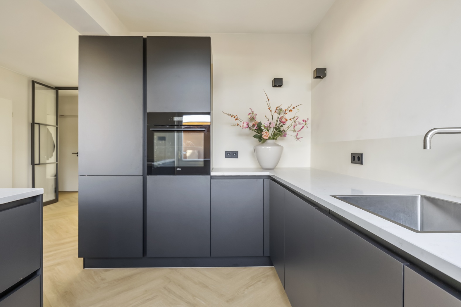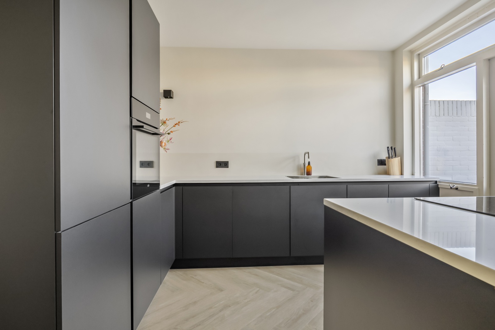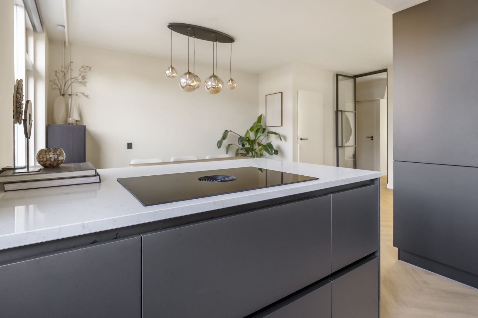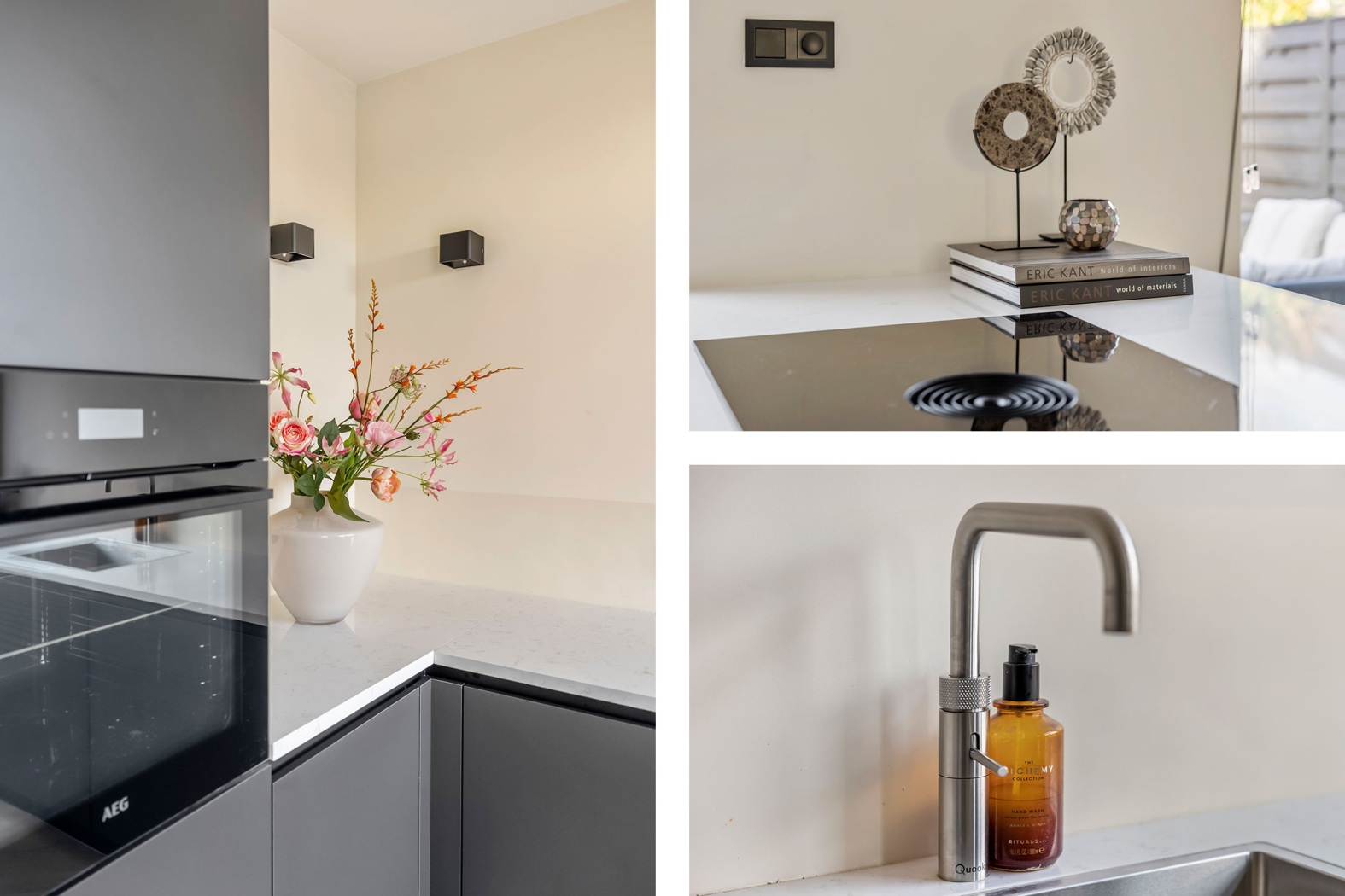 Aan de achterzijde bevindt zich de keuken, met een deur naar de tuin — ideaal voor zomerse avonden waarbij binnen en buiten moeiteloos in elkaar overlopen. De keuken is greeploos en strak uitgevoerd in een donkere tint, met een composieten werkblad en een opstelling die bestaat uit een royale L-vorm én een schiereiland waar je kunt koken, praten en leven. De Bora kookplaat met geïntegreerde afzuiging zorgt voor een rustige, open uitstraling, de AEG-oven reinigt zichzelf (ja, echt), de ETNA koel-vriescombinatie houdt alles vers en overzichtelijk, de Siemens vaatwasmachine draait stilletjes op de achtergrond mee, en met de Quooker-kraan staat kokend water klaar voordat je het doorhebt. Alles is nieuw, alles klopt, alles werkt voor je.