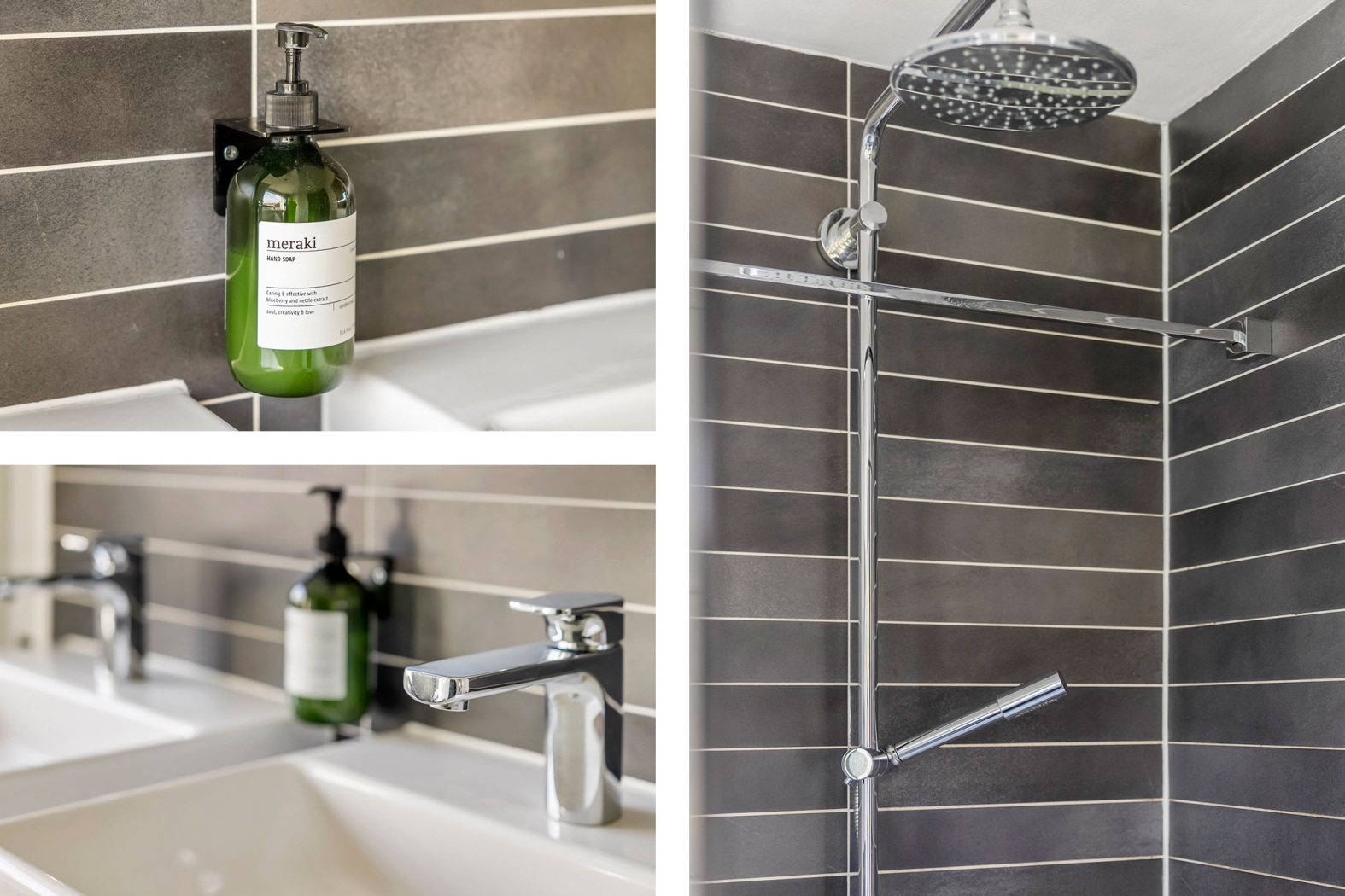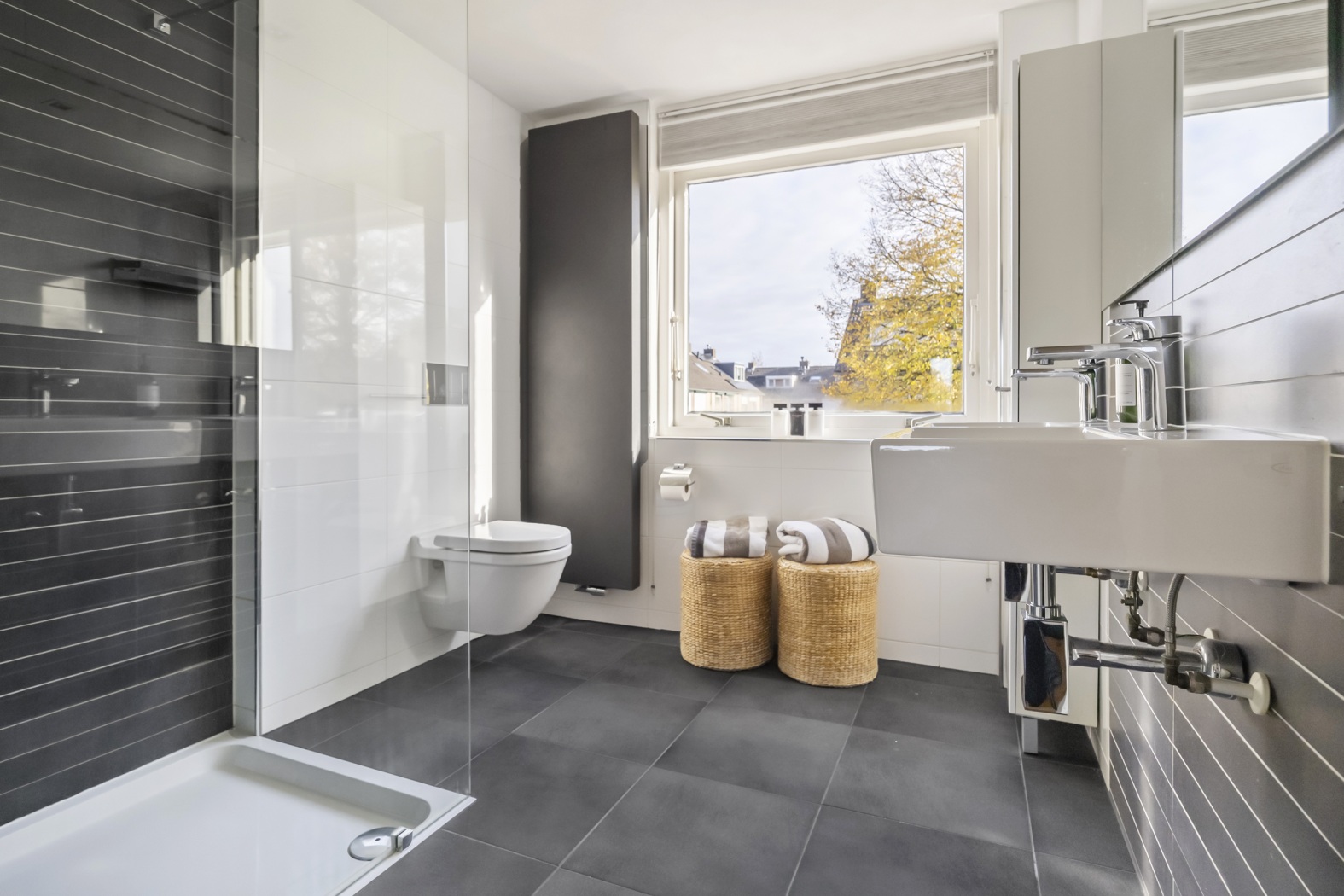 Aan de voorzijde is de badkamer van circa 6 m², modern en ruim opgezet. Mooie tegels, een dubbele wastafel met spiegel, een riante inloopdouche met regendouche, een tweede zwevend toilet en een designradiator zorgen voor een ontspannen wellness gevoel. Hier kun je ’s ochtends écht rustig opstarten.