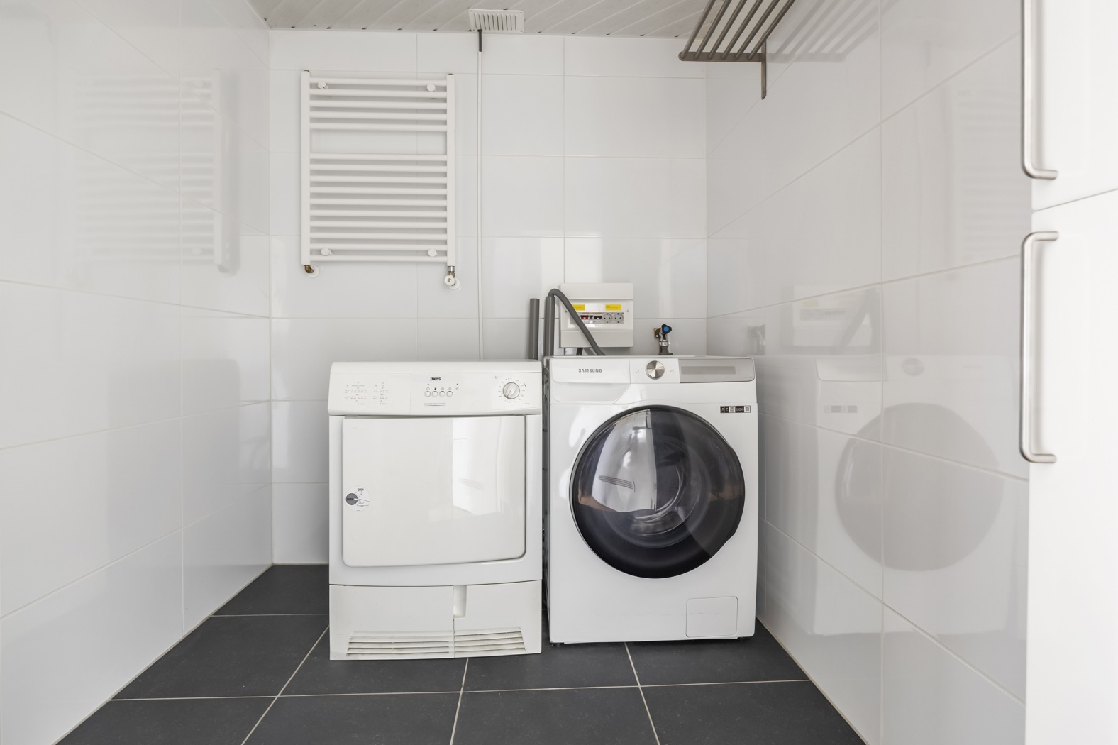 De voormalige badkamer is omgetoverd tot een praktische en nette wasruimte, compleet betegeld en voorzien van aansluitingen voor wasmachine en droger, plus een designradiator. Functioneel, slim en heerlijk uit het zicht.