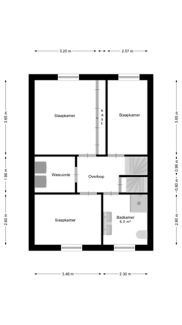 De eerste verdieping is praktisch én prettig ingedeeld, met drie ruime slaapkamers, een moderne badkamer en een aparte wasruimte. Alles voelt fris, licht en functioneel — precies zoals je het hebben wilt.
