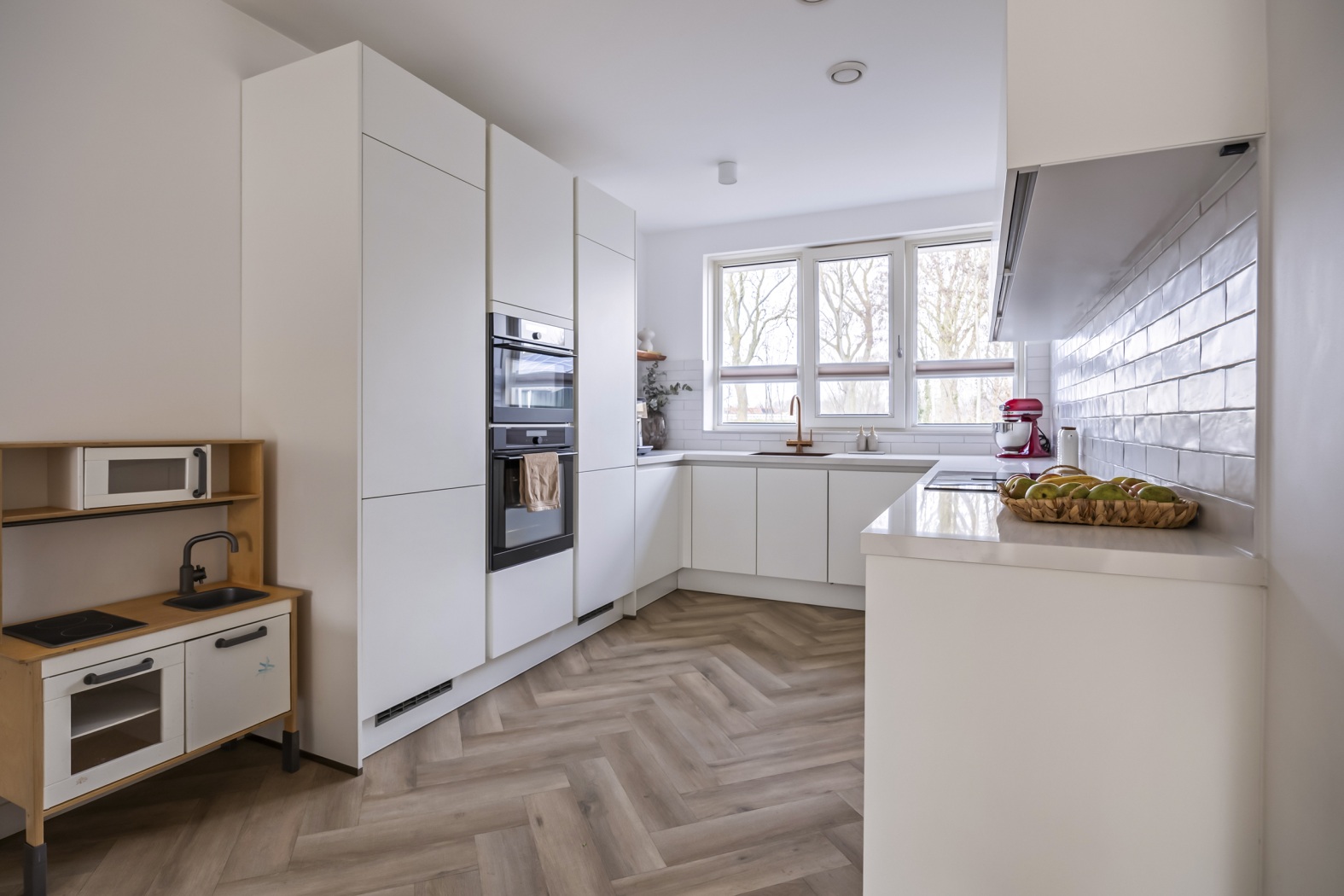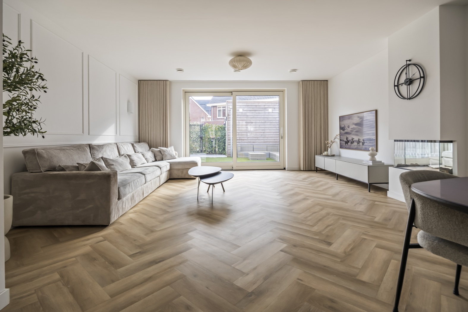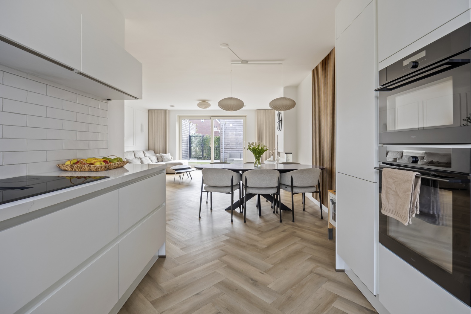 Bij binnenkomst valt direct de ruimte en het licht op. De woonkamer is royaal opgezet en dankzij de grote schuifpui naar de tuin heerlijk licht. In de woonkamer is voldoende ruimte voor een fijn zit- en eethoek, de elektrische haard in het midden zorgt voor warmte en verbondenheid. De schuifdeur maakt de tuin echt onderdeel van de leefruimte: binnen en buiten lopen hier moeiteloos in elkaar over. De open keuken sluit naadloos aan op de woonkamer en is strak en modern uitgevoerd, compleet met alle benodigde inbouwapparatuur én een Quooker. Een fijne plek voor lange diners en gezellige avonden.