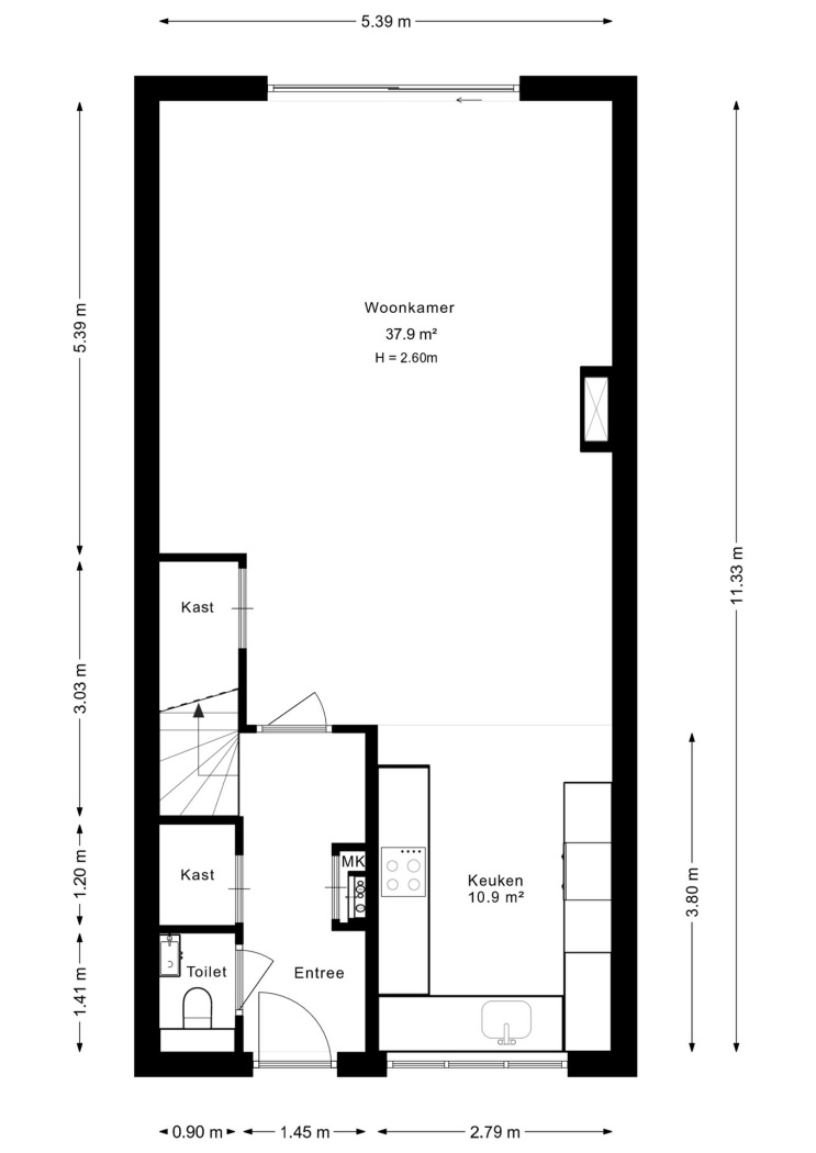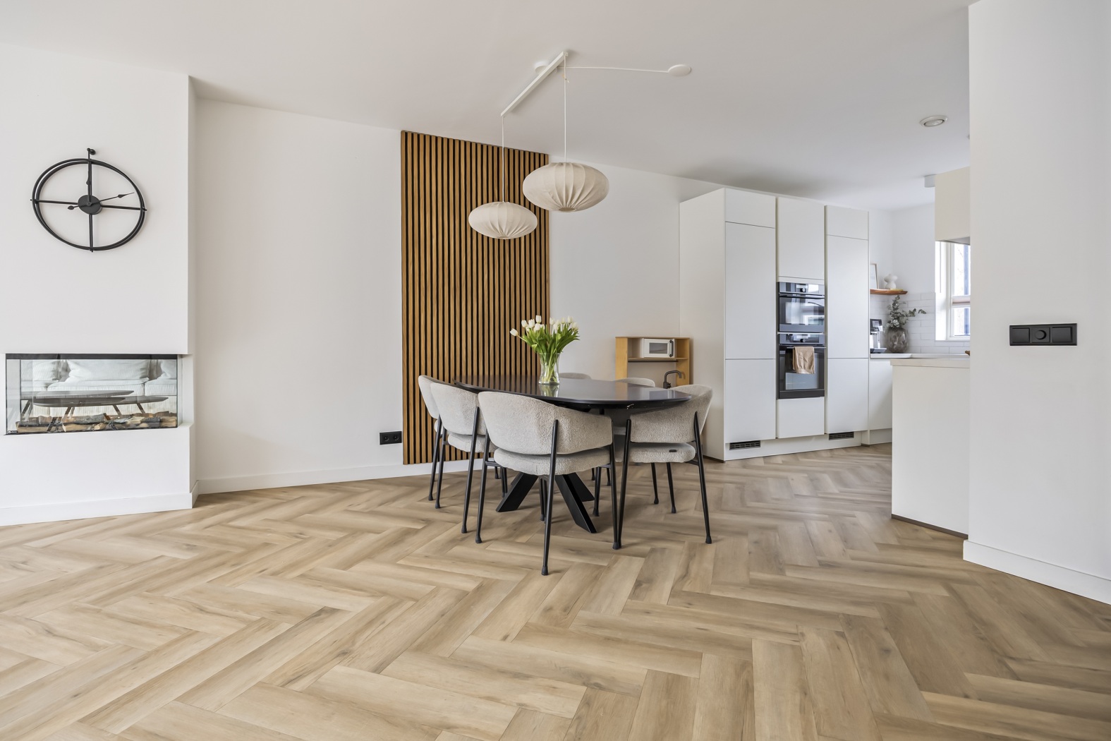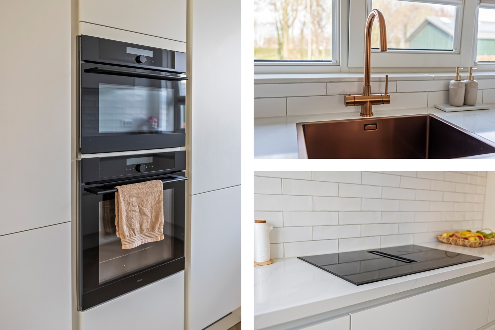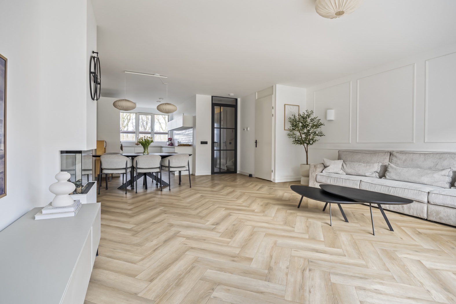 Bij binnenkomst valt direct de ruimte en het licht op. De woonkamer is royaal opgezet en dankzij de grote schuifpui naar de tuin heerlijk licht. In de woonkamer is voldoende ruimte voor een fijn zit- en eethoek, de elektrische haard in het midden zorgt voor warmte en verbondenheid. De schuifdeur maakt de tuin echt onderdeel van de leefruimte: binnen en buiten lopen hier moeiteloos in elkaar over. De open keuken sluit naadloos aan op de woonkamer en is strak en modern uitgevoerd, compleet met alle benodigde inbouwapparatuur én een Quooker. Een fijne plek voor lange diners en gezellige avonden.
