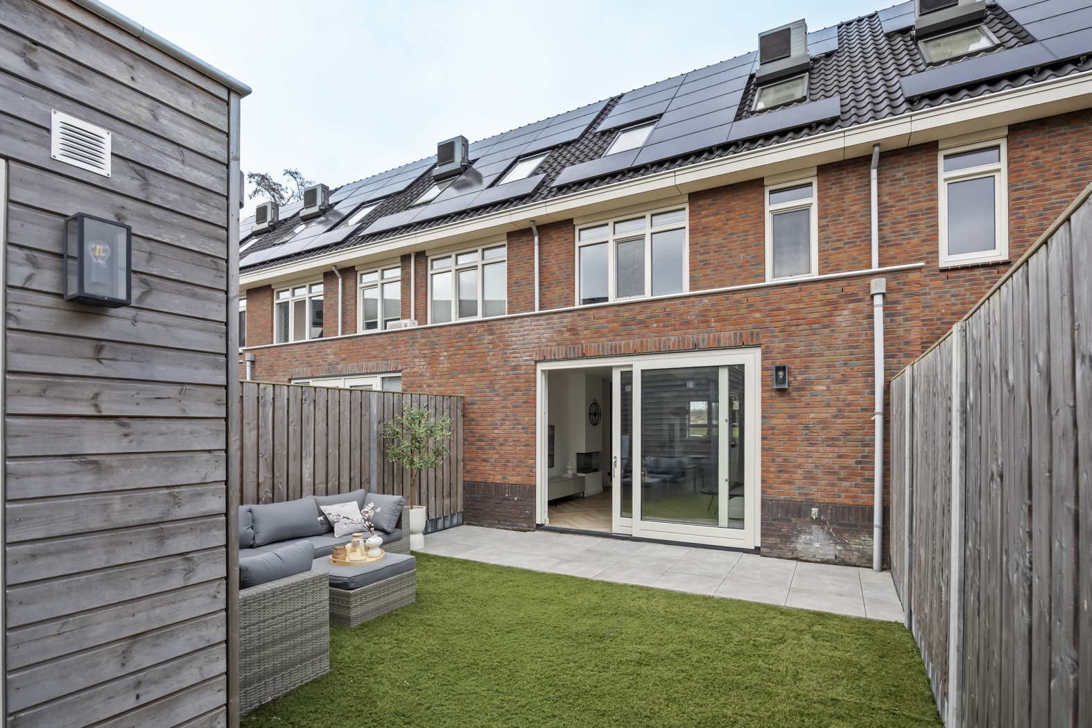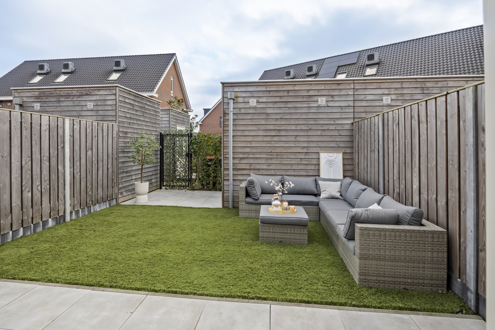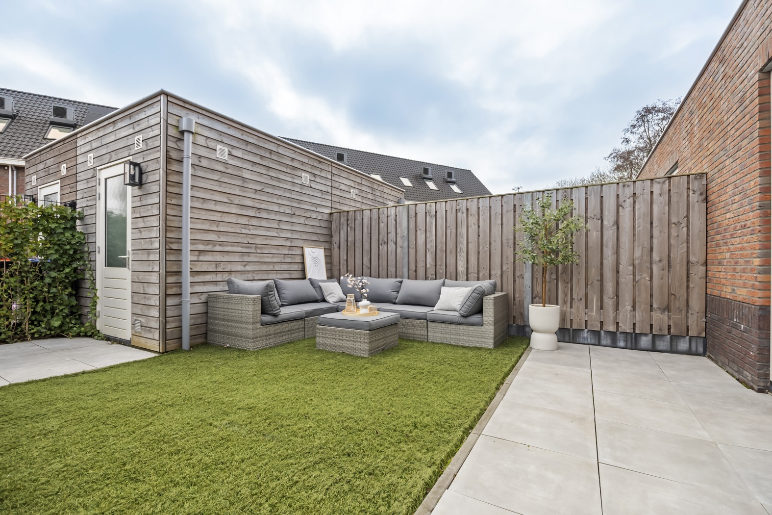 De tuin is netjes onderhouden en biedt volop ruimte om te ontspannen. Achterin staat een losstaande houten berging, ideaal voor fietsen, tuinspullen en extra opslag.