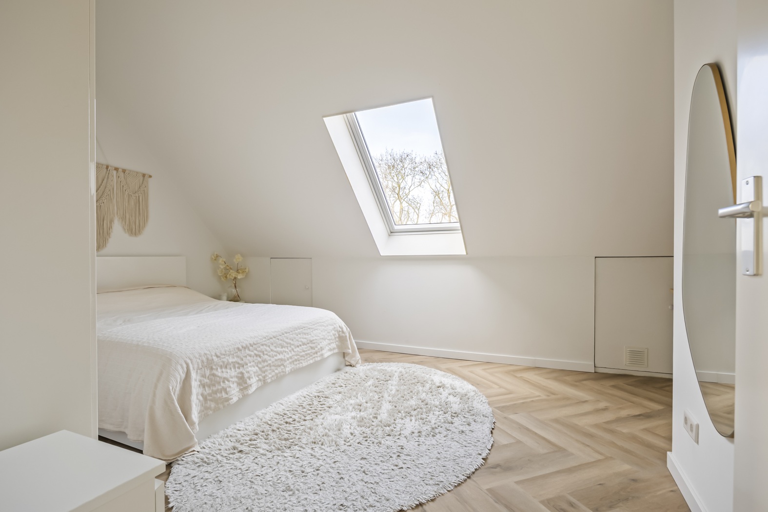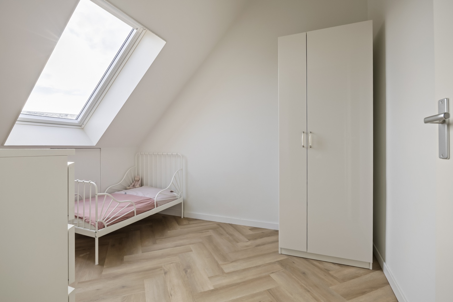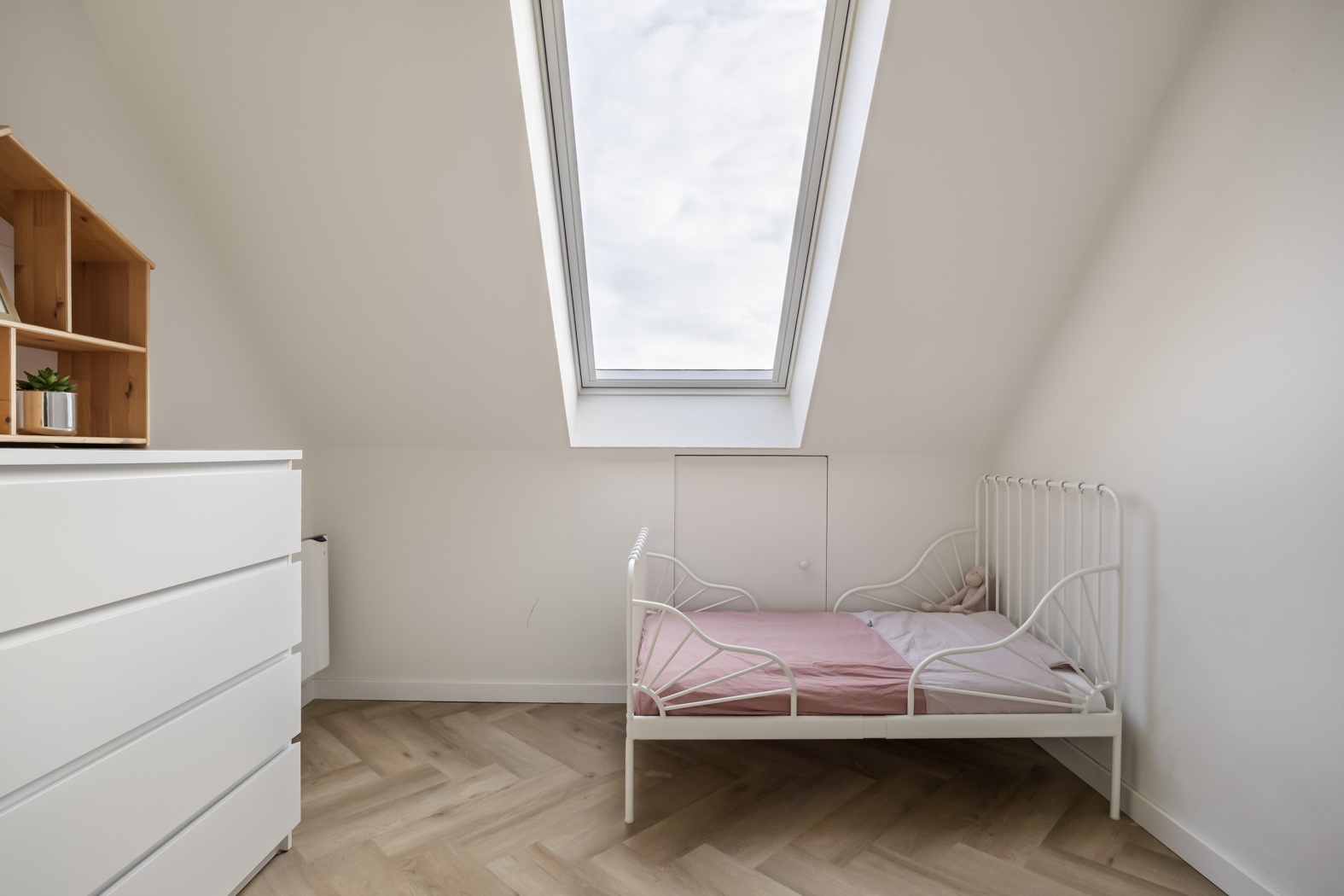 De tweede verdieping verrast opnieuw. Hier zijn nog twee slaapkamers te vinden: één ruime en één kleinere, waarbij het hoge dak direct in het oog springt en zorgt voor een indrukwekkend ruimtelijk gevoel. Daarnaast is er een praktische wasruimte met volop extra opbergruimte.