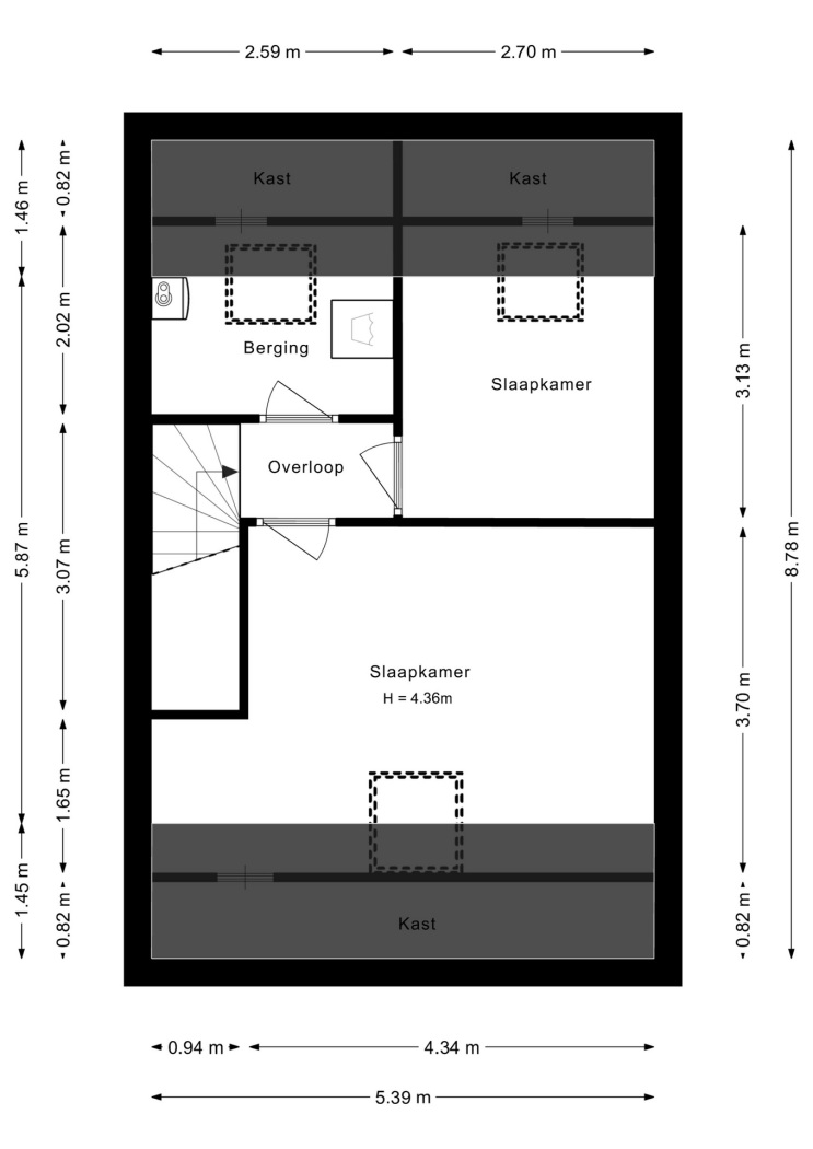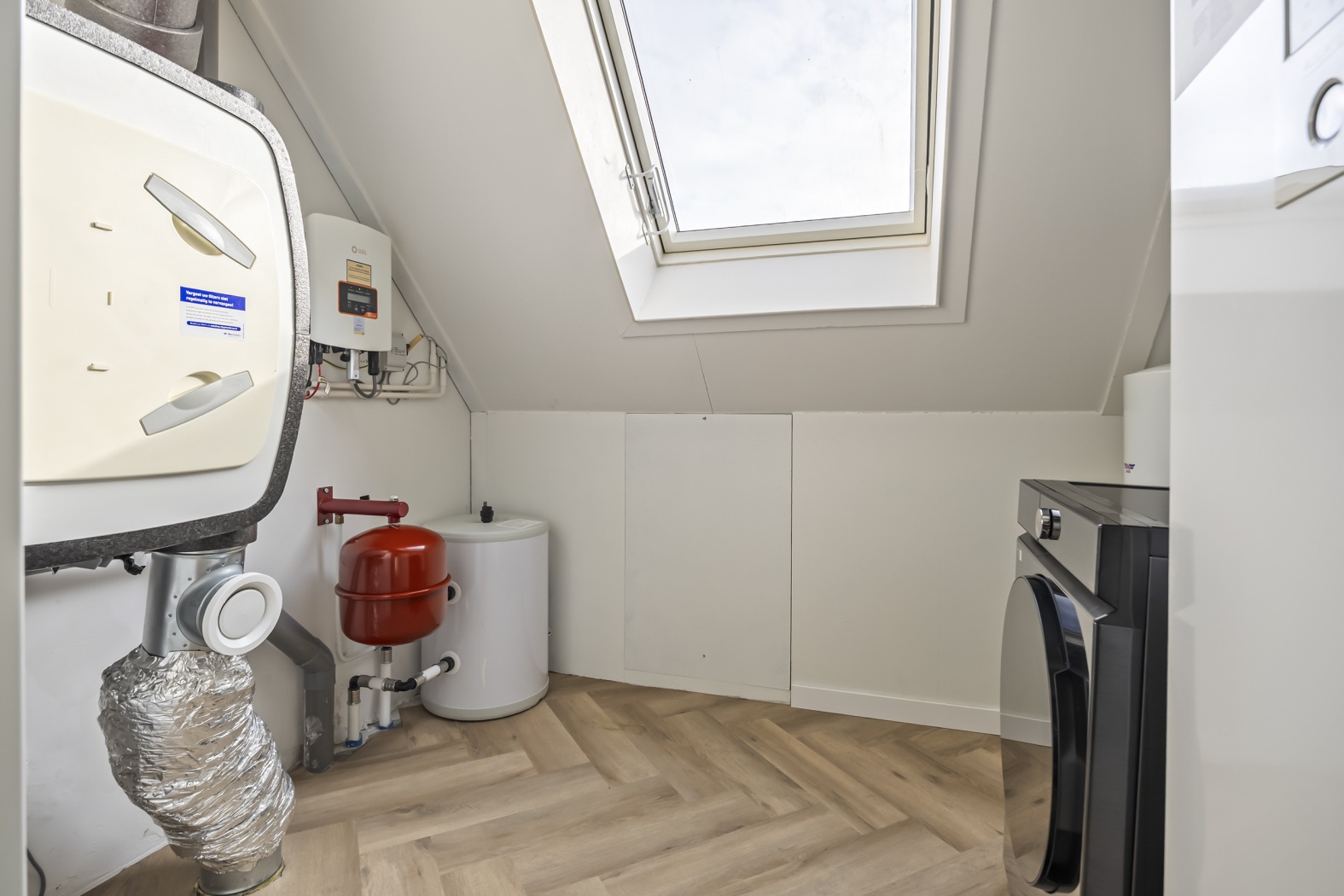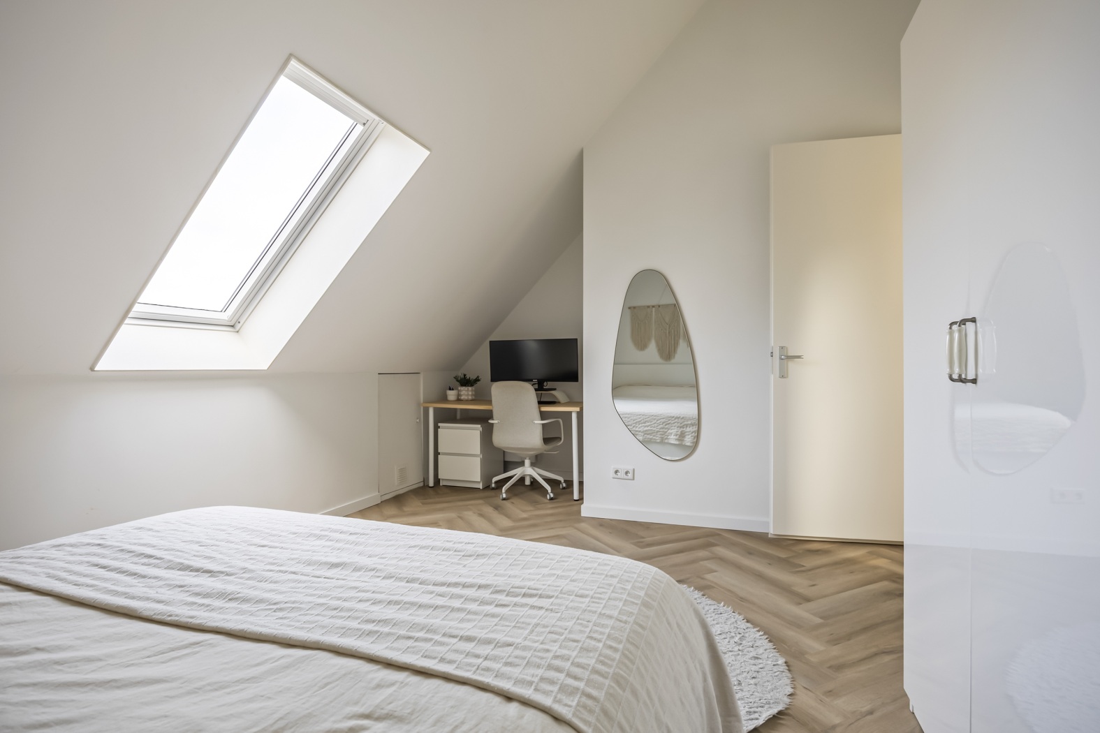 De tweede verdieping verrast opnieuw. Hier zijn nog twee slaapkamers te vinden: één ruime en één kleinere, waarbij het hoge dak direct in het oog springt en zorgt voor een indrukwekkend ruimtelijk gevoel. Daarnaast is er een praktische wasruimte met volop extra opbergruimte.