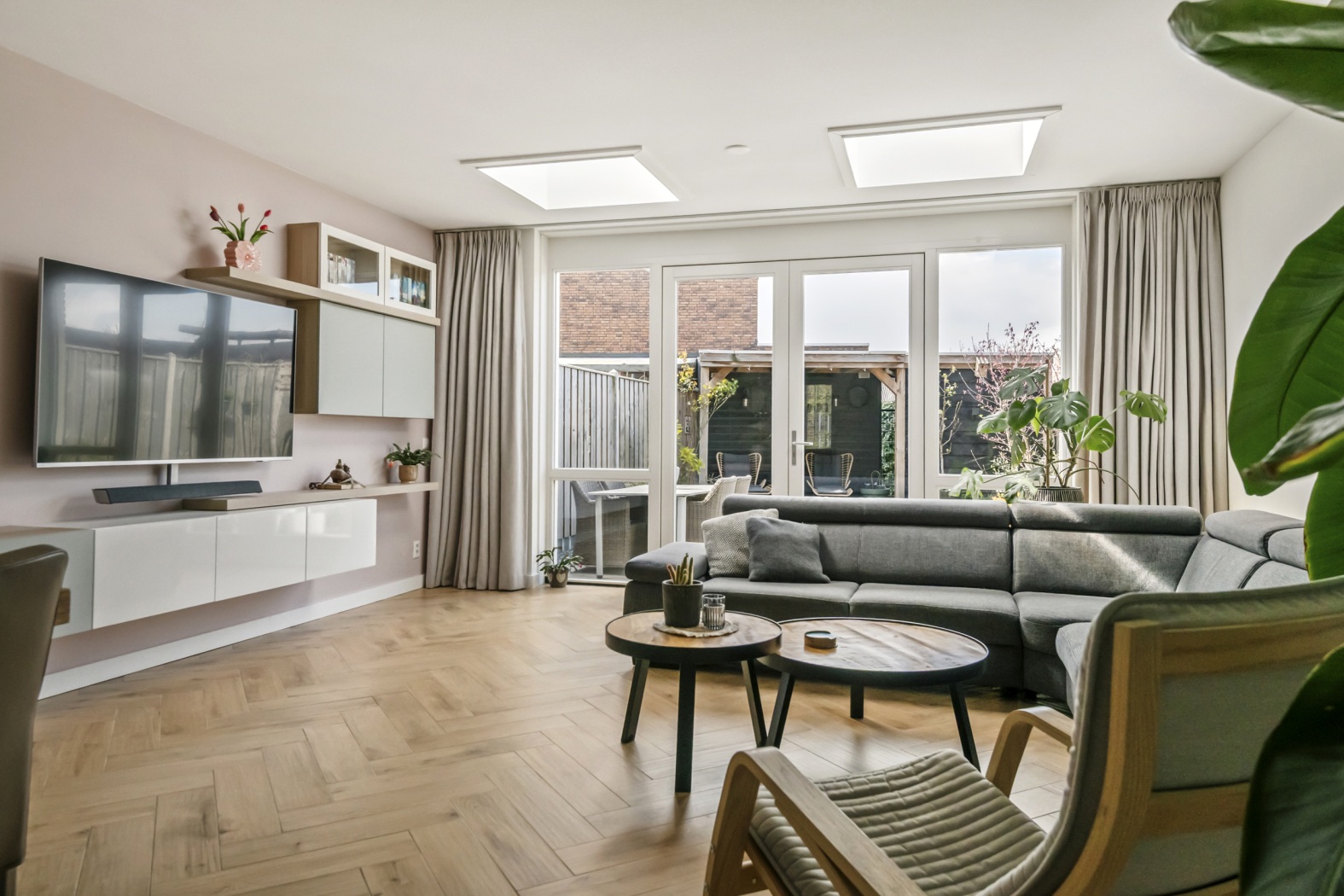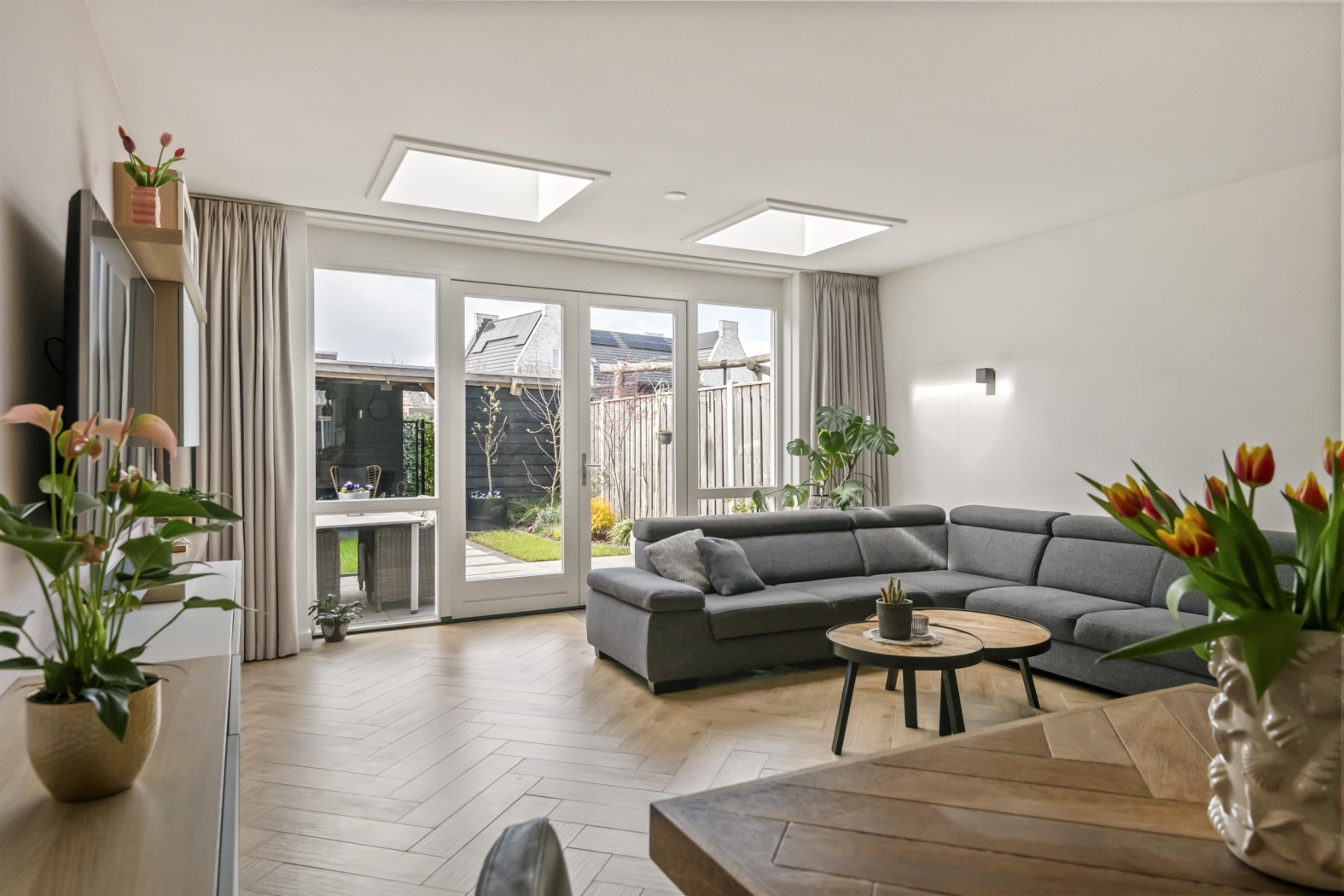 De woning is over de volledige breedte uitgebouwd (2,5 meter) en verrijkt met twee daklichten, waardoor het daglicht rijkelijk naar binnen stroomt en een heerlijk gevoel van ruimte en openheid ontstaat. Dubbele openslaande deuren zorgen voor een naadloze verbinding met de tuin en laten binnen en buiten moeiteloos in elkaar overlopen.