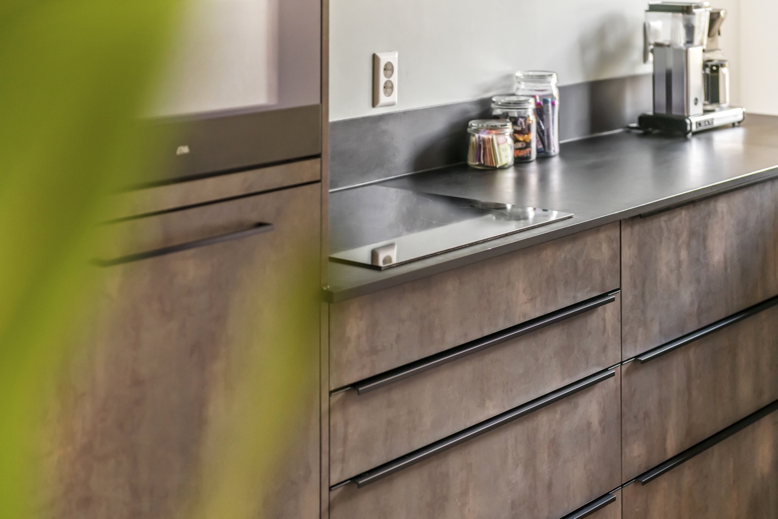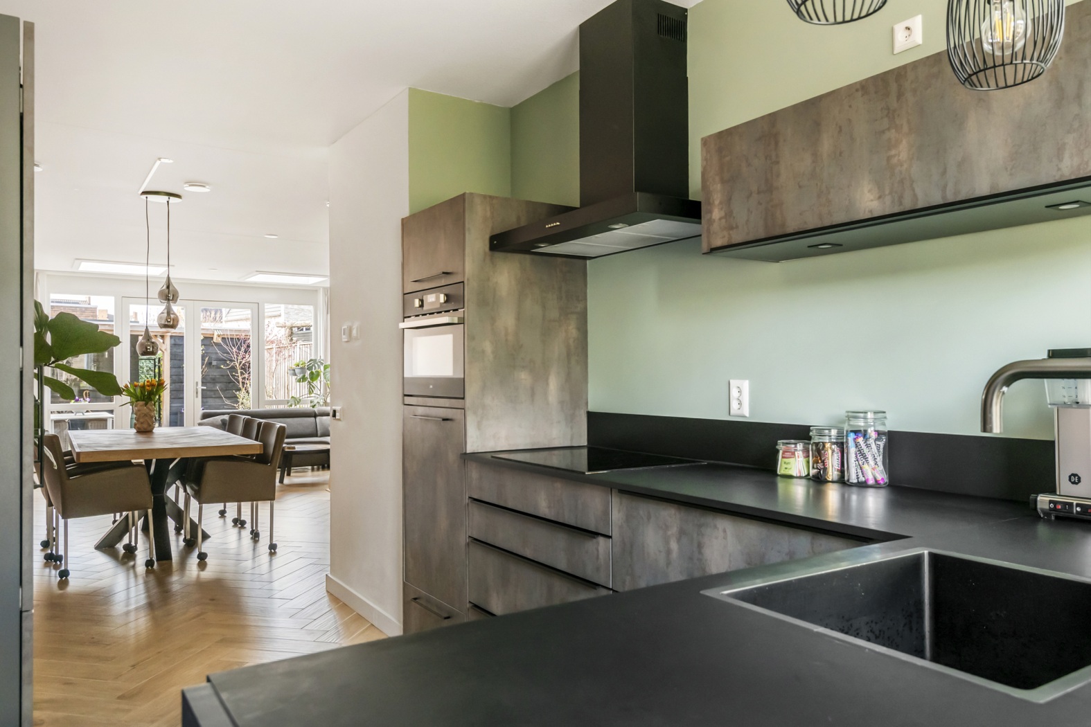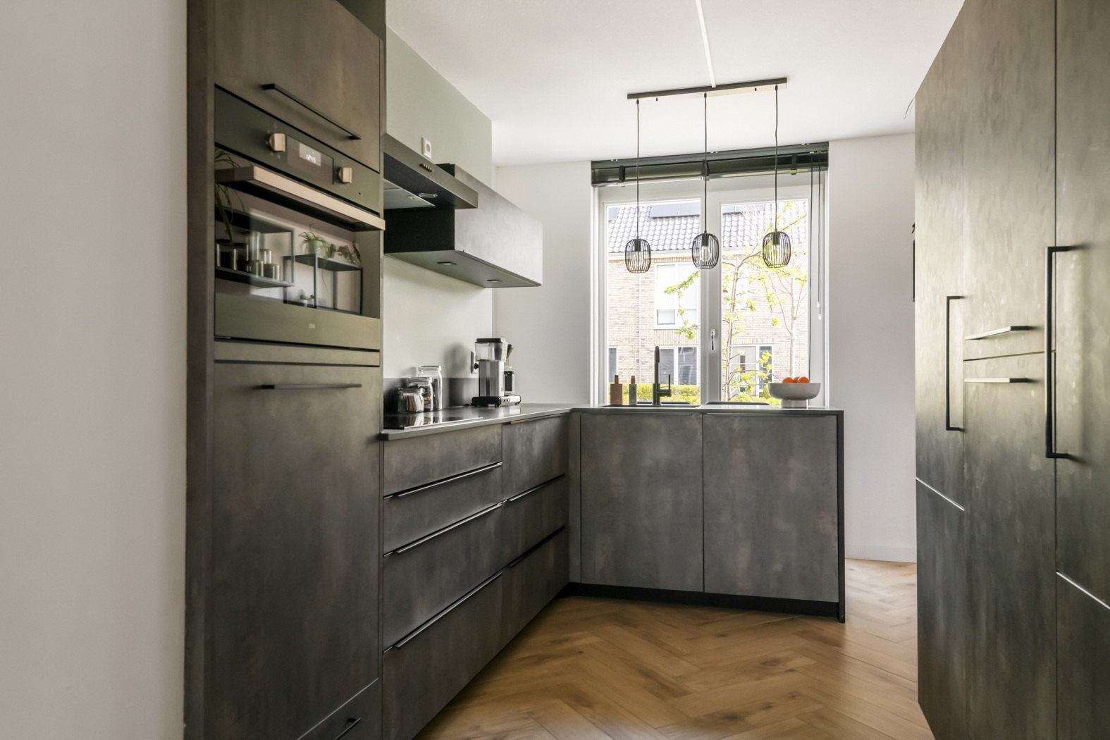 Aan de voorzijde bevindt zich de stijlvolle en functionele keuken, uitgevoerd in een praktische L-vorm met een elegante apparatenkast. De keuken is compleet uitgerust met moderne inbouwapparatuur, waaronder een inductiekookplaat, afzuigkap, combi oven, koelkast, vriezer en vaatwasser. Een plek waar design en gebruiksgemak perfect samenkomen — hier wordt koken iedere dag een plezier.