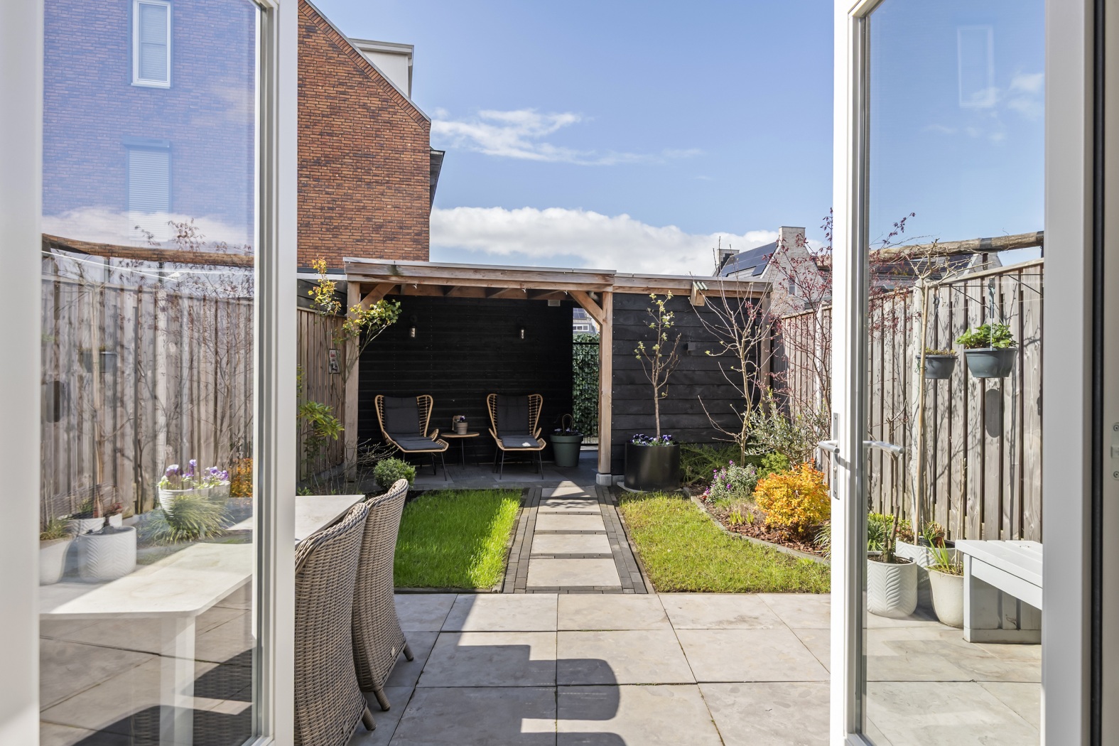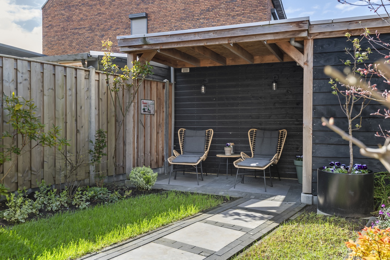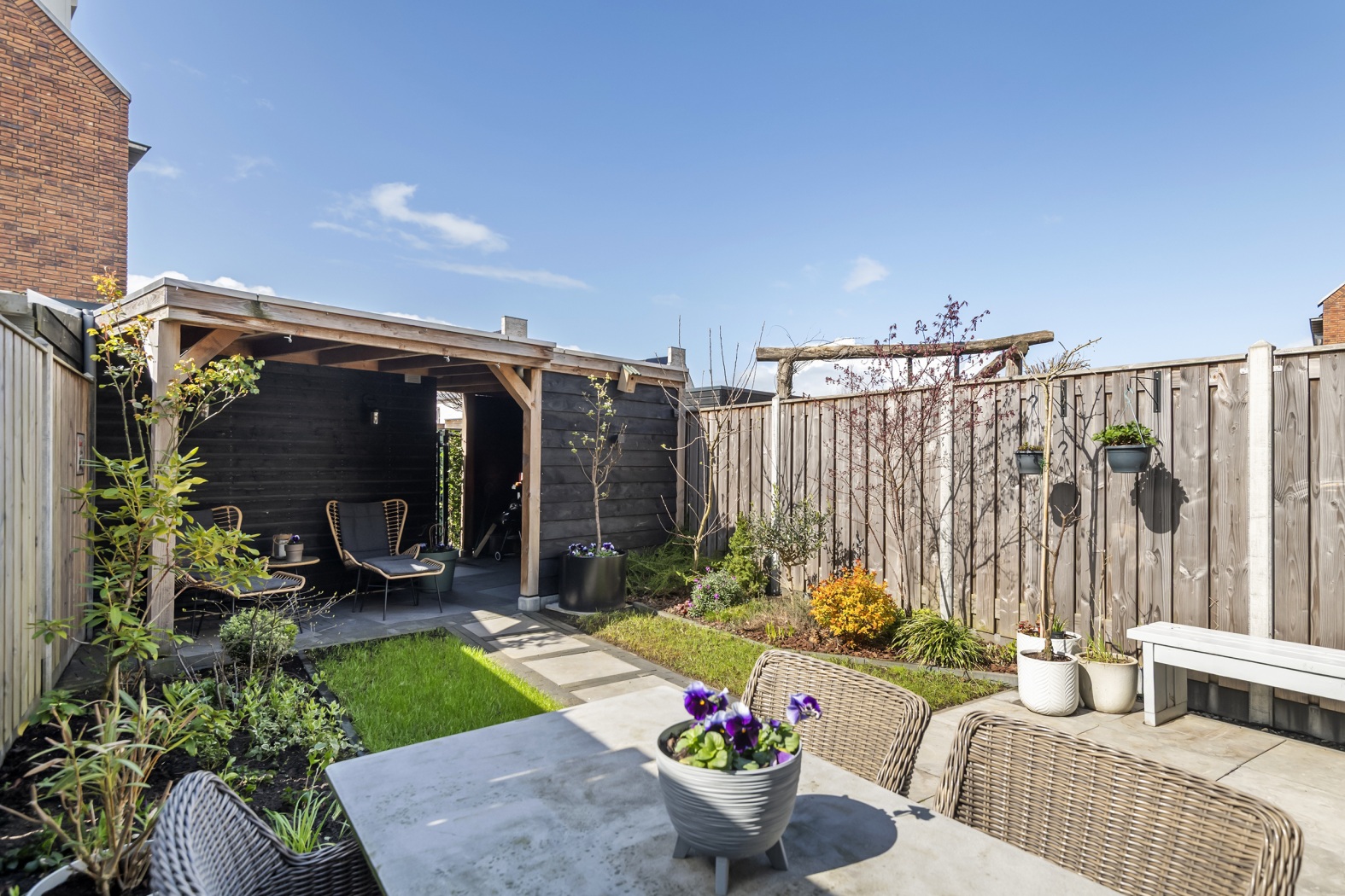 •Zonnige achtertuin met berging en sfeervolle overkapping