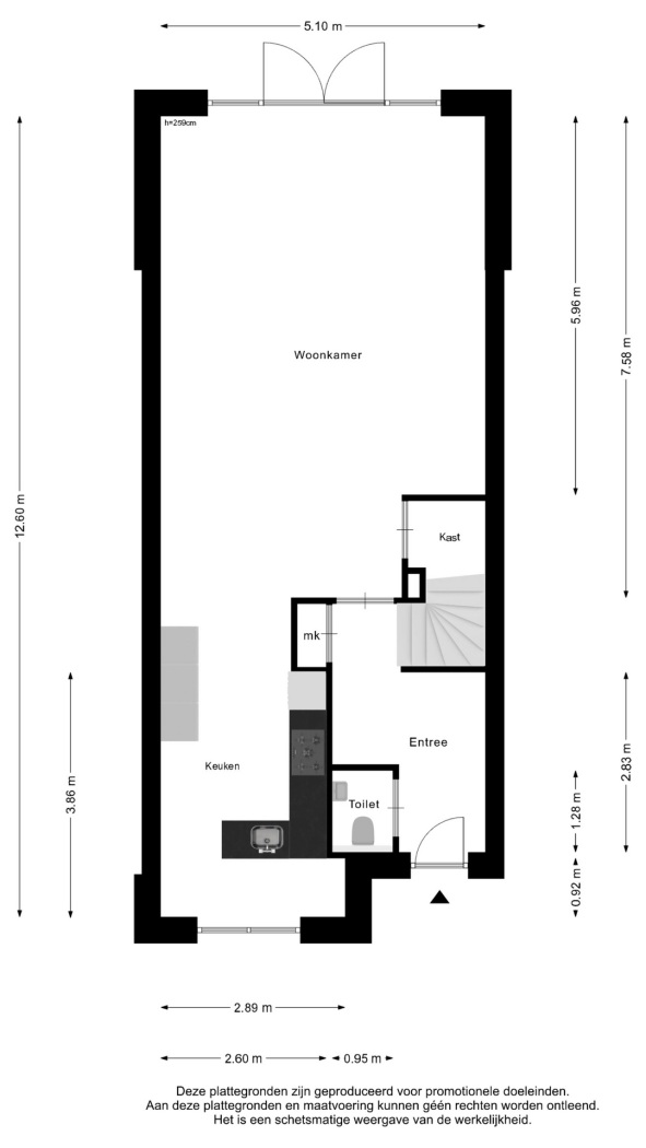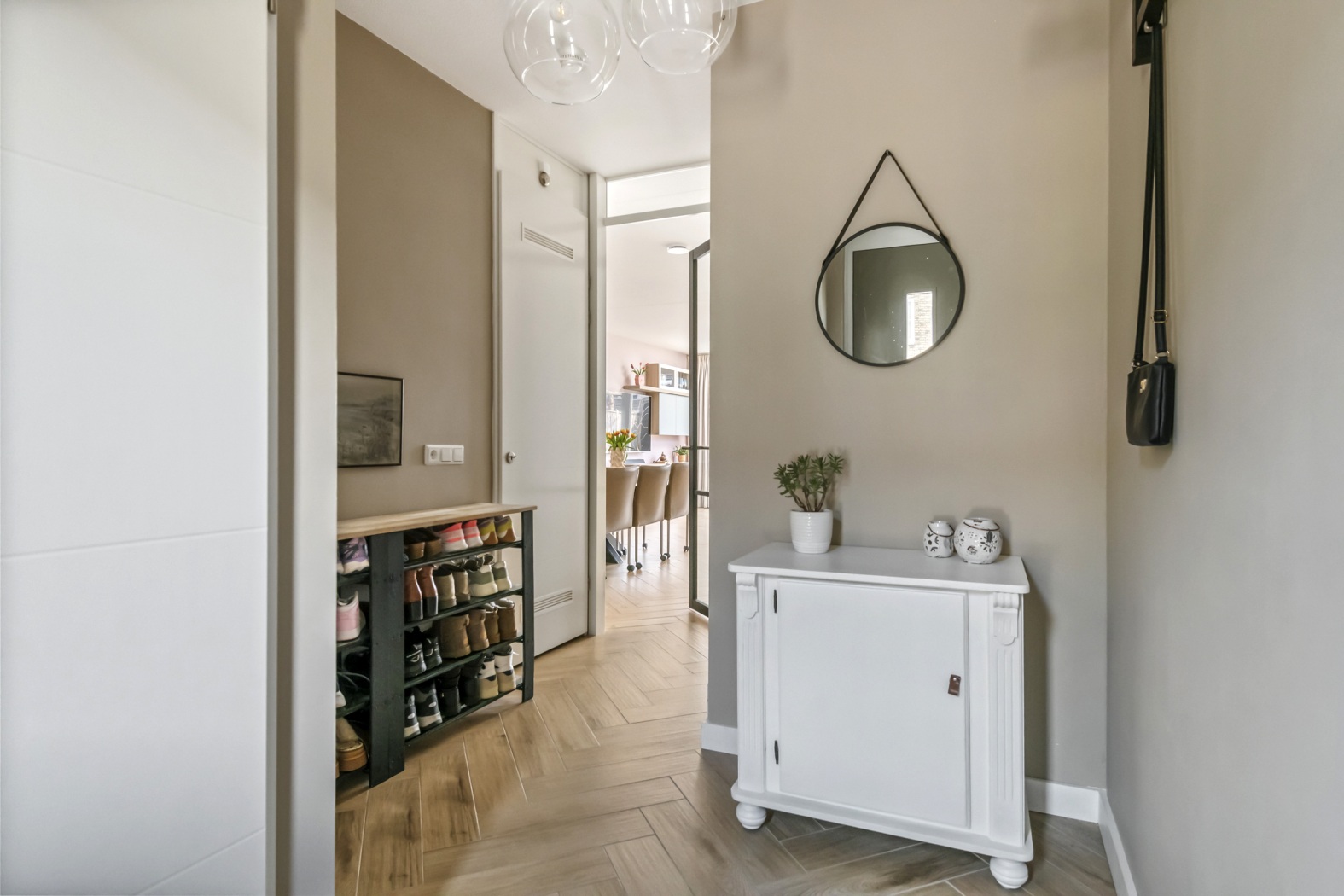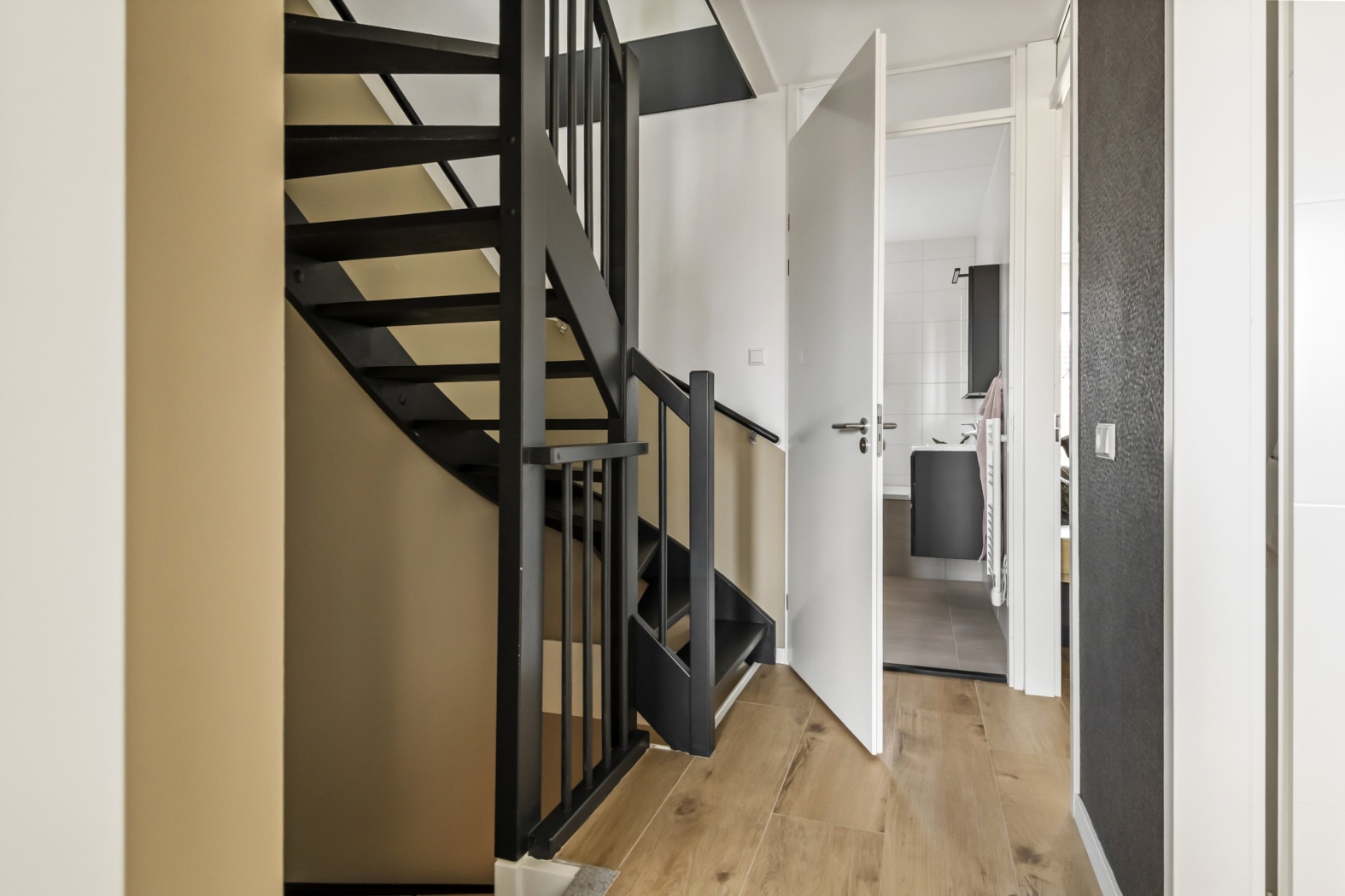 De hal verleent toegang tot de woonkamer, de toiletruimte, meterkast en de trapopgang naar de verdieping. Via een zwarte taatsdeur is het leefgedeelte bereikbaar.