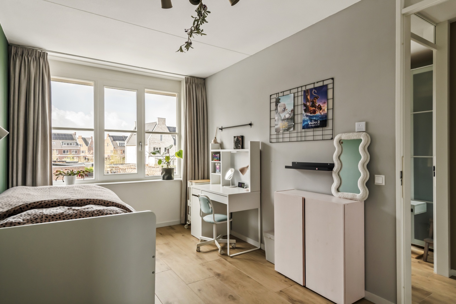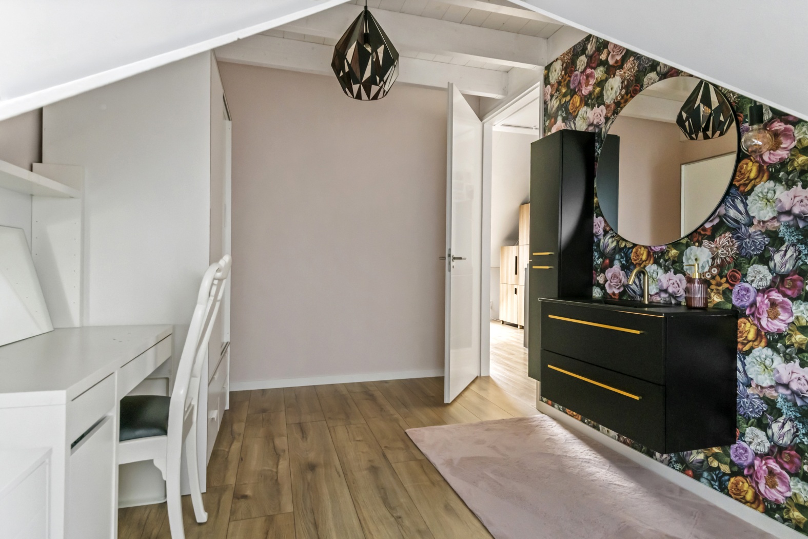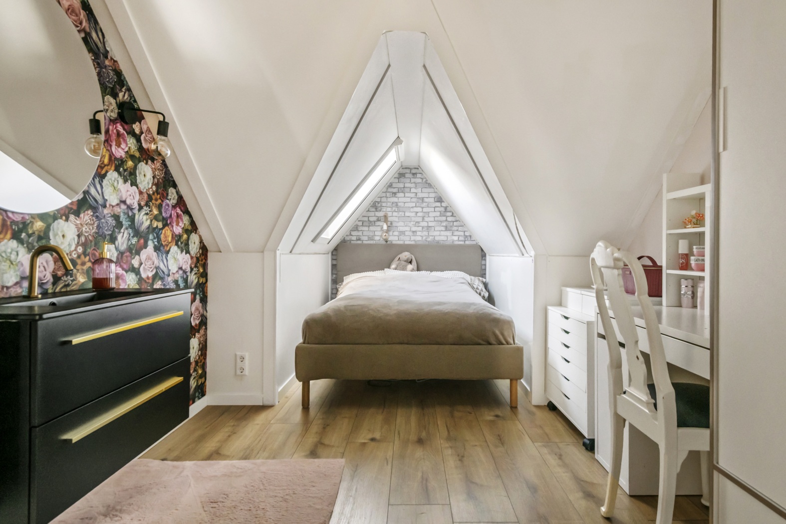 Vanaf de overloop heb je toegang tot twee fijne slaapkamers, beide voorzien van dakramen die zorgen voor een lichte en prettige sfeer. Eén van de kamers springt eruit door de speelse, uitspringende kap met puntdak en dakraam, wat zorgt voor extra karakter en een knusse uitstraling.