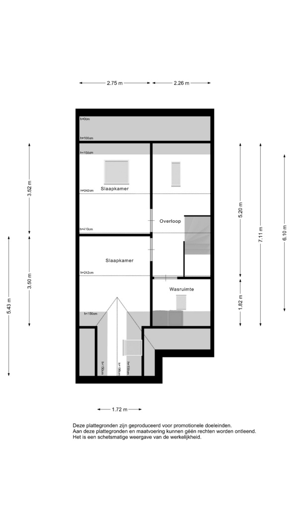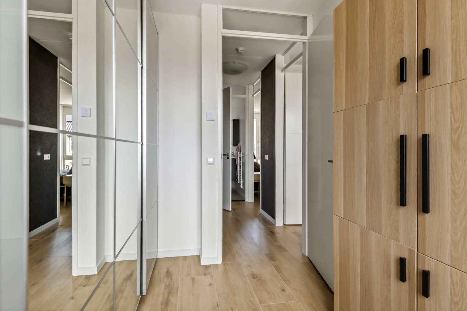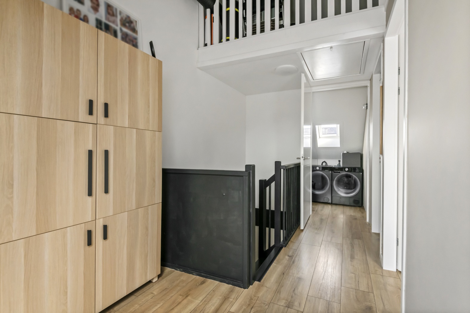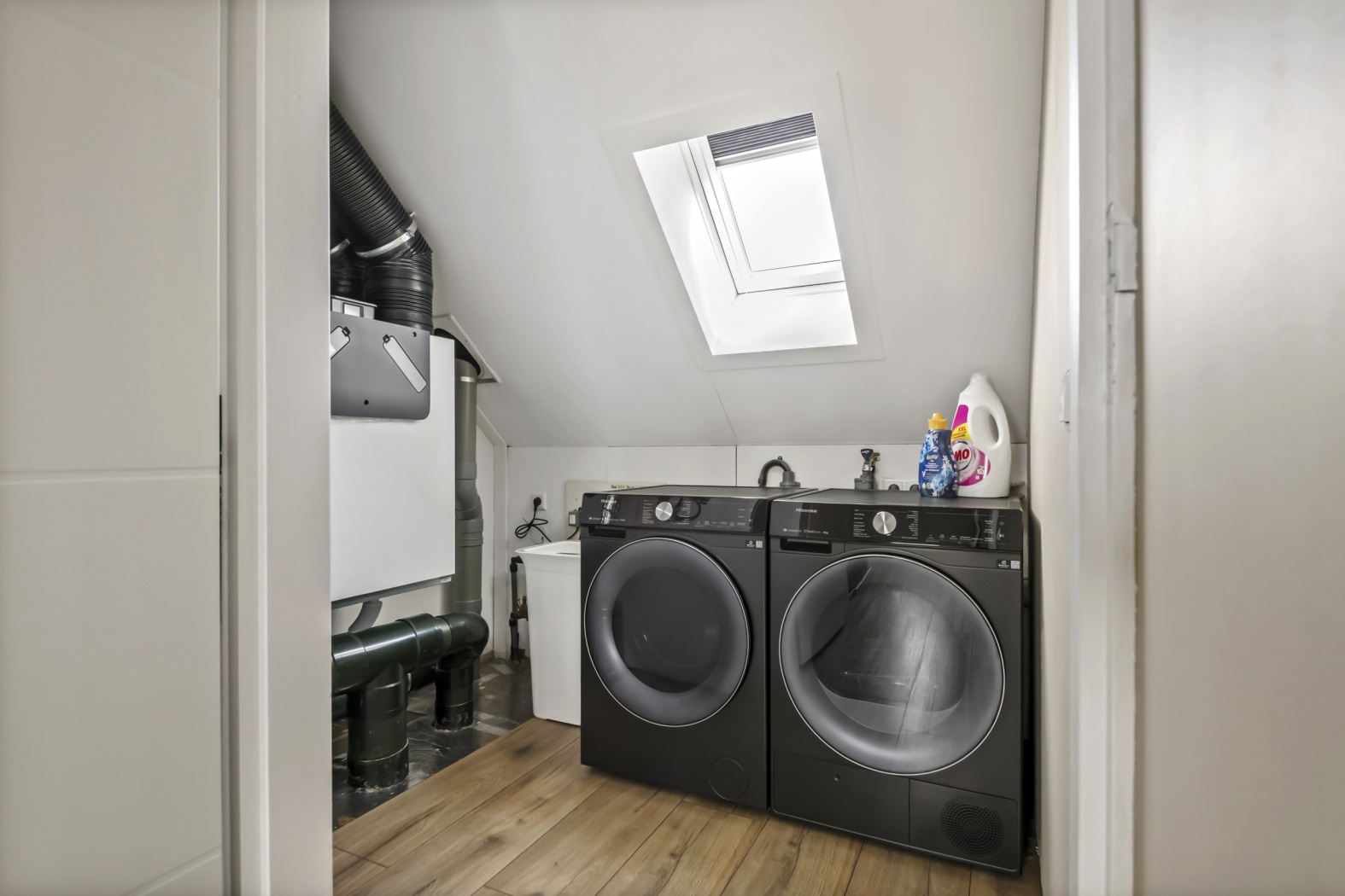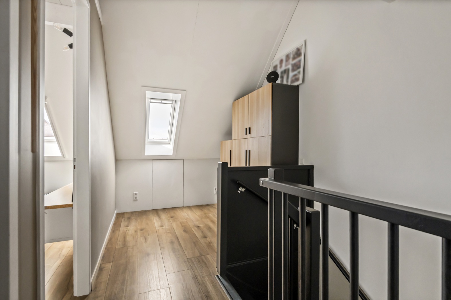 De tweede verdieping biedt een verrassende hoeveelheid ruimte en comfort. Op de overloop zorgt een dakraam voor een prettige lichtinval en via een vlizotrap bereik je de praktische open zolder vide met bergruimte. Daarnaast bevindt zich hier een aparte ruimte voor de wasmachine en droger, evenals de opstelplaats van de warmteterugwininstallatie (WTW).