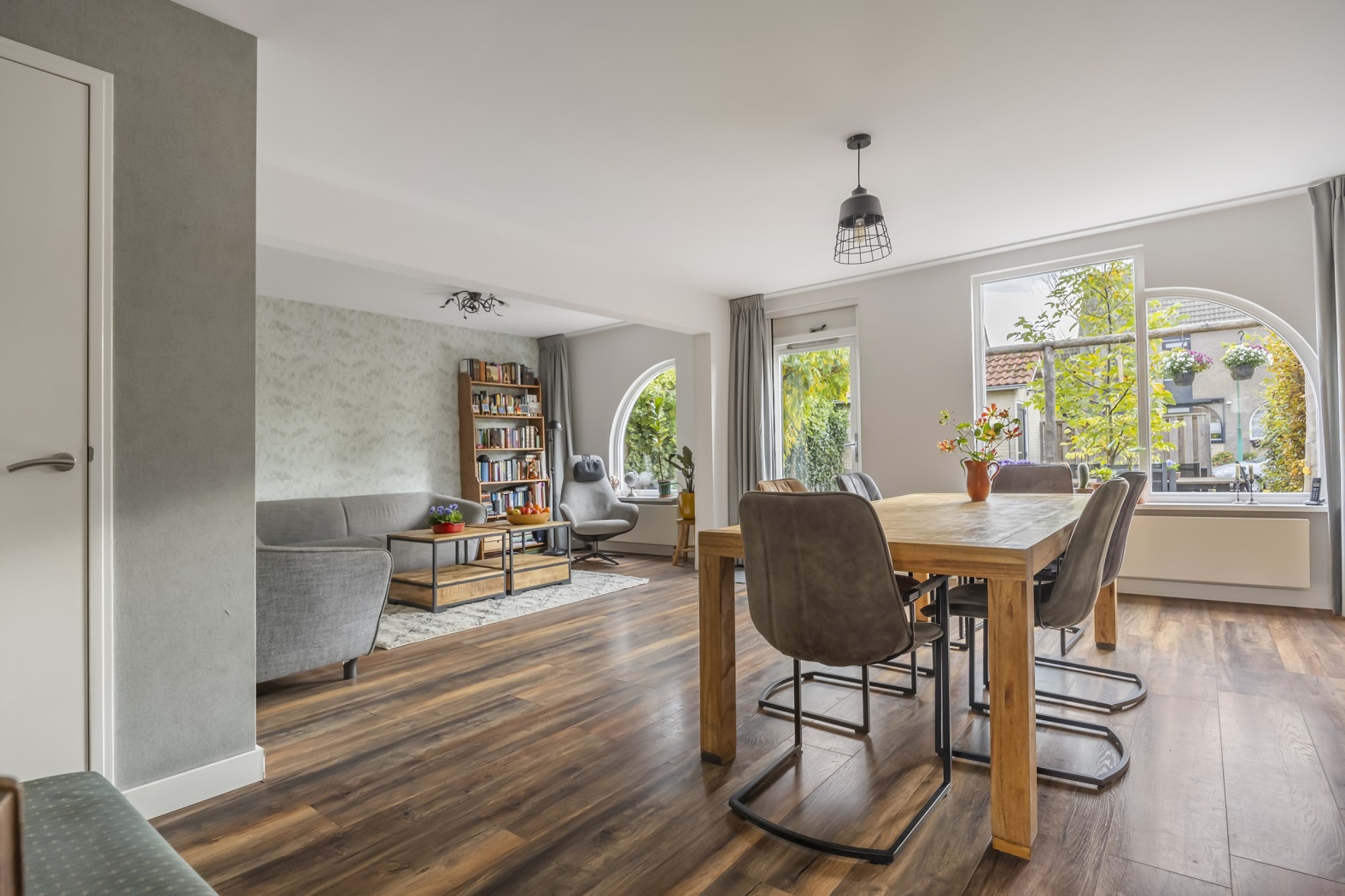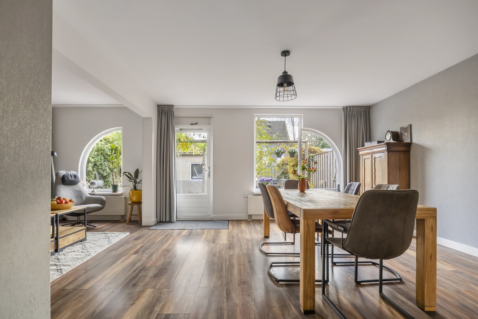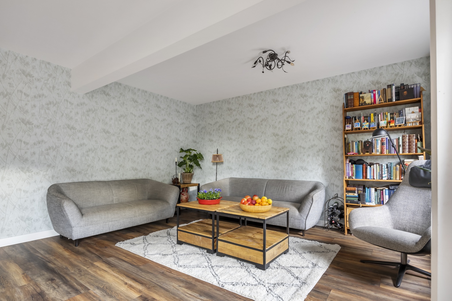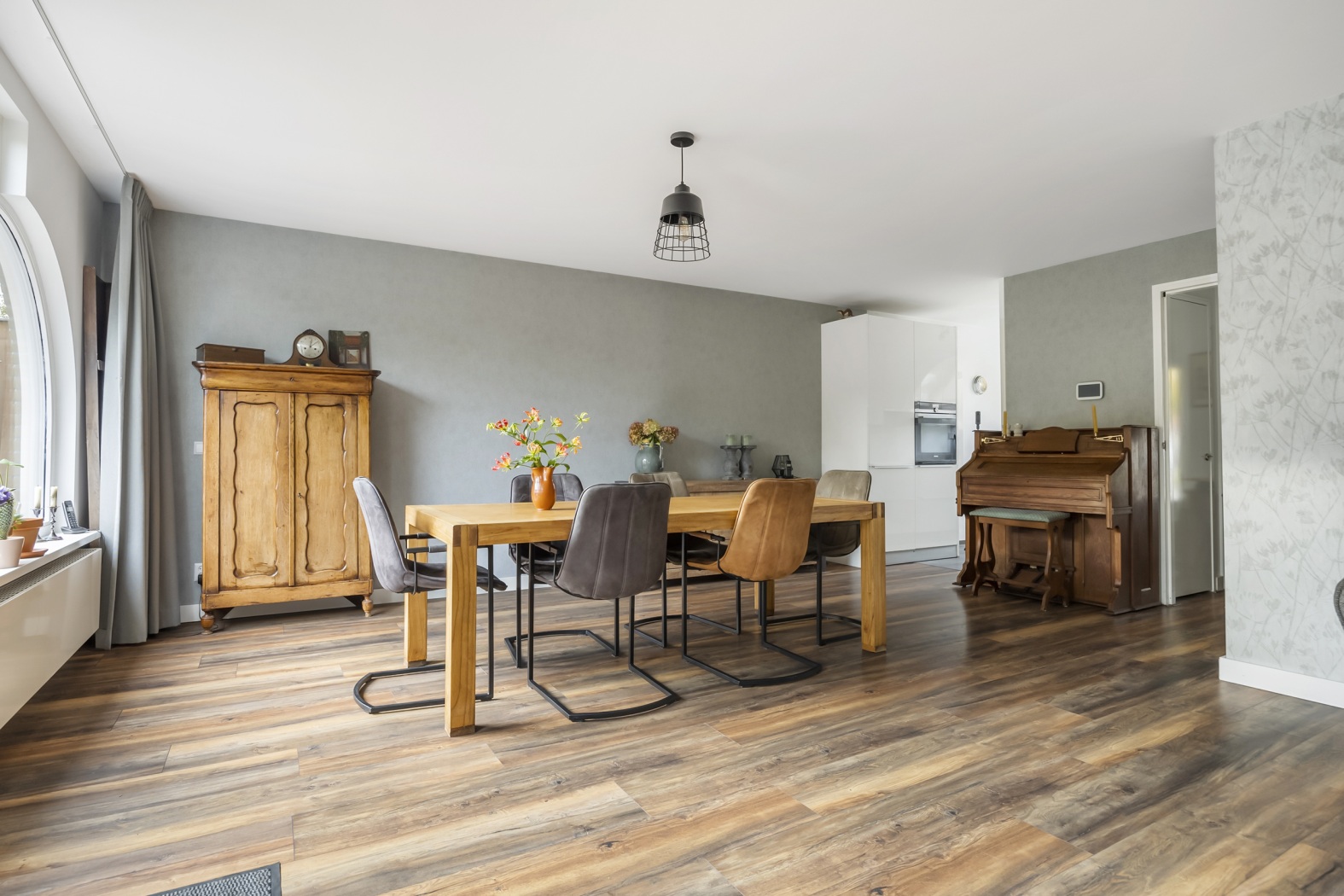 De woonkamer biedt ruimte voor een comfortabele zithoek en een royale eettafel, waardoor dit een aangename leefruimte is waar wonen en samenzijn centraal staan.