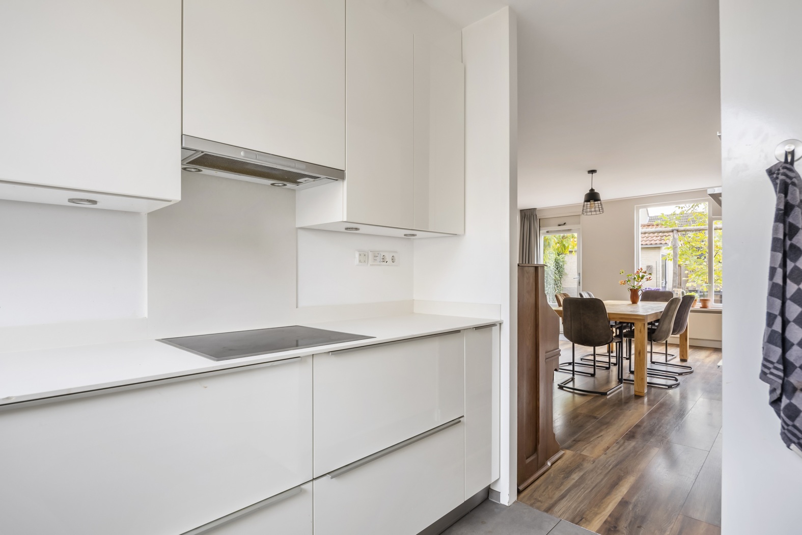 De open keuken is uitgevoerd in hoogglans wit en geplaatst in een praktische hoekopstelling. Door het grote raam valt er veel daglicht binnen en heeft u fijn zicht naar buiten tijdens het koken. De keuken biedt volop opbergruimte en is afgewerkt met een nette tegelvloer.