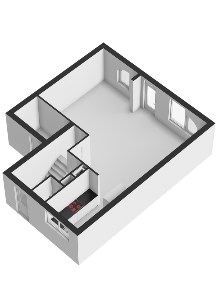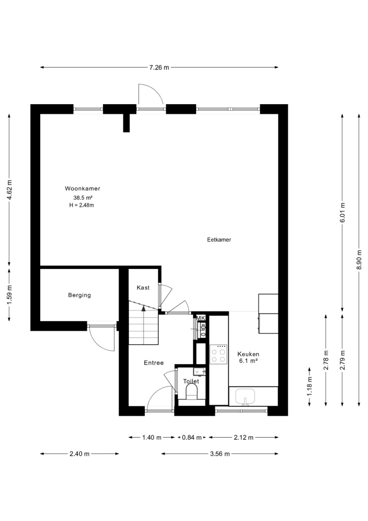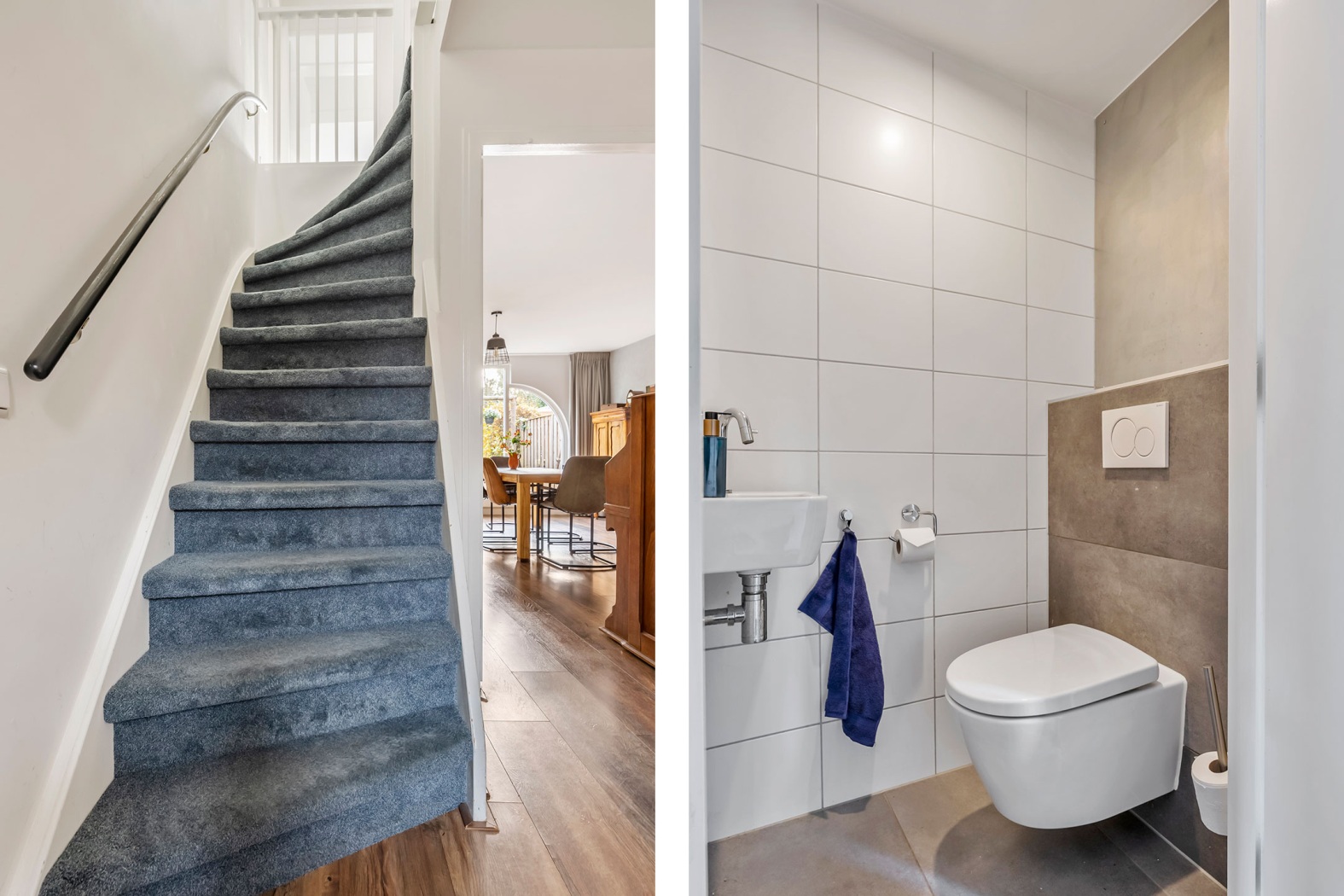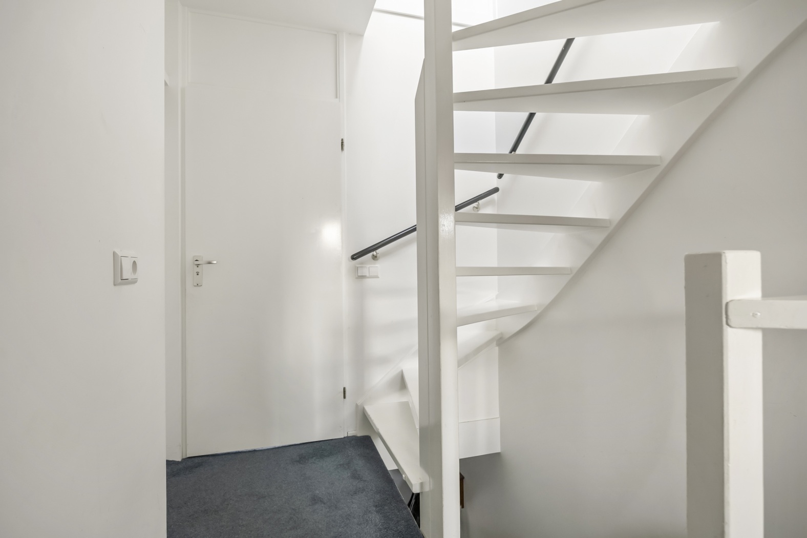 De entree verleent toegang tot de woonkamer, de toiletruimte, de meterkast en de trapopgang naar de verdieping.