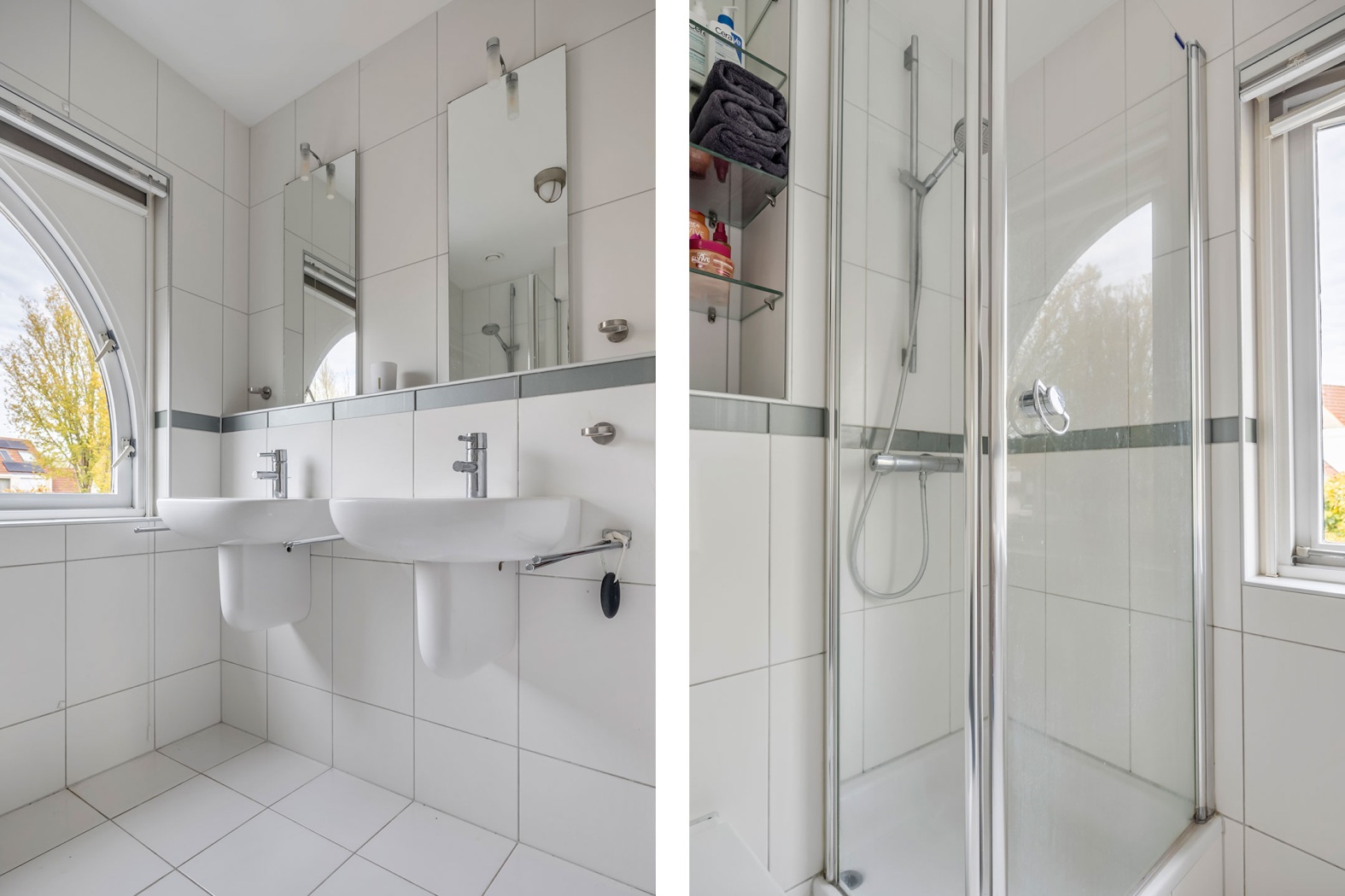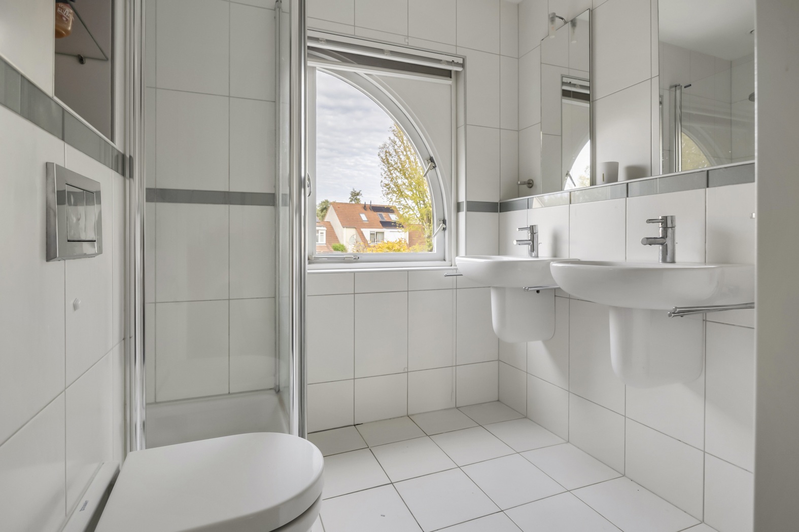De badkamer is praktisch ingericht en voorzien van een dubbele wastafel, een toilet en een douchecabine. Het grote raam zorgt voor een fijne lichtinval en natuurlijke ventilatie, waardoor de ruimte fris en aangenaam aanvoelt. Een functionele badkamer die voldoet aan de dagelijkse behoeften.