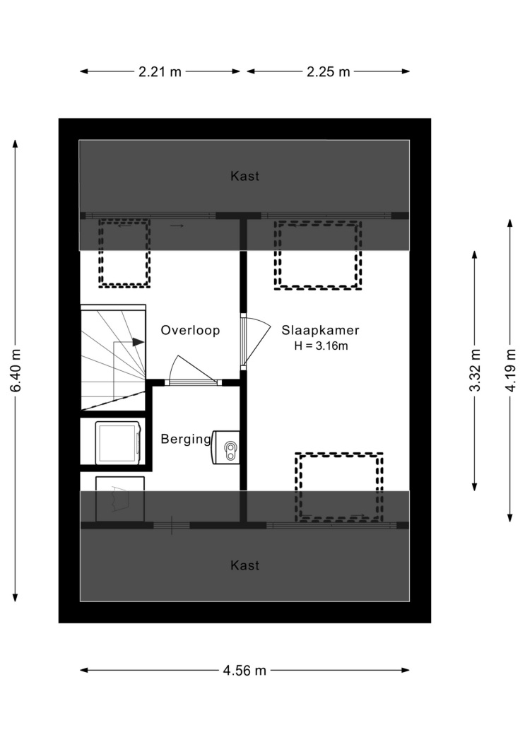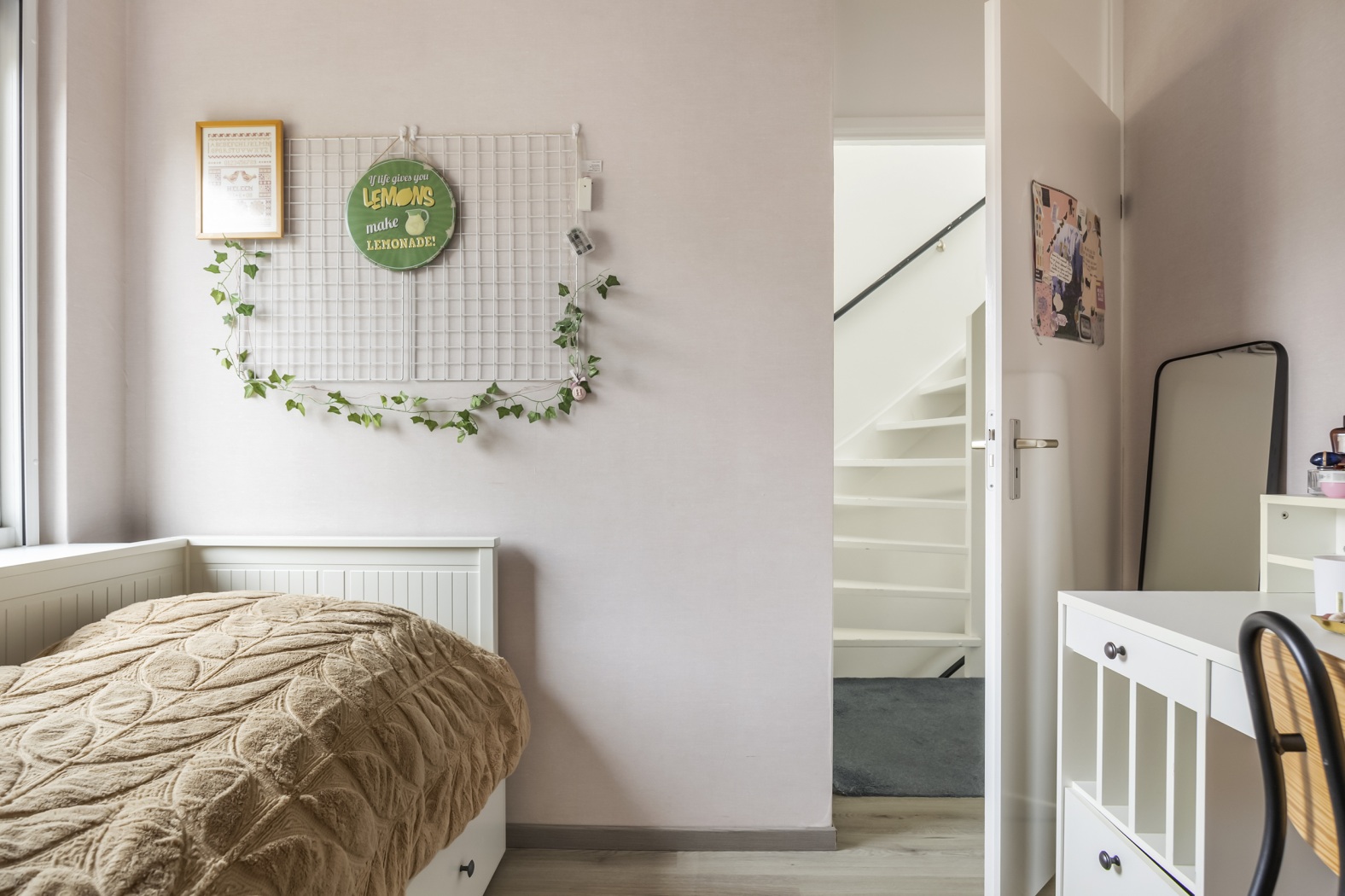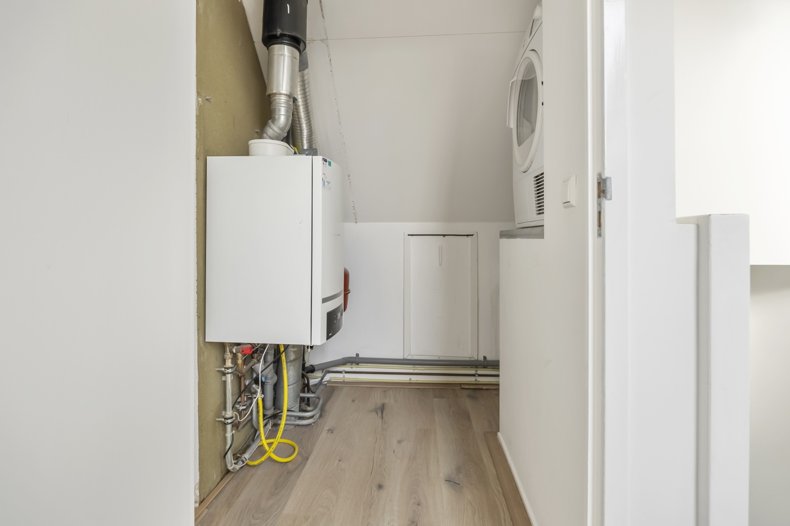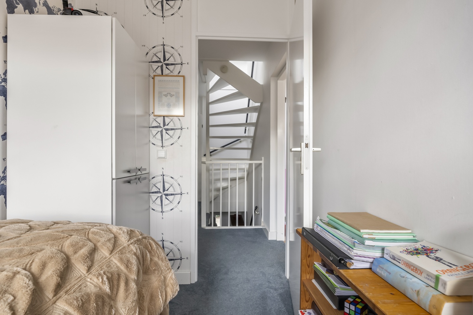 De tweede verdieping is bereikbaar via een vaste trap en biedt een praktische indeling. Vanaf de overloop is toegang tot een aparte berging waar de cv-ketel is geplaatst en ruimte is voor zowel de wasmachine als de droger. Hierdoor blijft alles netjes uit het zicht en blijft de verdieping overzichtelijk en functioneel.