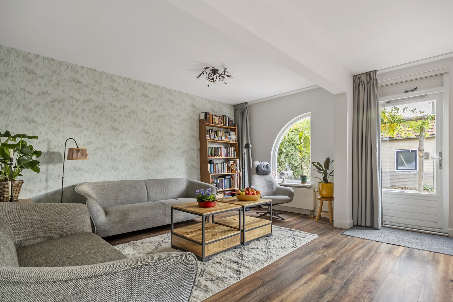 De woonkamer van ca. 39 m² is heerlijk licht dankzij de grote raampartijen met zicht op de achtertuin. De donkerdere vloer benadrukt de sfeervolle uitstraling en geeft de ruimte direct een huiselijke sfeer.