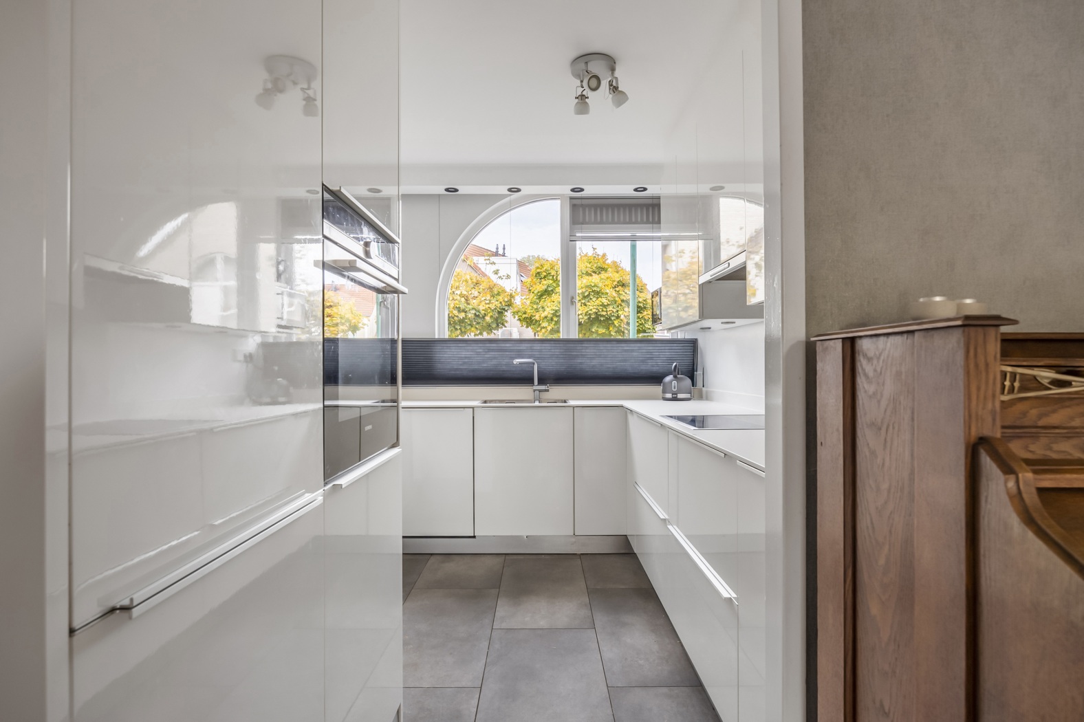 - Open keuken met hoogglans witte afwerking en kastenwand met inbouwapparatuur