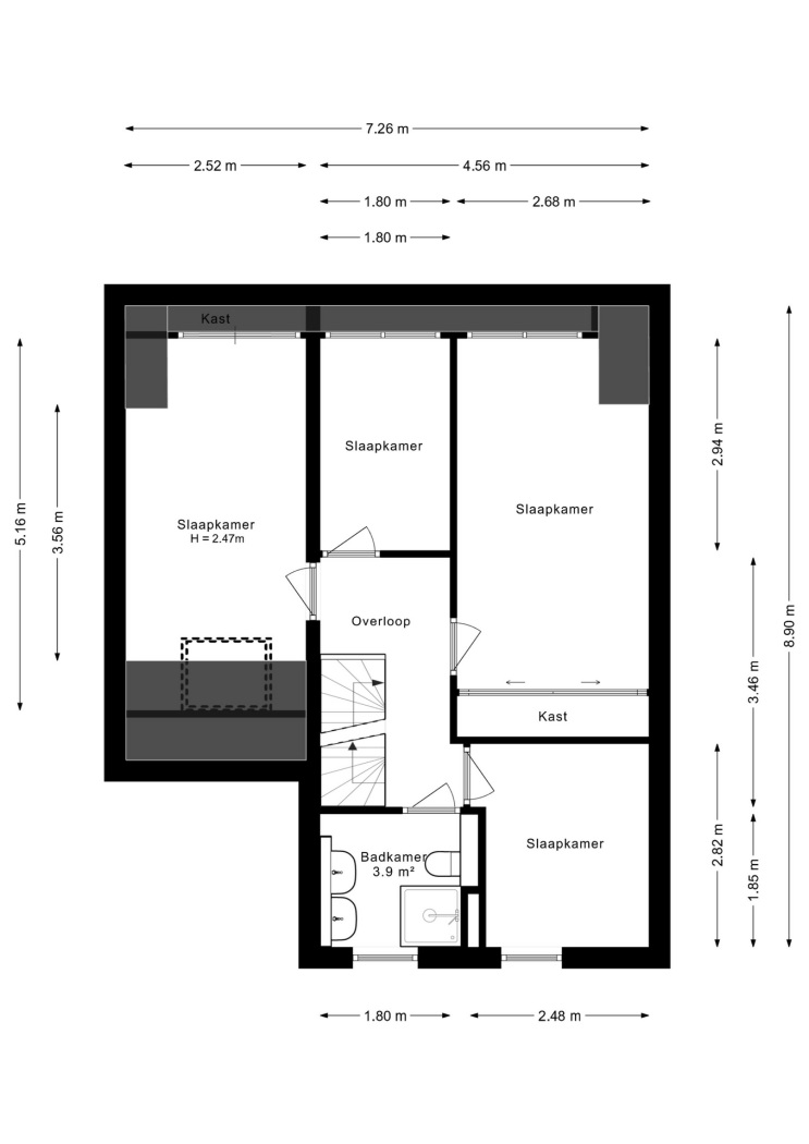 Vanaf de overloop is er toegang tot de slaapkamers en de badkamer, en bevindt zich de vaste trap naar de tweede verdieping. Hierdoor is ook de zolderverdieping gemakkelijk en volwaardig te gebruiken.