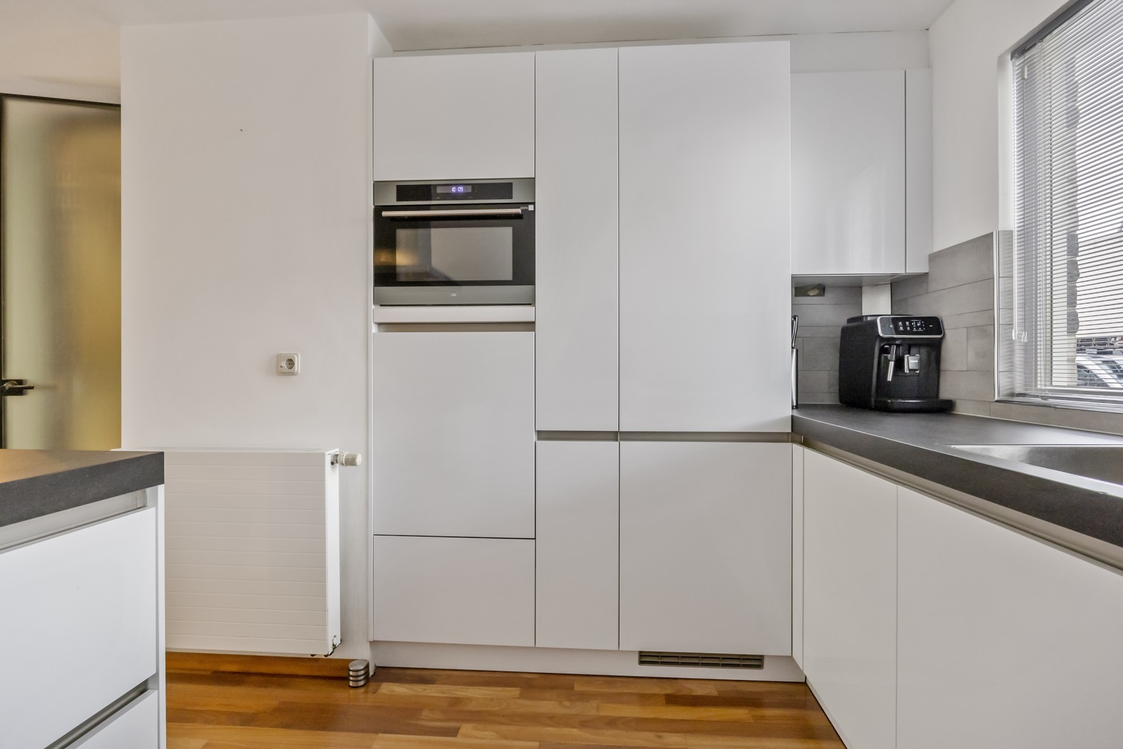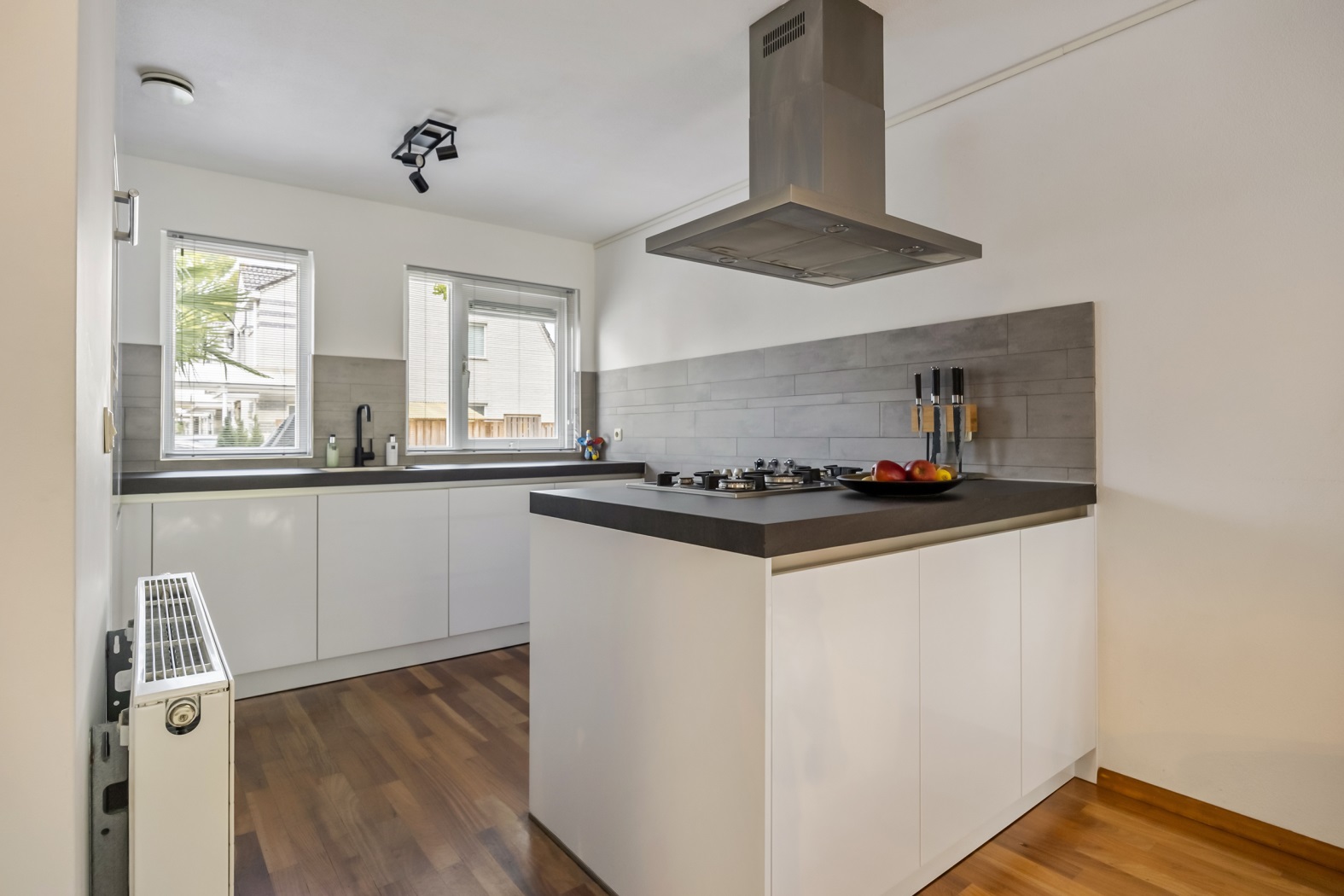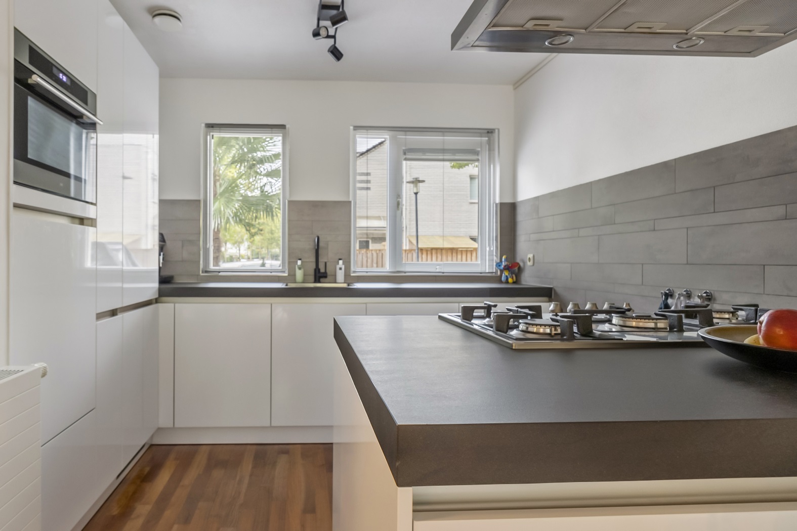 De keuken bevindt zich aan de voorzijde en kijkt, dankzij twee ramen, gezellig uit over de straat. Het moderne ontwerp in strak wit hoogglans oogt fris en ruimtelijk. Het kookeiland vormt het hart van de keuken, met een gaskookplaat en een rvs-afzuigkap die stijlvol aan het plafond hangt. Verder is de keuken uitgerust met een keukenblok onder het raam, een hoge apparatenkast, combi-oven, vaatwasser en koel-vriescombinatie. Alles wat je nodig hebt om hier uitgebreid te koken én gezellig samen te komen.