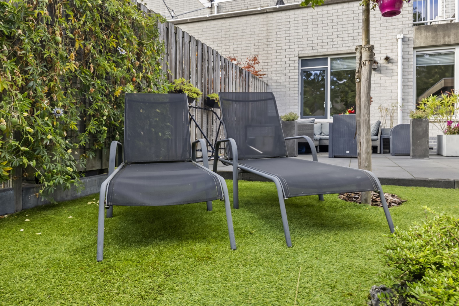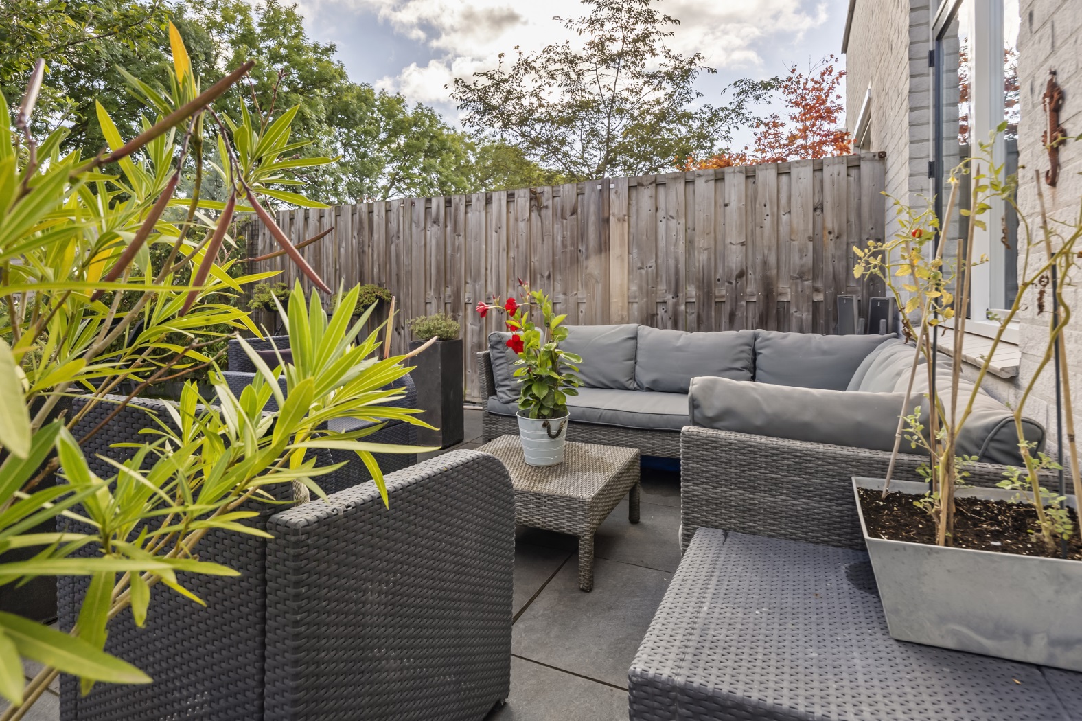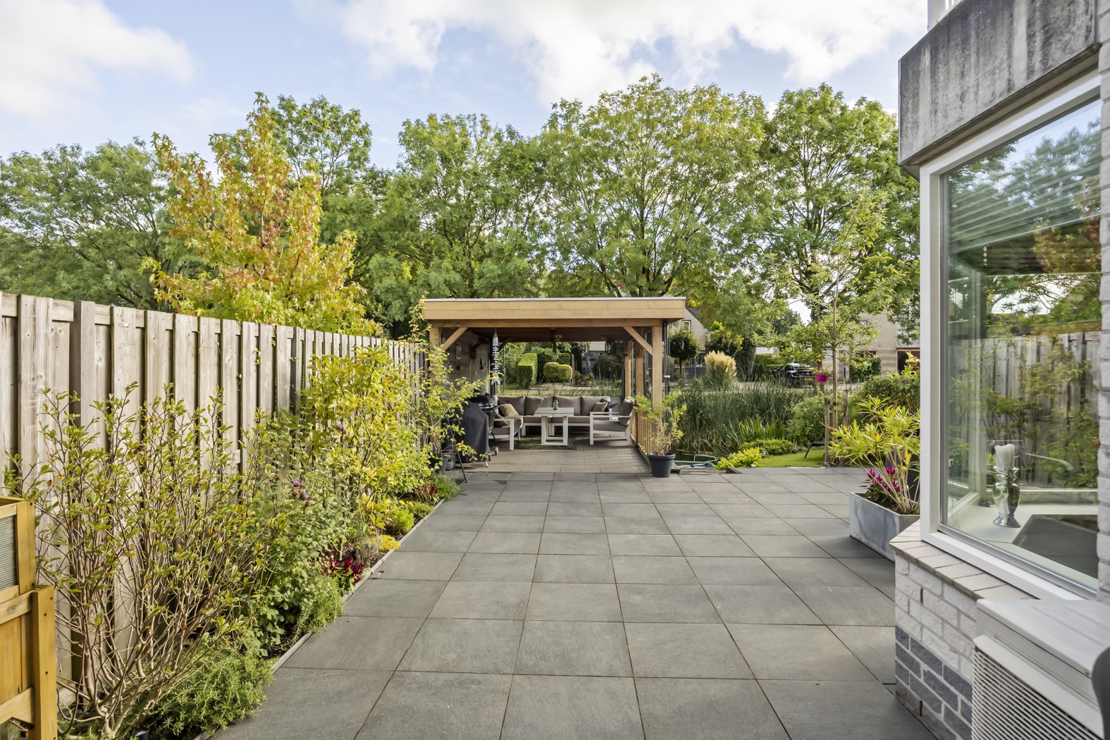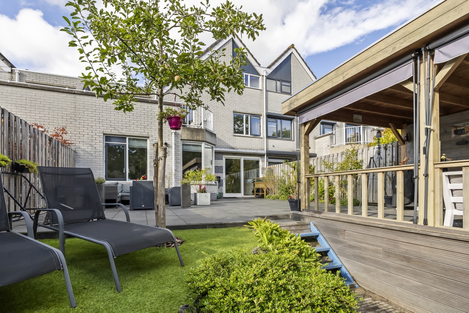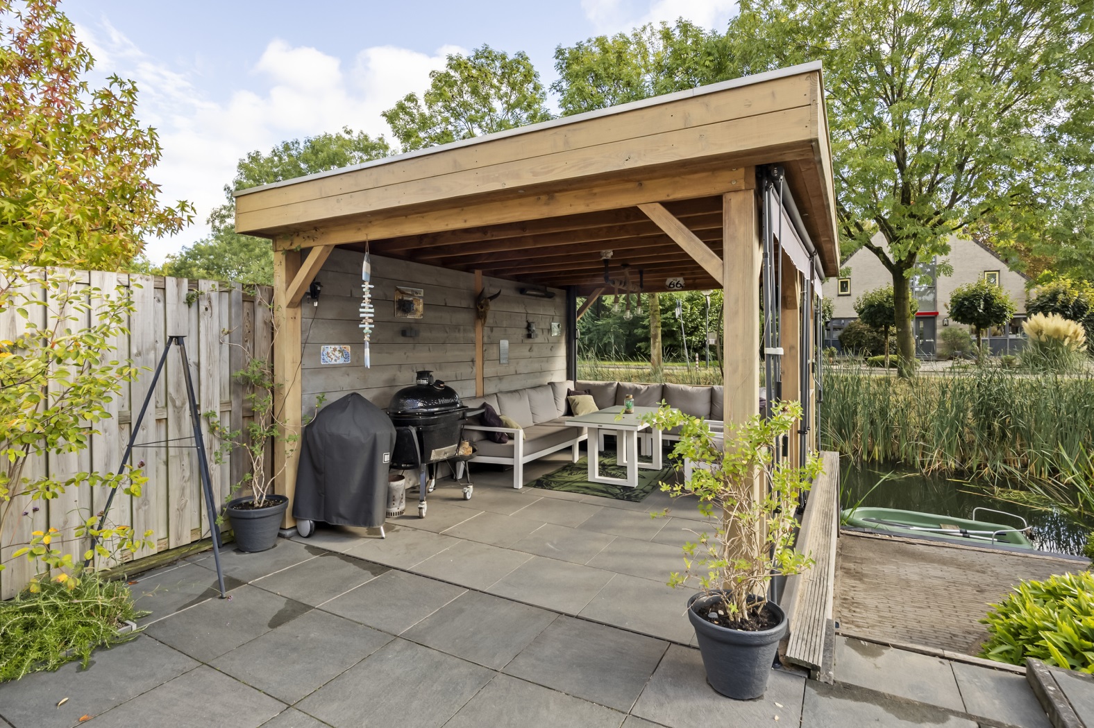 Direct achter de woning vind je een ruim terras met tegels, ideaal voor een lange eettafel of zomerse BBQ. Verder is er een groen gazon en een gezellige terrasoverkapping waar je heerlijk kunt loungen – of schuilen tegen een Hollandse plensbui.