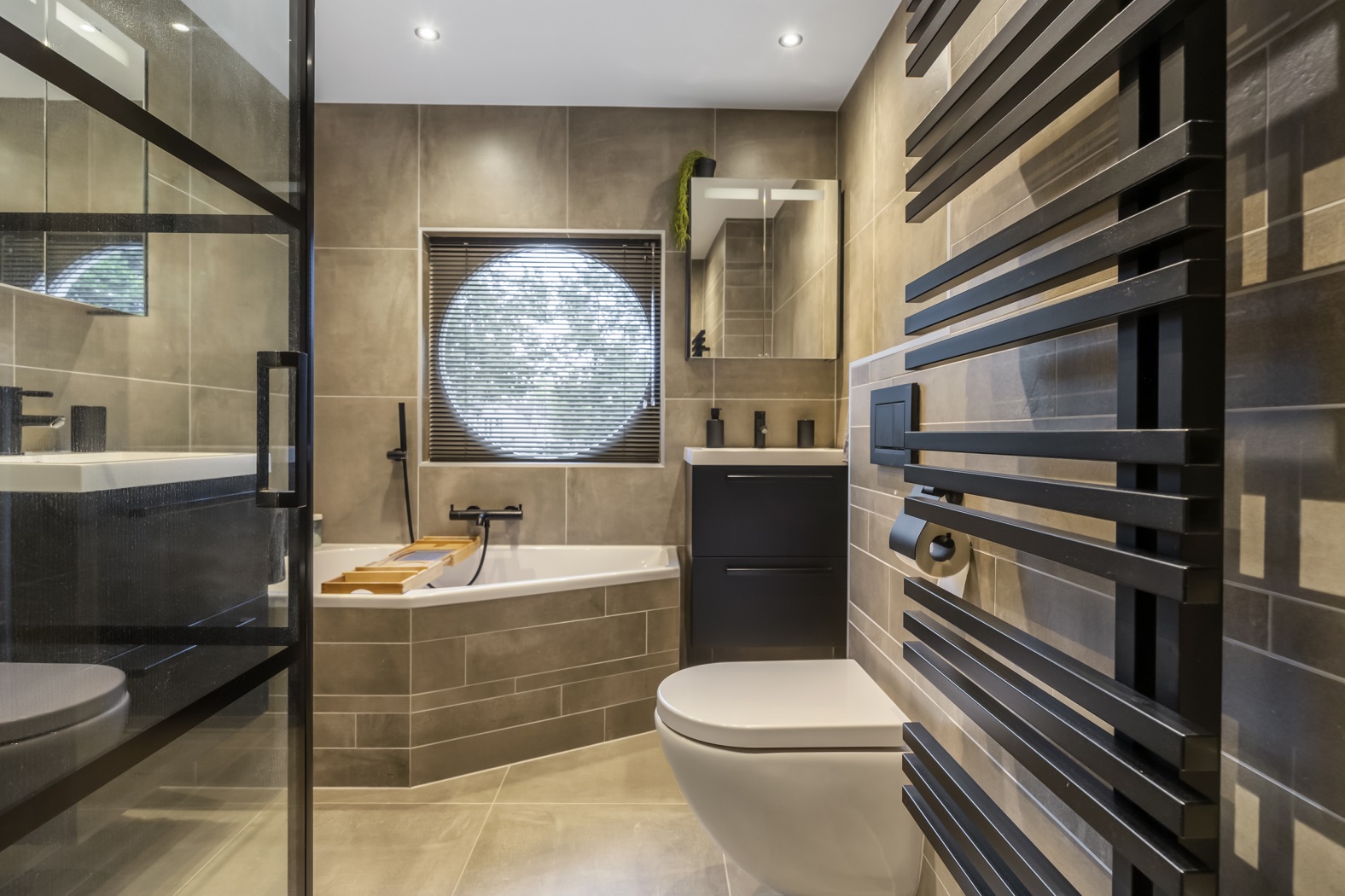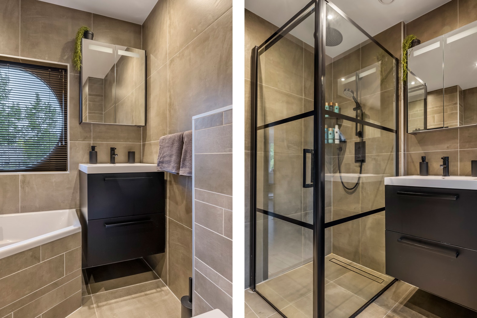 De moderne badkamer is werkelijk een plaatje. Strakke tegels en stijlvolle details geven de ruimte een luxe uitstraling. Een echte eyecatcher is het ronde raam, dat zorgt voor een speels accent én voor natuurlijk licht. Hier geniet je dus niet alleen van comfort, maar ook van een bijzondere sfeer.