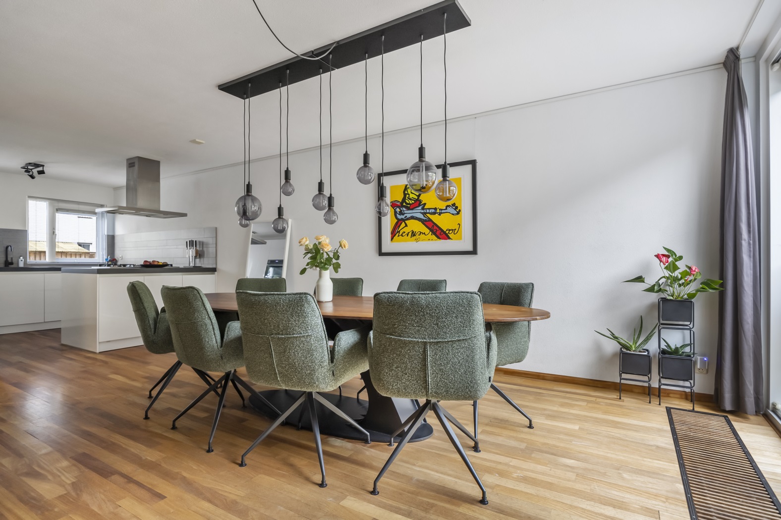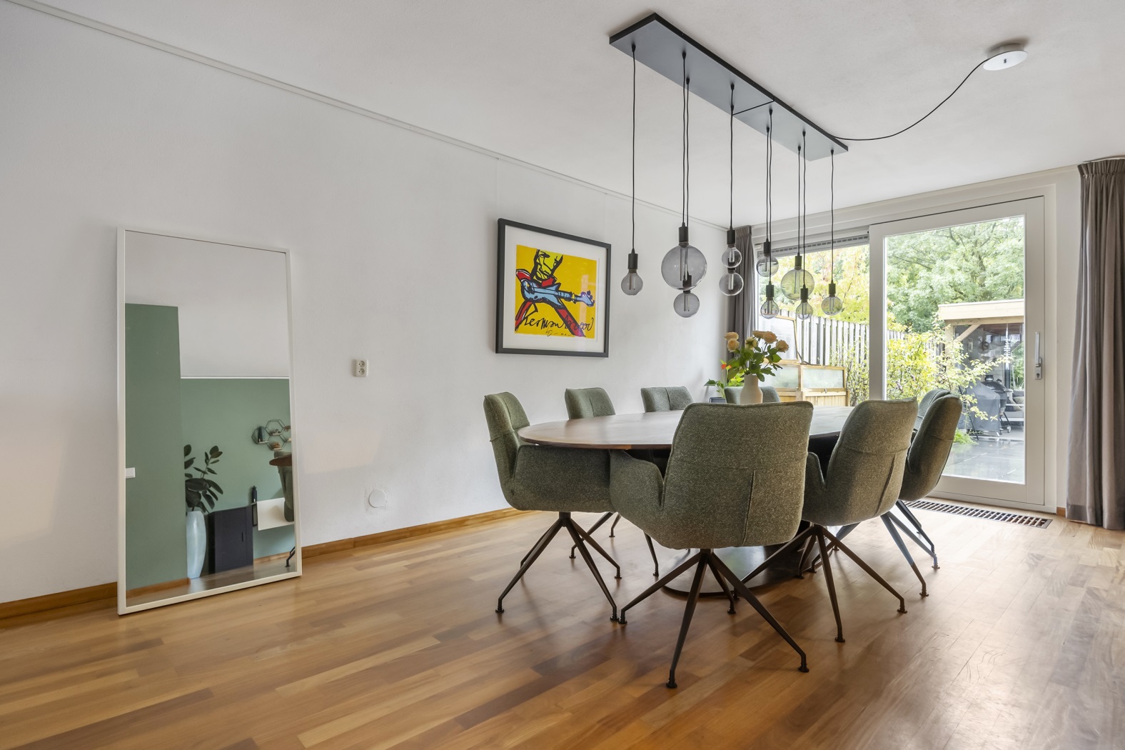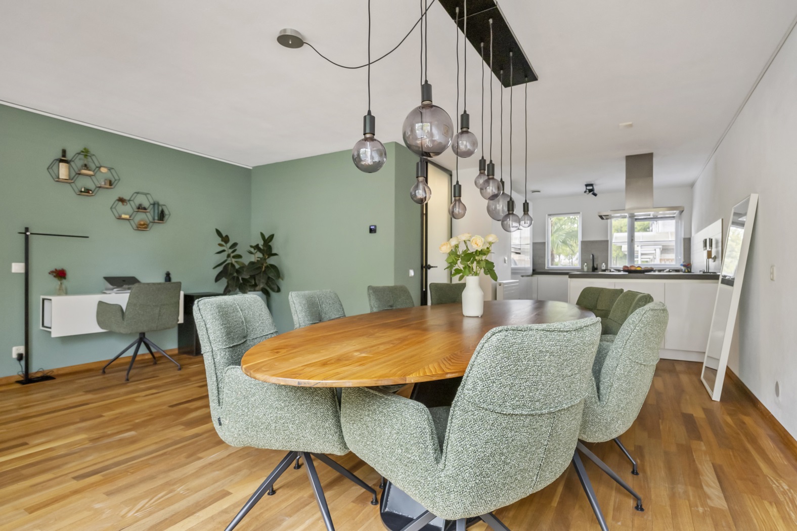 Aan de tuinkant is er ruim voldoende plaats voor een grote eettafel, precies bij de schuifpui, zodat je tijdens het eten geniet van het groene uitzicht op de tuin en de waterpartij. De houten vloer zorgt voor warmte en een huiselijke sfeer.