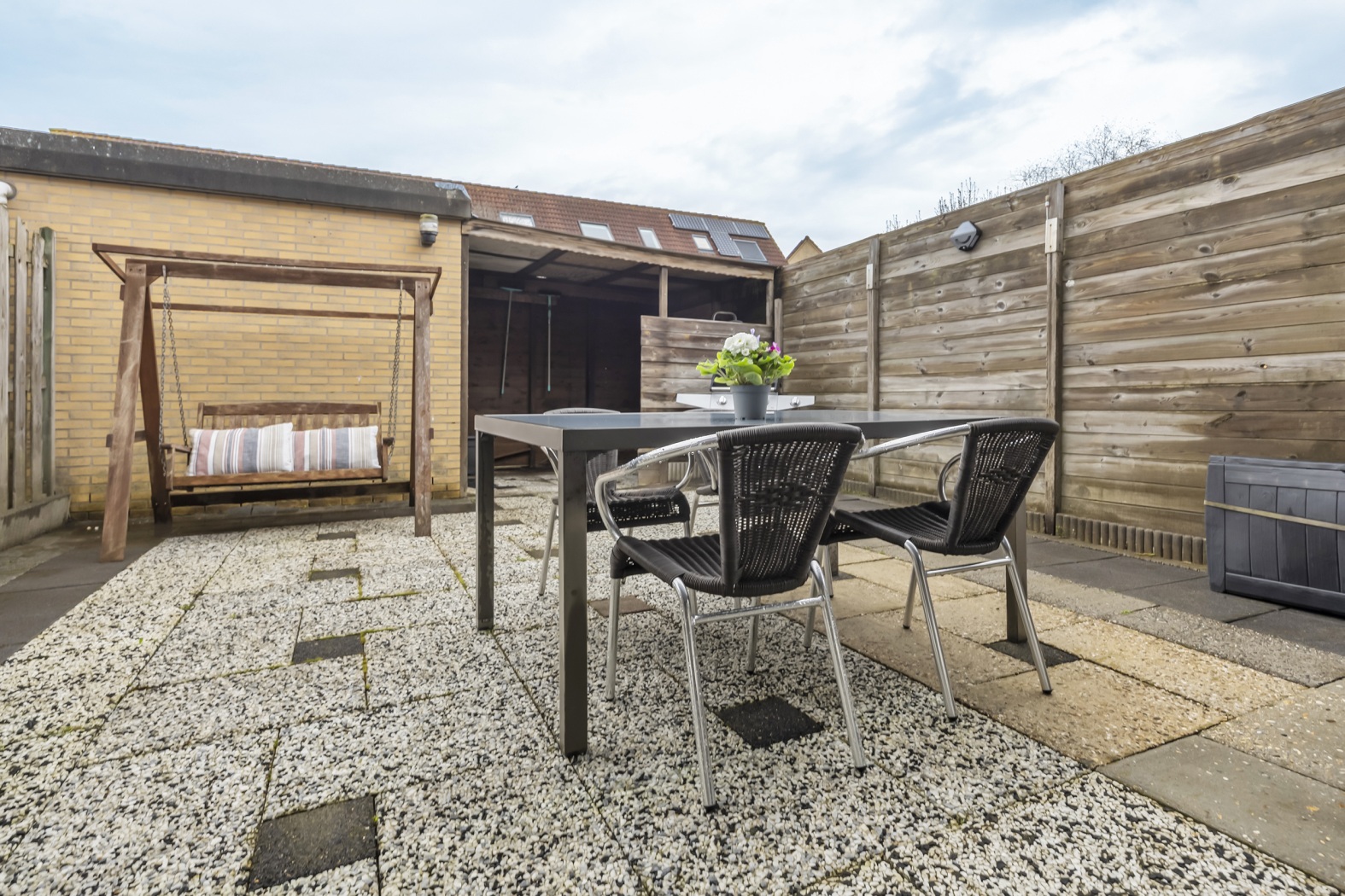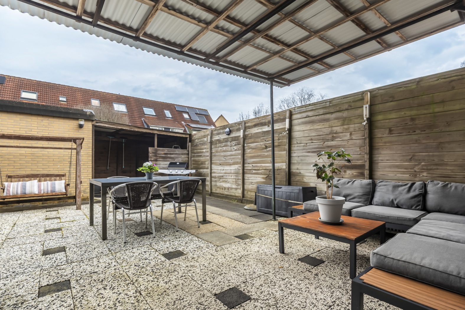De achtertuin biedt voldoende ruimte voor een comfortabele lounge- of zithoek waar je kunt genieten van de middag- en avondzon. Achterin de tuin staat een stenen berging, ideaal voor het stallen van fietsen en extra opslag.